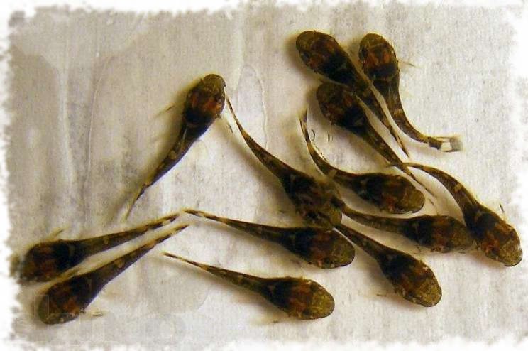 Вылупившиеся личинки висят и фактические не шевелятся. Кормятся они в этот период самостоятельно, запасами желточного пузыря, по истощению которого личинки превращаются мальков и с этого периода их необходимо кормить. Кормят аквариумисты мальков по-разному, кто дает спирулину, кто толчет фирменные лорикариевые таблетки, кто сразу начинает давать толченые огурцы. Главное в этом вопросе – мелкая фракция корма (пыль) и доступ молоди к ней. Смотрите также анциструс разведение - Форум аквариумистов.