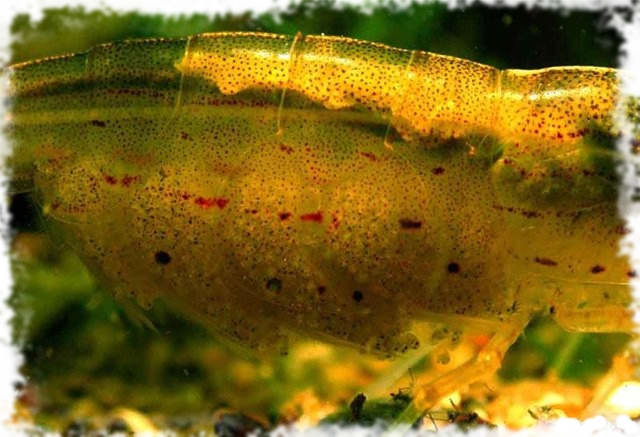 Окрас креветок меняется в зависимости от рациона питания от прозрачно-зеленоватого до прозрачно-красноватого. По бокам туловища разбросаны темные точки и пунктиры около 1 мм. Интересно, что на тельце самцов – только точки, а самочки украшены и точками, и черточками.