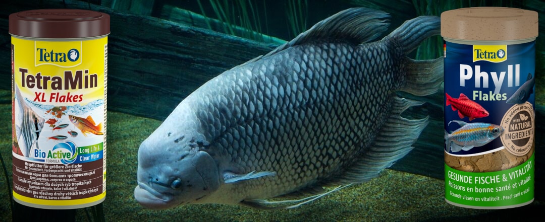 Проще всего использовать качественные сухие корма. Для молодежи отлично подойдут чипсы хлопья TetraMin. Так как рыбки любят зелень, балуйте их Tetra Phyll. Взрослым особям нужны крупные куски, поэтому обратите внимание на серию TetraMin XL (хлопья, гранулы или чипсы).