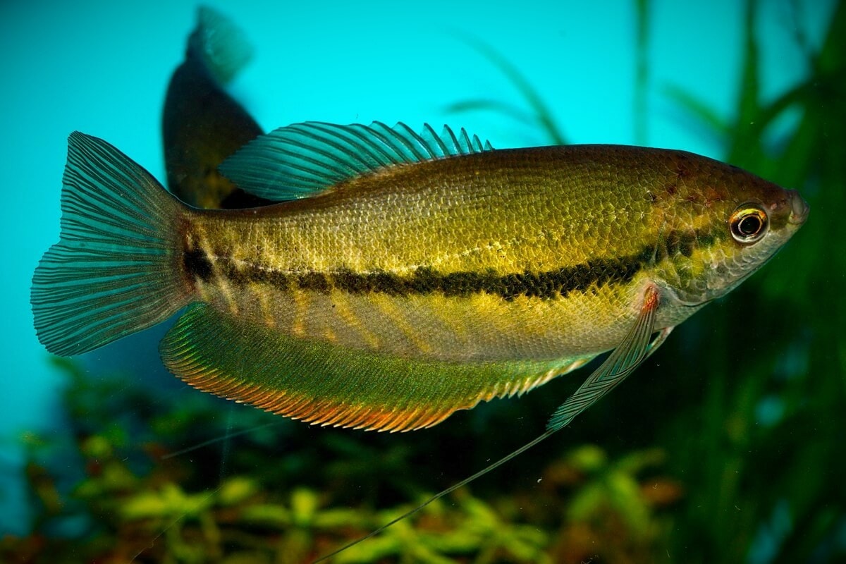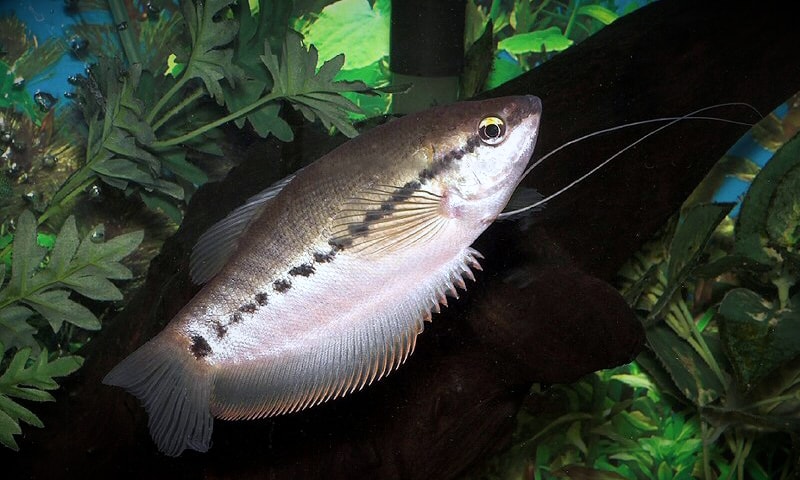 Тело у него вытянутое, сжатое с боков, с мелкими серебристо-зеленоватыми чешуйками. Через весь корпус проходит неровная темная полоса. А брюшные плавники превратились в длинные, тонкие усы-нити. Это не просто украшение, а самый настоящий орган осязания! Представь, что ты ощупываешь дорогу руками, пока идешь. Вот и гурами делает то же самое своими плавниками, исследуя дно и растения.