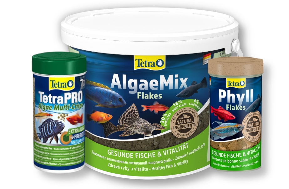 Чипсы TetraPRO Algae Multi-Crisps, гранулы Tetra Phyll, хлопья Tetra Algae Mix.