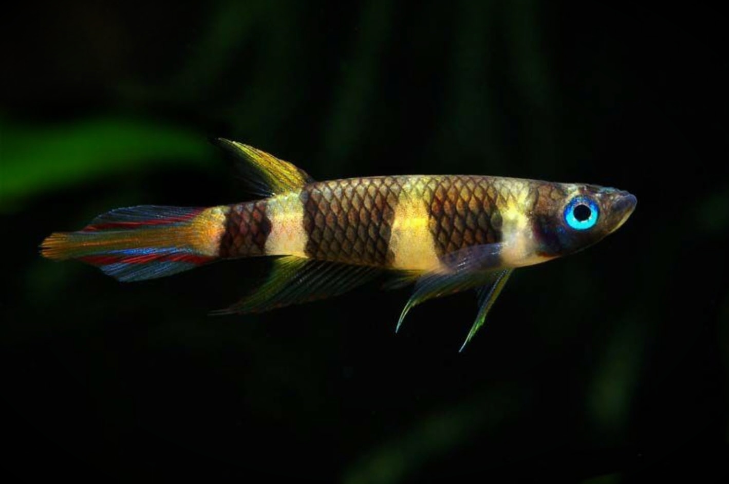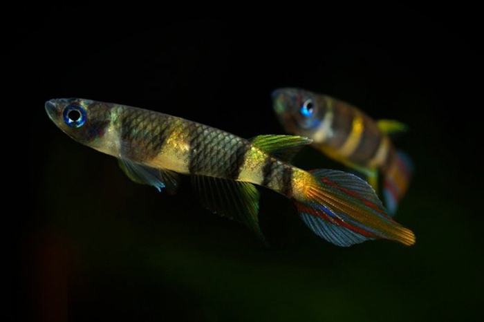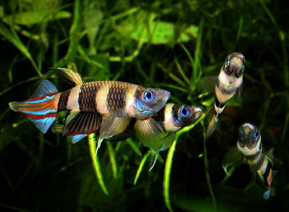 Но главная фишка — это хвост! Спинной плавник у эпиплатиса сдвинут назад, а средние лучи хвостового плавника вытянуты, из-за чего он напоминает язычок пламени или горящий факел. Отсюда и название. Что касается окраса: по кремовому телу проходят четыре широкие темные полосы (настоящий тельняшка!), а хвост самца переливается ярко-голубым с красными вкраплениями. Глазки тоже с голубизной — настоящий маскарад! Кстати, в зависимости от того, в какой африканской речке родились родители рыбки, её цвета могут немного отличаться. Этакая эксклюзивная модель.