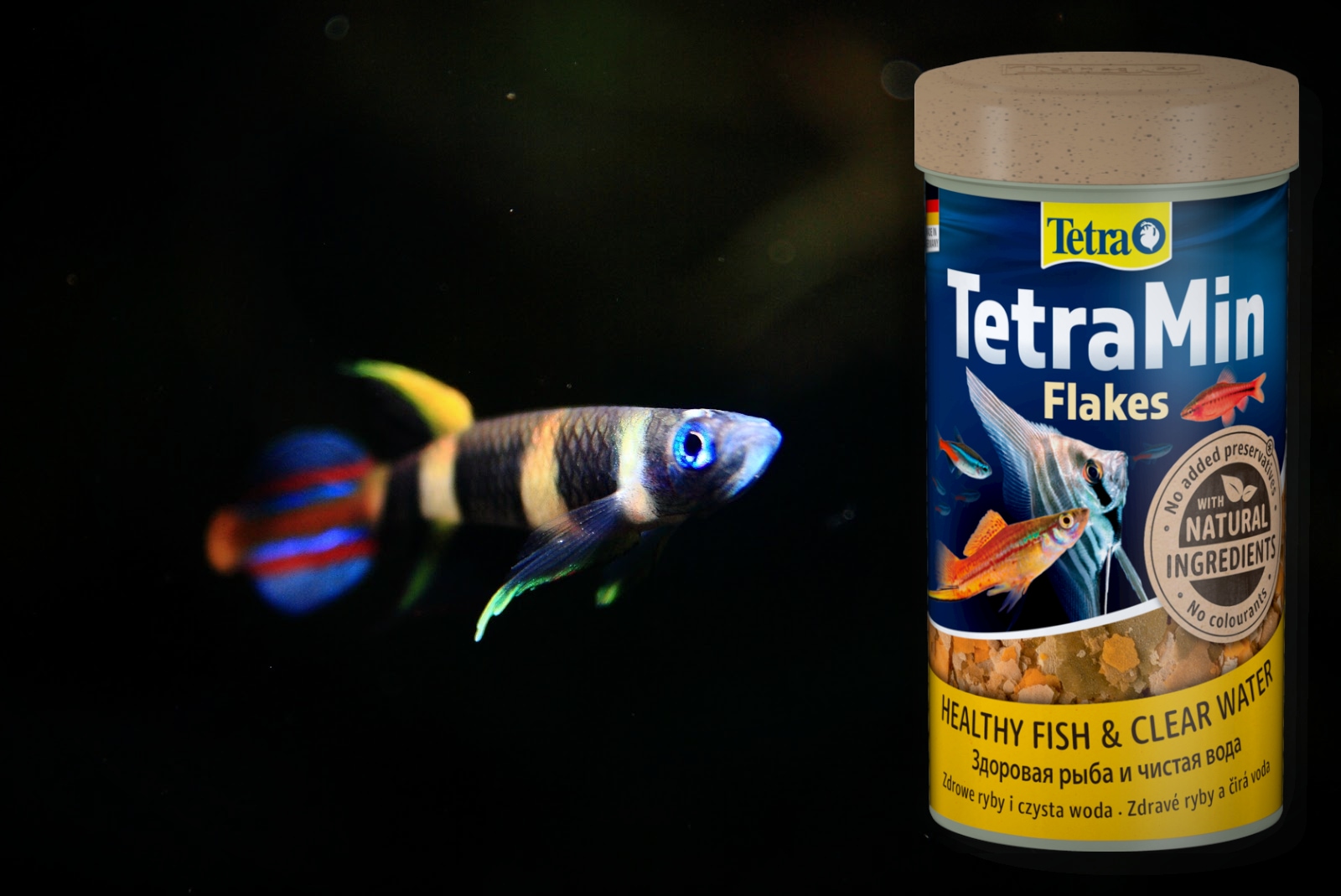 Дома лучшим выбором станут качественные сухие корма. Идеально подойдет TetraMin Flakes - классические хлопья из 40+ полезных ингредиентов. Они долго держатся на плаву, так что рыбки успеют наесться досыта.
