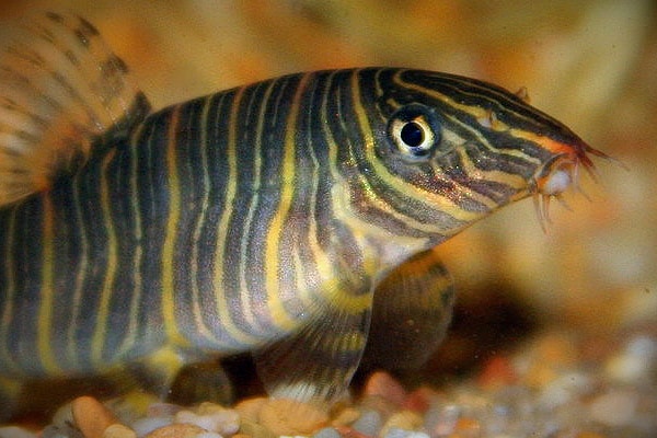 Окрас — её гордость. Тело разрисовано поперечными полосками, которые чередуются от желтоватого до серо-коричневого. А на кончике головы часто красуется рыжее пятнышко. Новички часто пугаются, думая, что рыбка поранилась, копаясь в грунте. Нет, это просто такой макияж!