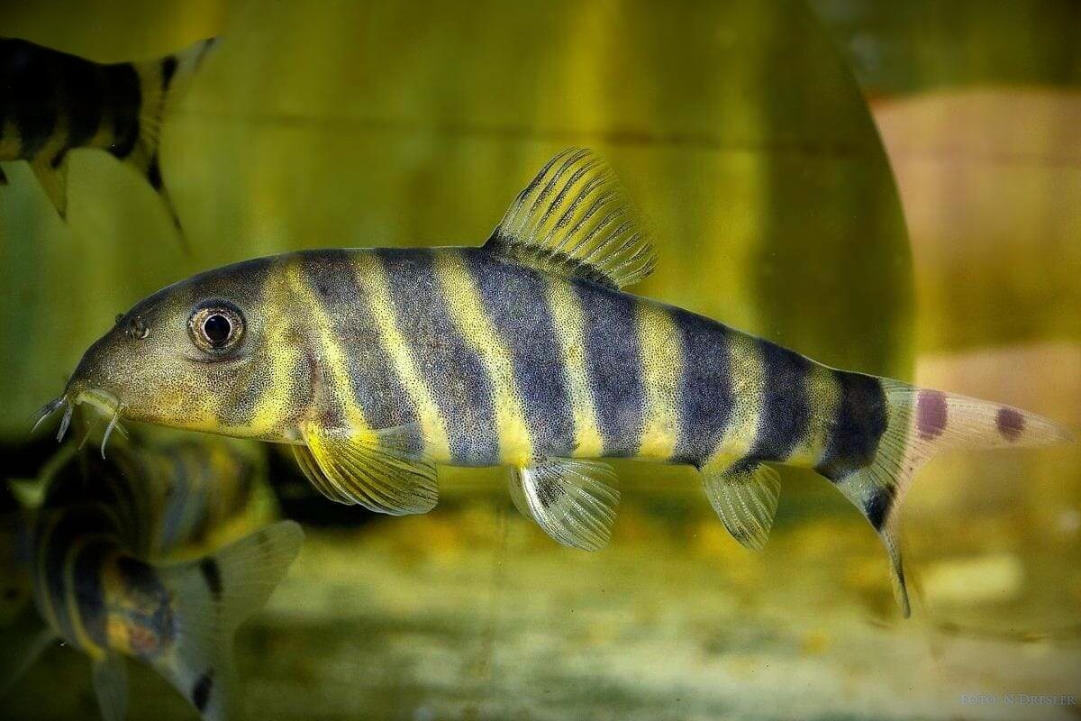 Боция дарио (она же бенгальский голец - Botia dario) — это пресноводная рыбка, прибывшая к нам из живописных рек Южной Азии. Представьте себе вытянутую торпеду (длиной до 12-13 см) золотистого цвета, которую словно художник разрисовал семью черными полосками. Глазки-бусинки, четыре пары усиков у рта — ну чем не милый исследователь?
