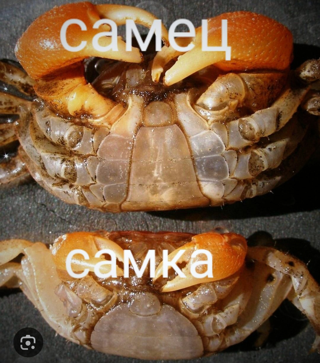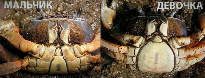 Как отличить мальчика от девочки? Берем краба, аккуратно переворачиваем и смотрим на брюшко (абдомен). У самцов оно узкое, у самок — широкое, полукруглое. Под ним она и носит икру.