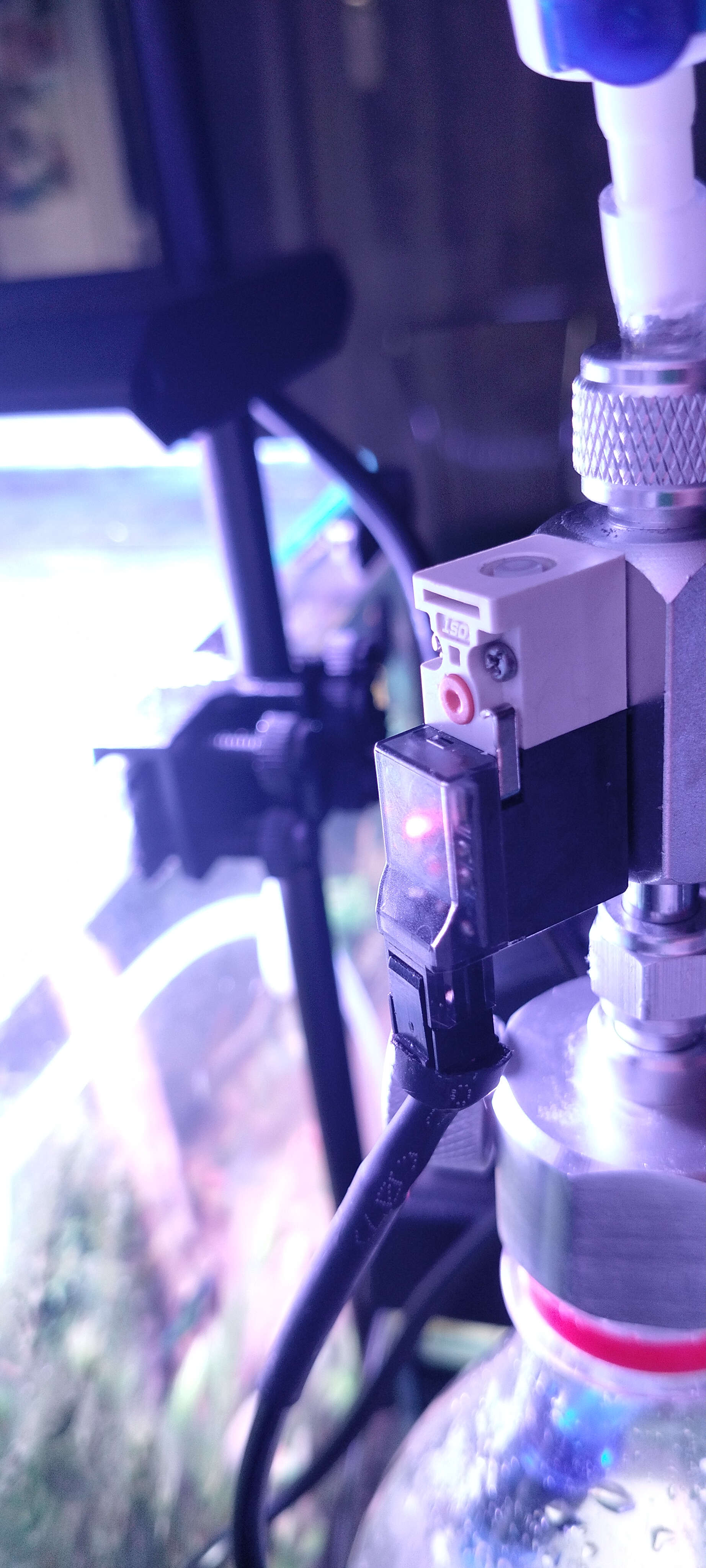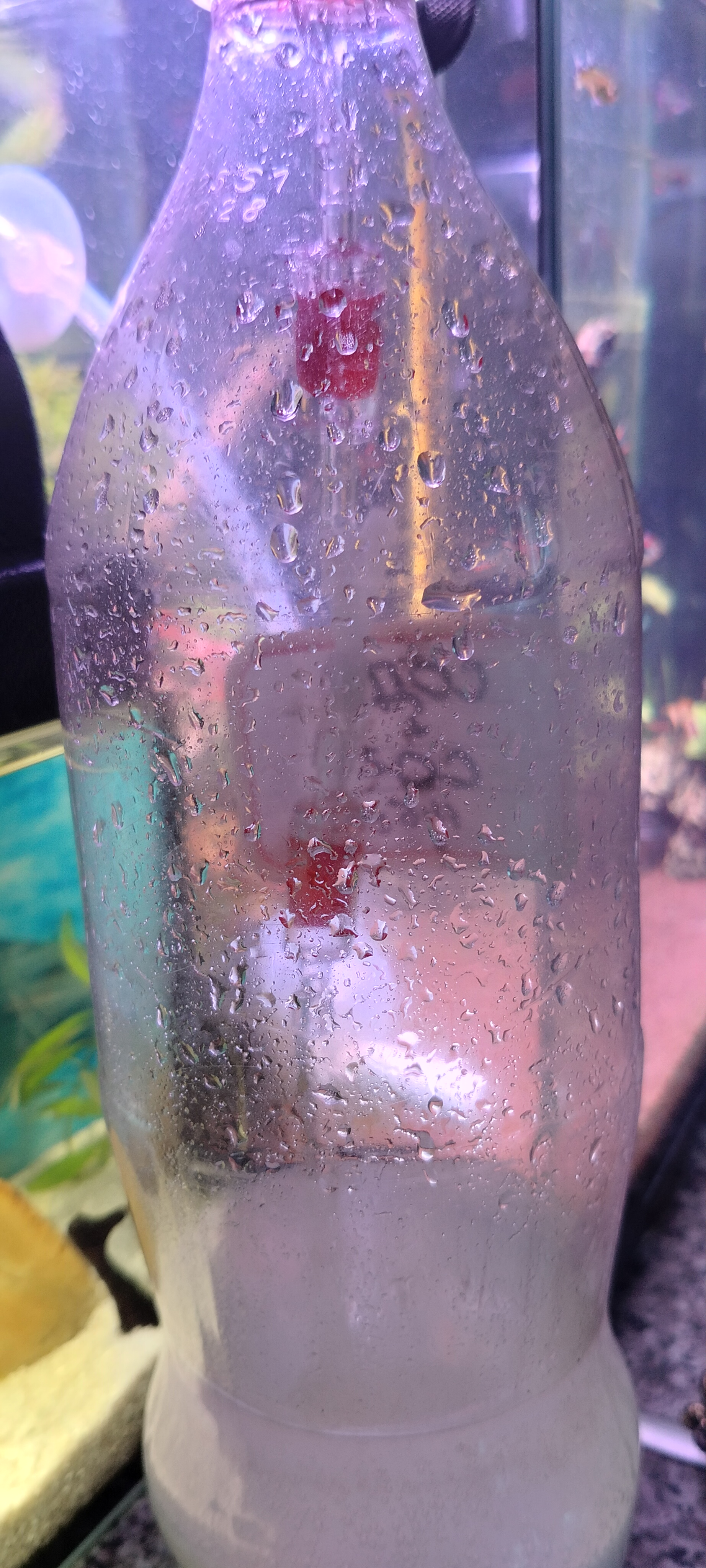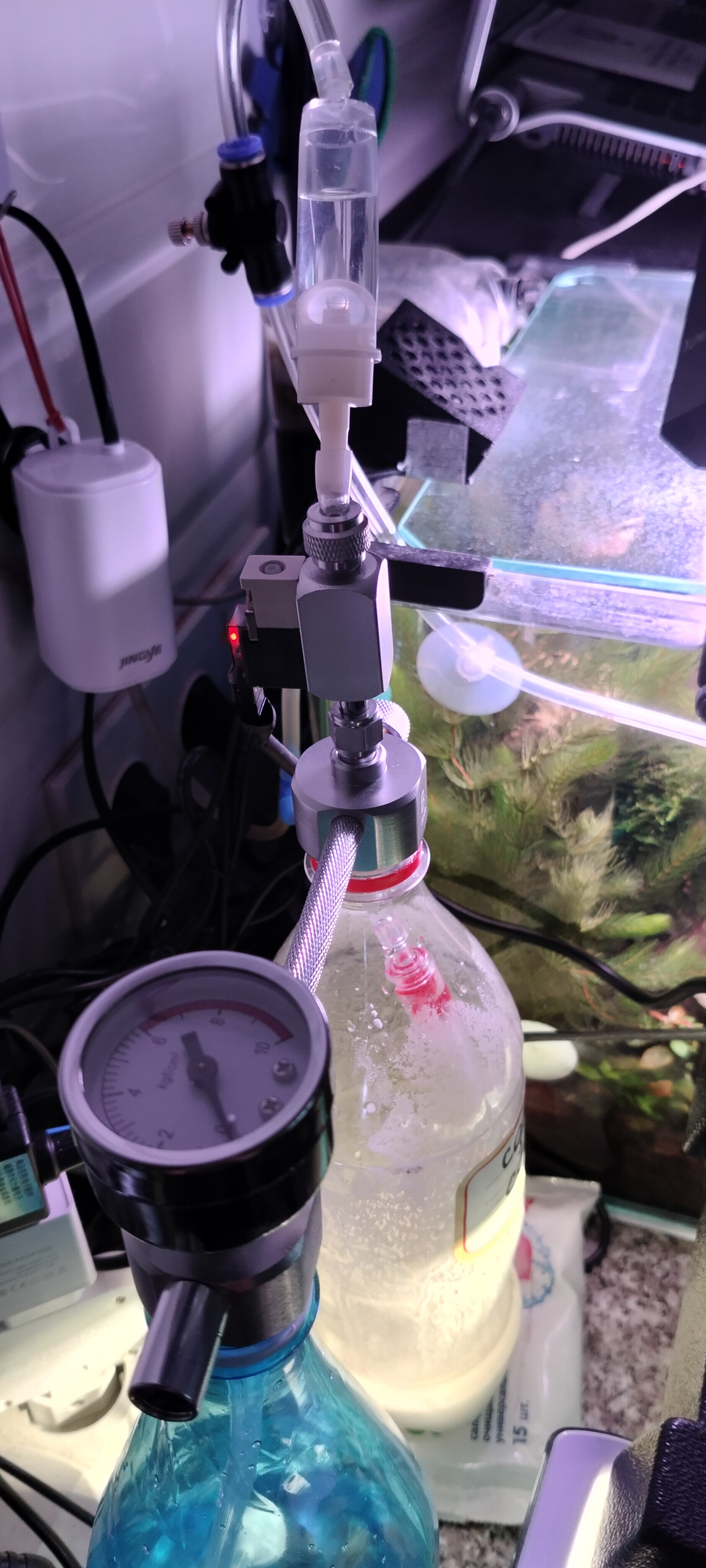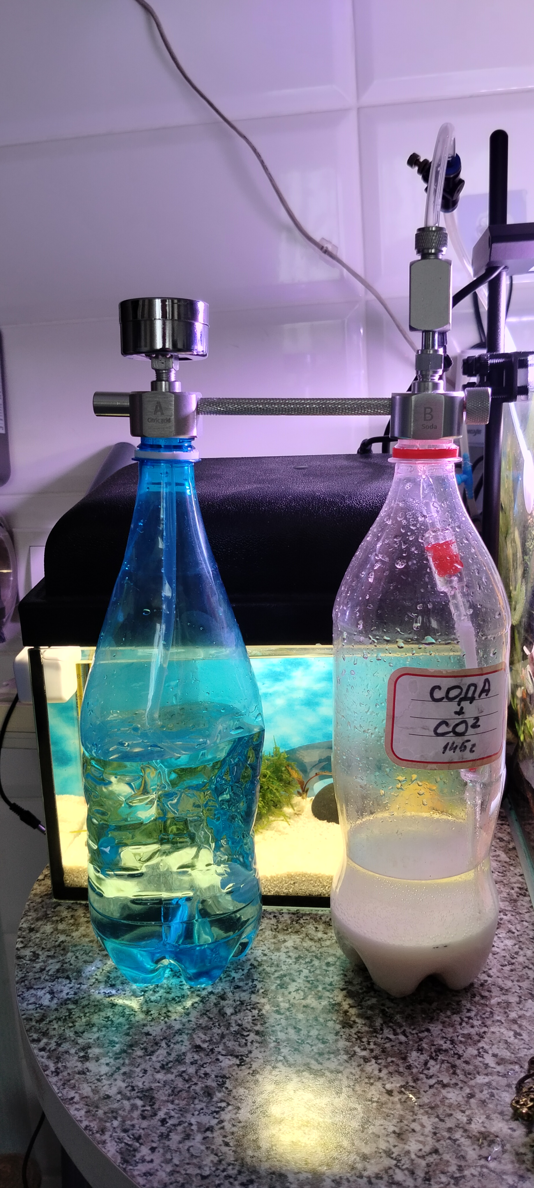 Засыпала ингредиенты. Закрутила бутылки. Сжимаю бутылку с кислотой, она поступает в бутылку с содой. Происходит реакция. Открываю вентель. Газ из бутылки с содой в бутылку с кислотой обратно не поступает. В аквариум идет.Сейчас сняла счетчик пузырьков и так вижу сколько поступает(подозрение что травил).