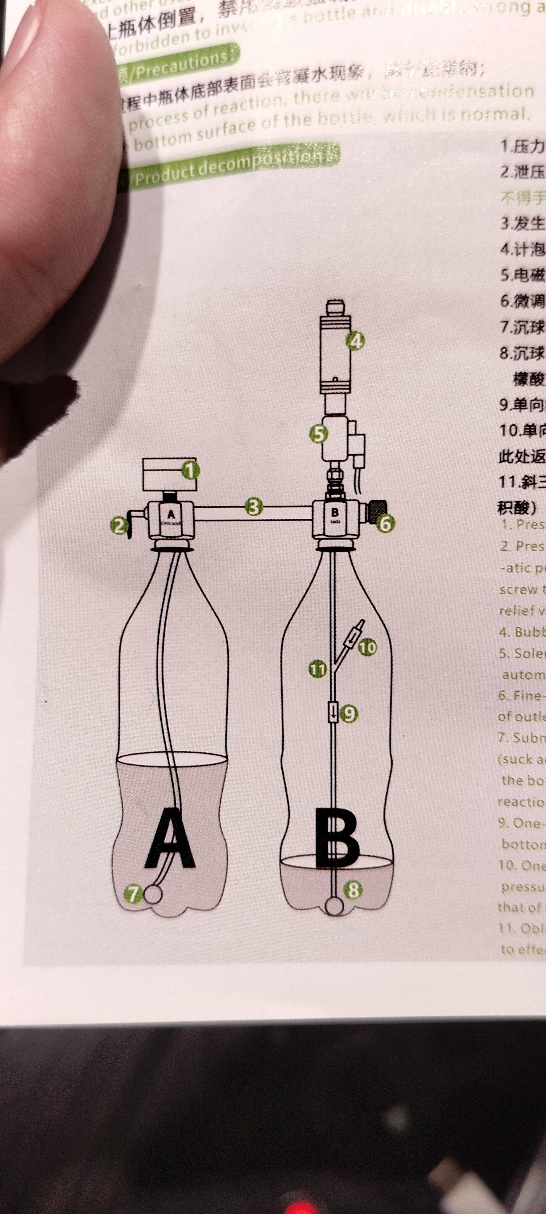 @Юлия93 Мне надо бежать, поэтому напишу как должно быть. Добавили в бутылки ингредиенты. Надавили на бутылку А, кислота пошла в бутылку Б, началась реакция, газ из бутылки Б пошел в бутылку А (пузыри из трубки в кислоте). Смотрим на манометр, обычно с первого раза рабочее давление не возникает. Откручиваем вентиль подачи газа и стравливаем газ из бутылки Б пока кислота вновь не начнет перетекать в Б. Пошла реакция (кислота потекла обратно в А и в А из трубки пошли пузыри), закрыли вентиль, смотрим на давление, если оно низкое повторяем несколько раз. Если что-то не так ,при условии правильной сборки, надо проверить сначала герметичность с помощь мыльного раствора, а затем проходимость всех соединений (как это сделать я не знаю)