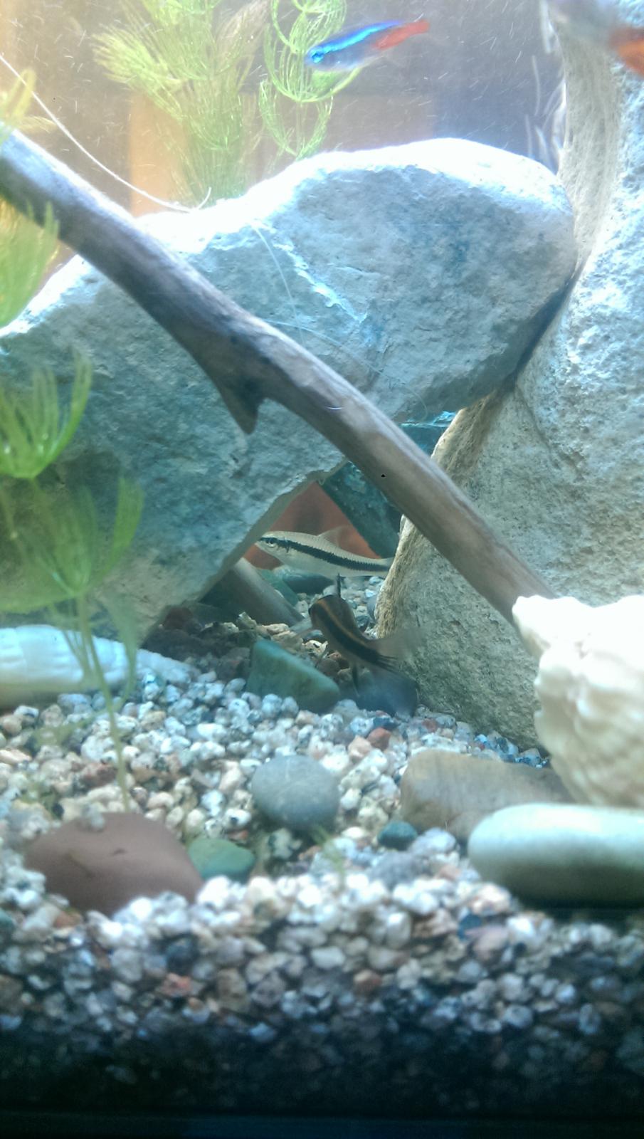 Всем форумчанам здравствуйте!)) Прошу прощения за долгое отсутствие, работа-работа... С аквариумом все вроде бы нормально. За время отсутствия произошли некоторые изменения: 1) наконец-то высадил растения) Один из них роголистник, какая-то елочка как мне сказали и еще какой-то кустик (подскажите название). Несколько раз пришлось состригать, разрастаются быстро. 2) Знакомые принесли в подарок рыбок, двух водорослеедов, двух неонов обыкновенных и двух маленьких скалярий. Последних боялся заселять, но заселил. В итоге не знаю почему, может от шока, страха или испуга перед скаляриями, но гуппи на второй день склеили ласты. Сначала прятались под камнем, не высовывались вообще. Неоны спокойно к скаляриям относятся, САЕ иногда гоняют скалярок, живут вроде дружно. Правда частенько замечаю что скалярки пристают к улиткам. 2) заменил корягу, фото ниже будет...3) по совету Jekssone смастерил самопальную флейту, т.к. поток из фильтра был сильный, рыбок сносило, растения сильно раскачивало...4) сделал частичный тест воды у знакомых: ph-7,6, kh-15, gh-8. на нитрит/нитрат тестов не оказалось. В магазине случайно наткнулся на tetra nitrate minus. Кстати в зоомагазине видел в продаже тесты от тетра, большая коробка, стоит рублями 4000) От их полосочных тестов отказался из-за большого количества критики. Думаю лучше купить капельные тесты Нилпа. Сестренка в Москве учится, была в нескольких зоомагазинах, нет в продаже( Может кто-нибудь знает где тесты Нилпа 100% есть? 5) Боролся с водорослями :wacko: На стенках появился зеленый налет, улитки пытались очистить, но слишком медленно. Стенки очистил пластиковой визиткой, больше их не наблюдаю. Также появлялись бурые водоросли, от них тоже избавился. На камнях и коряге никаких налетов пока не было. 6) 01.12 впервые после запуска сифоном очистил грунт, заменил 30% воды, промыл в слитой с аквариума воде губку фильтра. Водичка прозрачная, рыбки резвятся, вроде бы все нормально. Единственное напрягает отсутствие тестов на no2/no3. Если есть какие-либо замечания, напишите пжл.