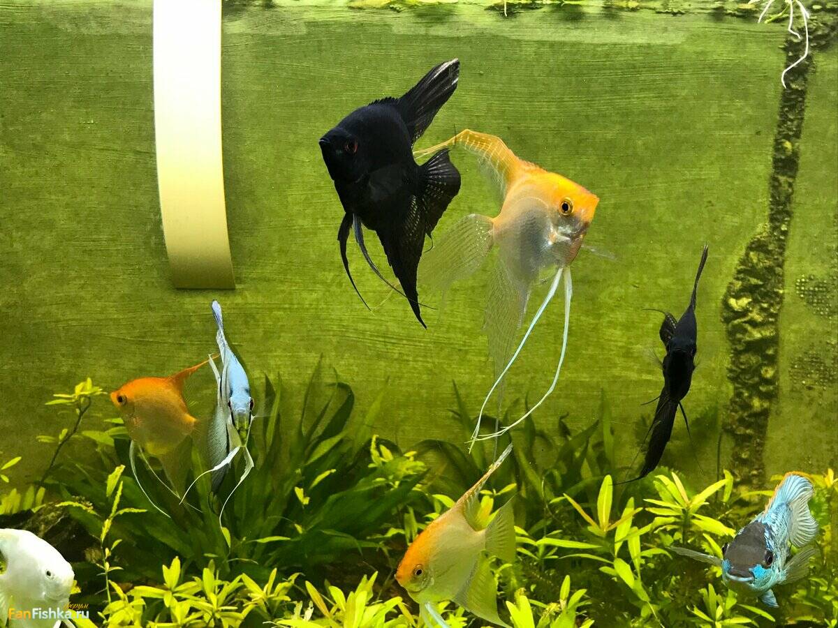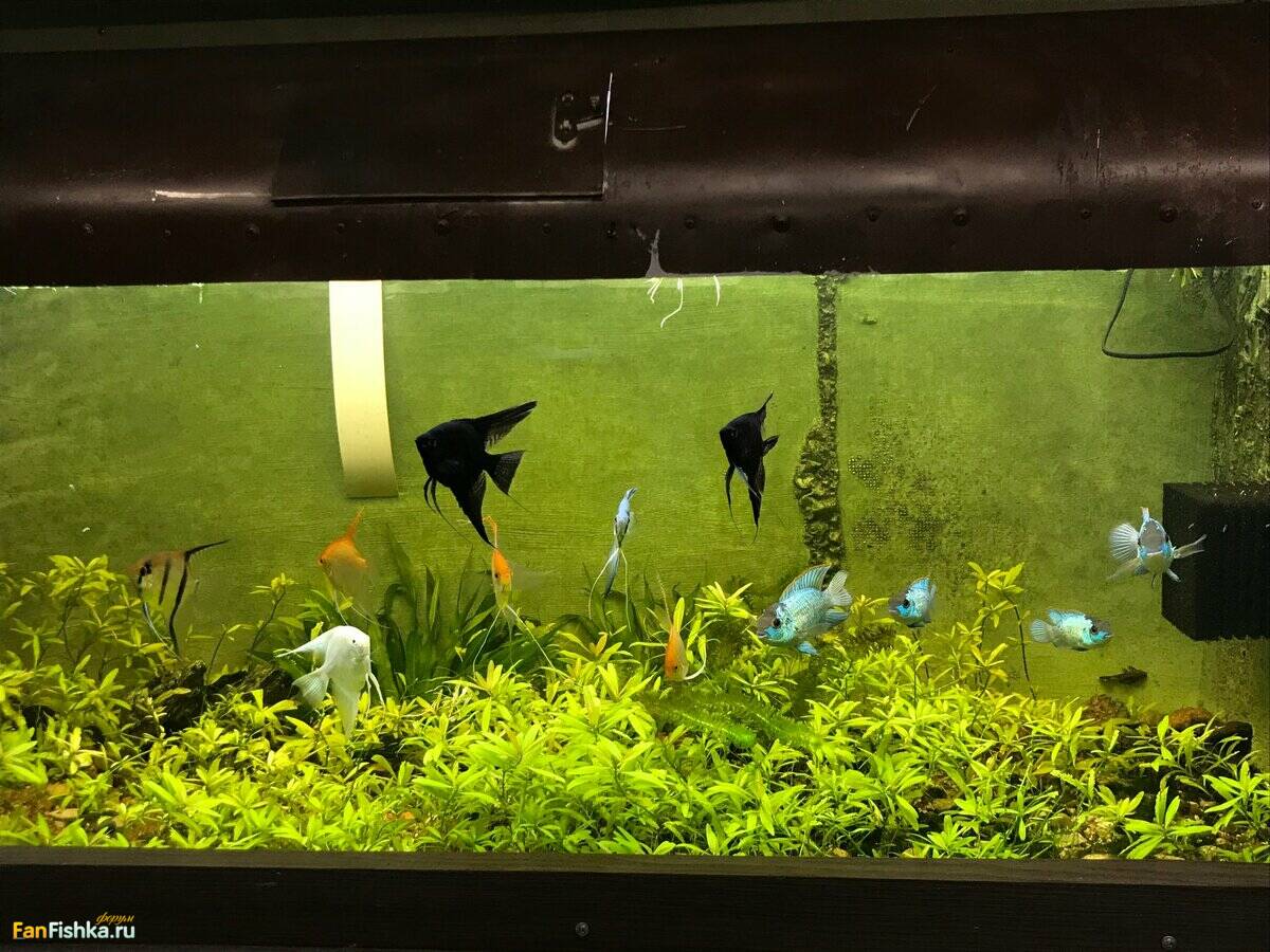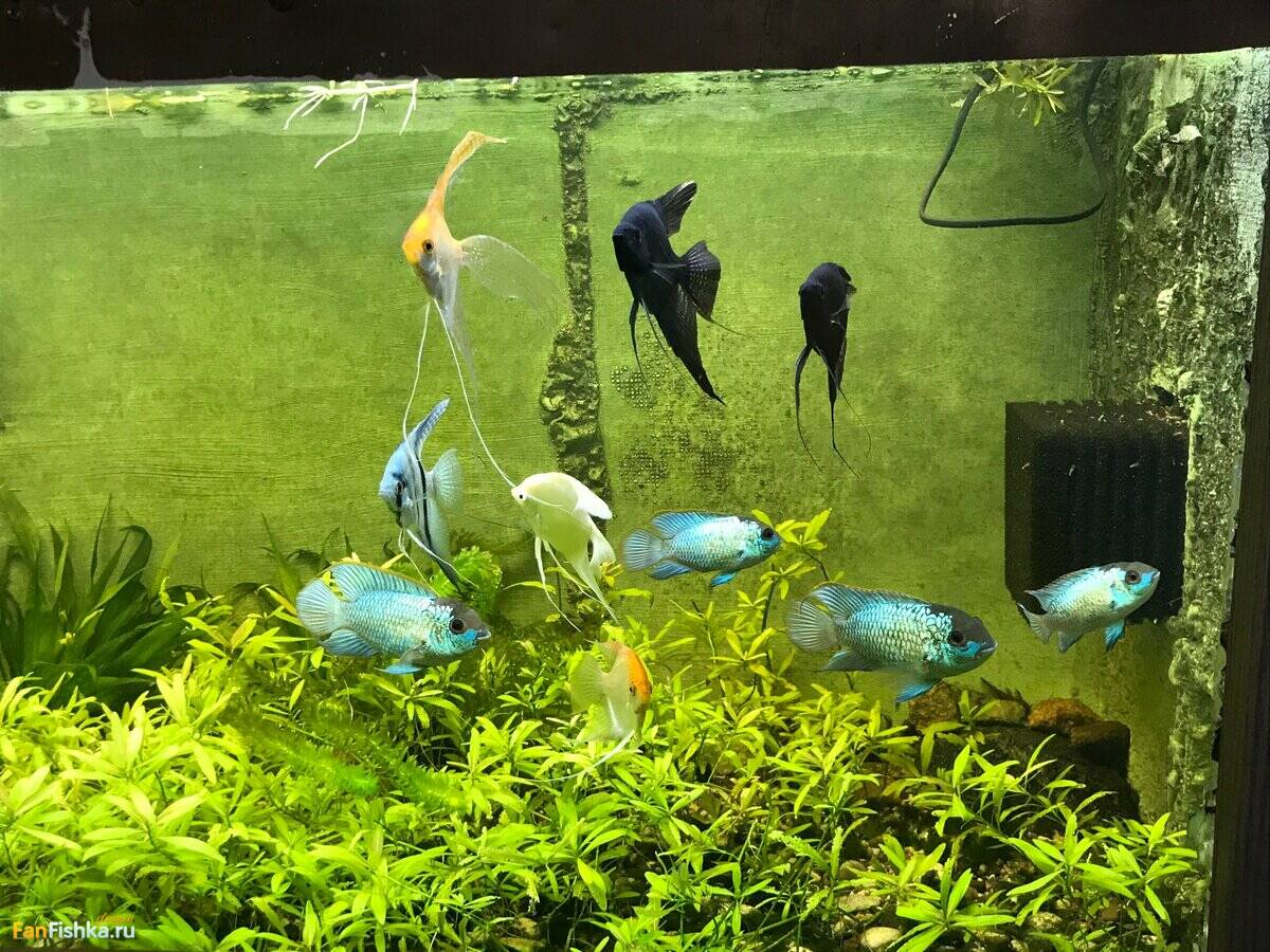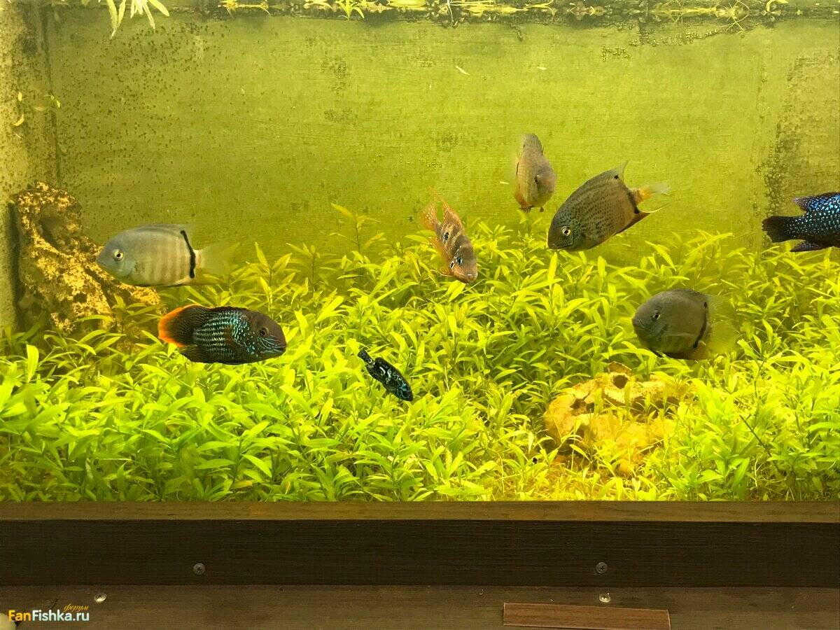 Все рыбки живы и здоровы. Сейчас 3 выводка гуляют по большим аквариумам. Так было за 2 месяца уже раз 10, но выжить удалось только пельвикам в 200 литрах (они постоянно выводят и выращивают мальков по 3-5 штук с каждого выводка) и бирюзовым акарам в 860 литрах. Там сейчас осталось  штук 12-15 уже подростков по 2,5 месяца и по 2  см. (без хвоста). Они уже никого не боятся и плавают везде. Это уже достаточно крупные рыбки, но по сравнению с 16 см. папашей совсем крошки.
