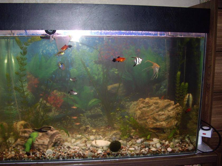 В моём аквариуме примерно 130л воды. (весь объем 150). Живут (пока маленькие (самая большая рыбка 5 см) :сиамский водорослеед - 4шт, гиринохейлус золотой -1шт, орнатус черный фантом -4шт, данио рерио розовый -4шт, птеригоплихт оранж.мрамор- 2шт, боция клоун-1шт, скаляр зебра-1шт, скаляр голд вуаль - 1шт., пецилия редиска - 5 шт, рамирези бабочка -4 шт.