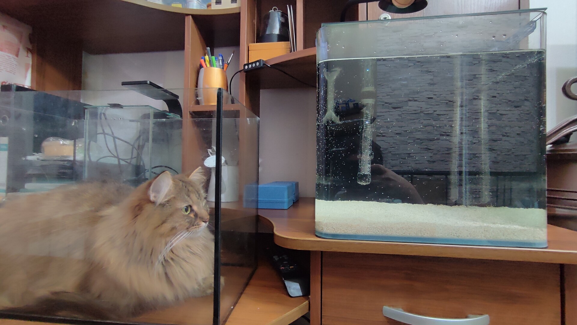 AnaAna 5505 Жалоба Опубликовано Saturday в 20:09 В общем без приключений я не могу, с такими танцами и бубнами я ещё ни одну банку не запускала В прошлую субботу сделал мне муж всю проводку, повесили на УПС розетки для моря, всё отлично. Подумала, что надо подсоединить всю обвеску на банку, чтобы к концу недели просто засыпать грунт, залить воды и засолить. Сделала. Смотрела-смотрела, и вдруг к ночи меня осенило, что всё-таки кусочек шланга за задней стенкой меня раздражает и надо бы фон всё-таки. Раздобыла остатки оракала от большого акваса, вроде лучше, но не то... Хотелось какой-то воздушности, но упорно бесил видимый кусок шланга, хоть и размытый за оракалом. Плюнула, пошла заказывать непрозрачную плёнку, но не смогла выбрать между тёмно-синим и черным, заказала обе В воскресенье забрала обе плёнки, примерили дома, темно-синяя что-то не зашла, в итоге уже почти в ночи приклеили чёрный глянец. Неожиданно понравилось, хотя я была уверена, что черный фон мне уже надоел ещё со старых 75 литров, да и у кардиналов он же. Но нет, хорошо. Вроде бы пора успокоиться. Ага, не про меня Через пару дней, когда плёнка высохла и ушли все разводы, навесила обратно трубки, хотела уже запустить, но устала и решила, что завтра. Завтра наступило (среда уже, если что). И вдруг на работе меня торкнуло, что в этом сансановском внешнике во-первых невозможно перекрыть полностью воду (на выходе нет запорного крана), а во-вторых т.к. помпа намертво всобачена в корпус снизу, то просто отсоединить ведро и прополоскать при надобности грозит превратиться в тот ещё квест. А значит надо поставить запорный кран после помпы. Но почему-то все краны обещали доставить в лучшем случае недели через две, либо доставка 2-3 дня, но ценник при этом равен ценнику самого сансана😂. Зато вот барбус обещают привезти завтра и цена прям отличная - каких-то 3 тысячи всего. Ну значит будет барбус 101. И главное, ещё же подумала, что сразу надо переходные штуцеры, потому что у барбуса шланги 16/22, а у меня шланги и трубки 12/16 . Подумать подумала, но отвлеклась на работу и забыла. Вспомнила вчера вечером, когда мне сказали, что мои камни в воскресенье или максимум в понедельник будут в Питере. Сегодня утром муж погнал в магазин за штуцерами, а я засыпала грунт и начала набирать осмос. С двумя не особо долгими перерывами набрала. Цельных штуцеров как назло не было, только на гайках. Собрали всё, и один, собака, капает. Хорошо, прокладок дома целый воз, с помощью их и матов победили наконец-то) Вывод - дурная голова покоя не даёт не только рукам, но ещё и кошельку, и мужу😁 Сансан решила оставить себе, хотя ещё можно было вернуть. Закажу потом двойной запорный кран разъёмный, доведу до ума, авось пригодится когда-нибудь))) Барбус набила тетровскими шариками. Он, как ни странно, оказался единственным фильтром на моей памяти, который запустился без всякого гемора с полпинка. Кстати, прогнала его на холостую. Заявлено 650л/ч, прокачал при этом 678. Неплохо. Единственное, что испортило впечатление - не тихий, гудит. Но т.к. там никто не спит, то пофиг. Муж днём там валялся телек смотрел, очень удивился, когда я сказала, что фильтр громкий, он его не слышит с дивана. Ну и хрен с ним, пускай гудит, тем более что слышно его действительно только если присесть возле него под столом. Зато ведро спокойно отстёгивается. Пока вроде устраивает, посмотрим. Вот т