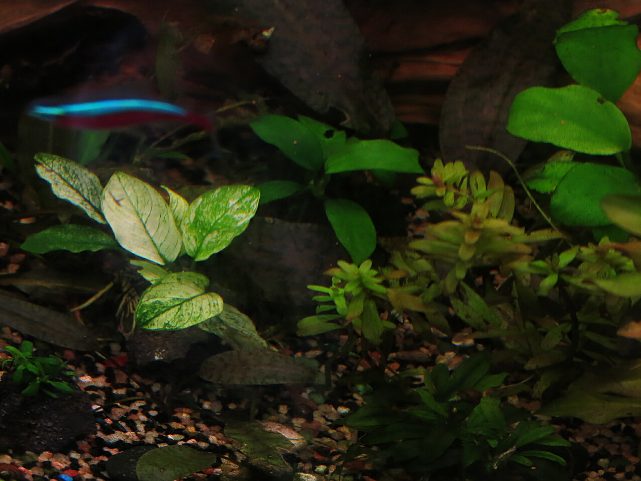 Камень 2793 Жалоба Опубликовано 16 сентября Продолжение истории про Anubias barteri var. nana "Pinto" . Начало немного выше. Значит жили-не тужили у меня в кубиках Анубиасы Пинто в воде с кН 8, рН 8 и под посредственным смешанным люминисцентно-светодиодным освещением полностью зеленые, без вариегации, как обычные Анубиасы нано. Продолжение я задержал потому, что углубился в историю тех лет, просматривая редкие записи и фотографии. И выяснил/вспомнил, что небольшие отдельные элементы вариегации все-таки периодически появлялись на отдельных листьях, но не закреплялись. Весной 2023 года я поставил светильники Chihiros A 311, стал вносить удобрения Микро и Калий, а в одном кубике даже начал подавать СО2 (рН снизил до 7,5), но на Анубиасы Пинто это существенно не повлияло, на паре кустов появилась незначительная вариегация, опять же нестабильная. Вот фото одного из них, ноябрь 2023: - Существенно изменилась ситуация, когда в начале 2024 я осмосом опустил кН до 4-5. В аквариуме с СО2 проснулось сразу несколько Анубиасов Пинто. Вариегация была еще не сильная, но почти стабильная. На самой первой фотографии этого дневника видите Анубиасы Пинто? Нет? А они есть! Приблизил фрагмент (март 2024): - А полноценная жизнь у Пинто началась после того, как я записался на Фанфишку, наслушался тут про Рэдфилда, сделал тесты на нитрат-фосфат и начал вносить Макро удобрения (апрель2024). Пинты отреагировали тотальным побелением листьев, и даже в аквариуме без СО2 проснулся спящий кустик. На фото 10 мая 2024 уже без приближения видно несколько кустов с белыми листьями: - К концу лета Пинты уже во всю вариегировали. Фото аквариума было здесь (август 2024). Покажу увеличенный фрагмент: - На протяжении всей этой истории замечал, что на улучшение условий питания (Удобрения, СО2) Пинты всегда реагировали увеличением вариегации. Но если улучшения не значительные, то вариегация со временем уменьшалась или совсем пропадала. Так было в аквариуме без СО2 (рН7,5) - анубиасы вариегировали-вариегировали, да не вывареагировали , А когда попали в СО2 (рН 7) снова завариегировали. Выше об этом расказывал и показывал. И в ходе моих эксперементов по обнулению нитратов к очередной подмене или уменьшению подачи СО2 - реагировали позеленением листьев. Свет у меня всегда на максимуме (на грани позеленения стекол), поэтому о его влиянии, извините, ничего сказать не могу. Но думаю провести в будущем эксперимент по затемнению отдельного кустика. 7 3 VALKNUT, Antik, shkush и 7 люди отреагировали на это Поделиться сообщением Ссылка на сообщение
