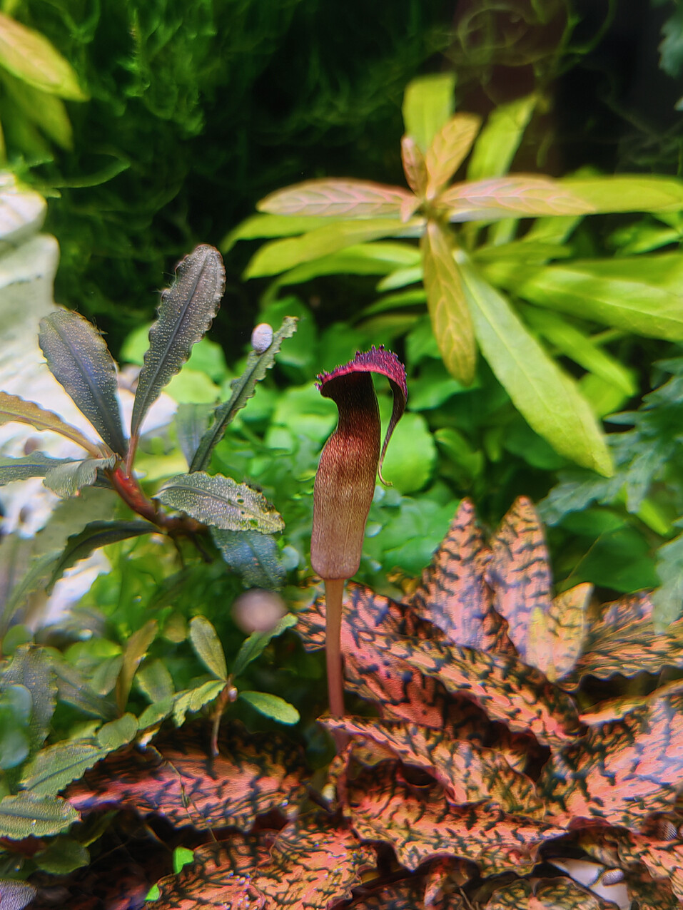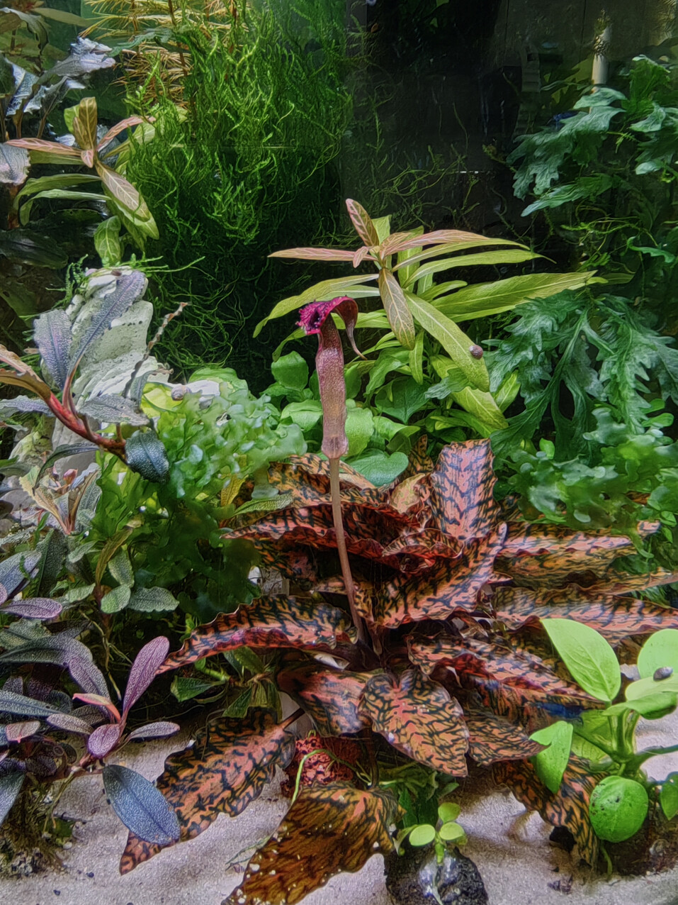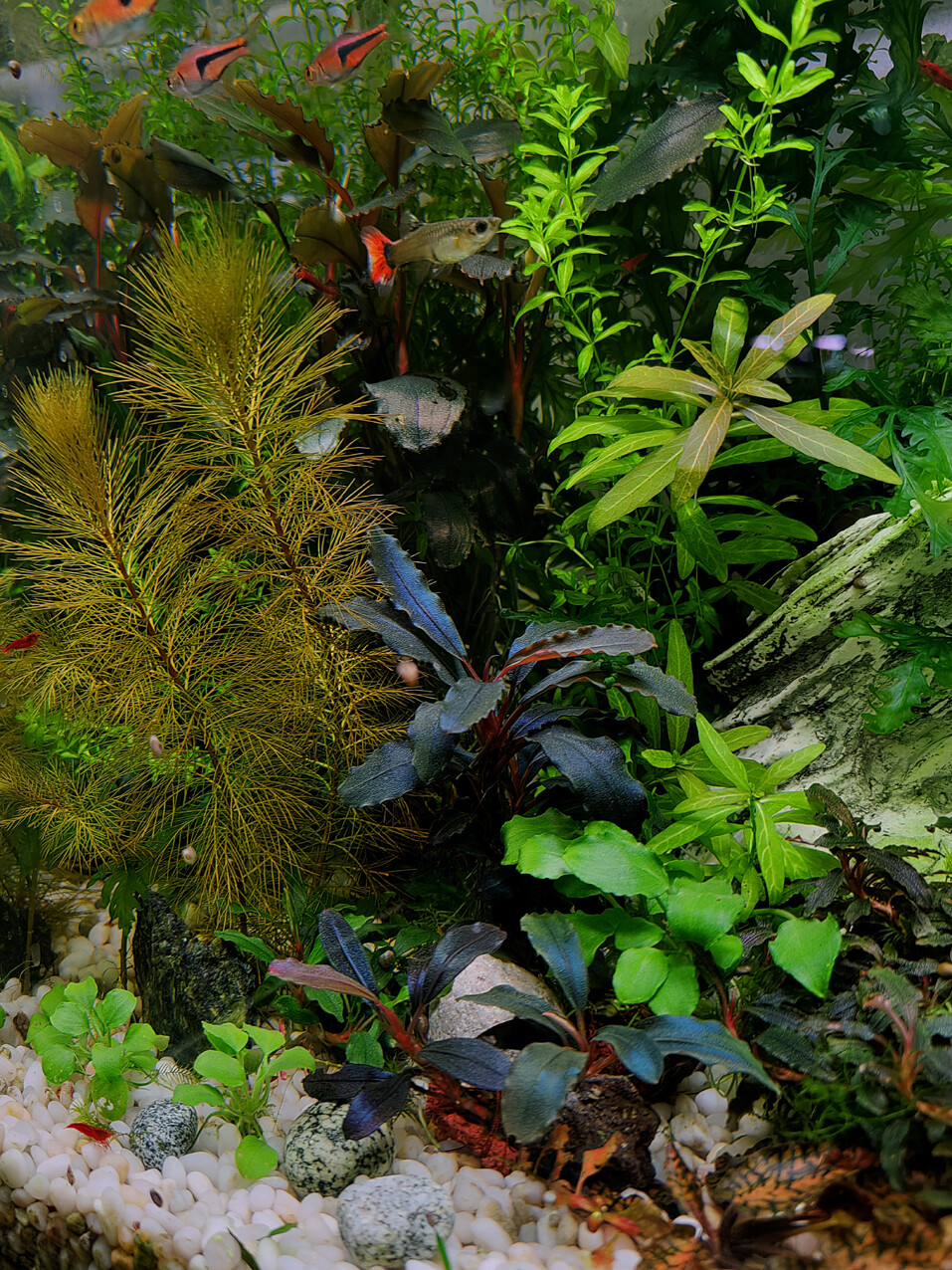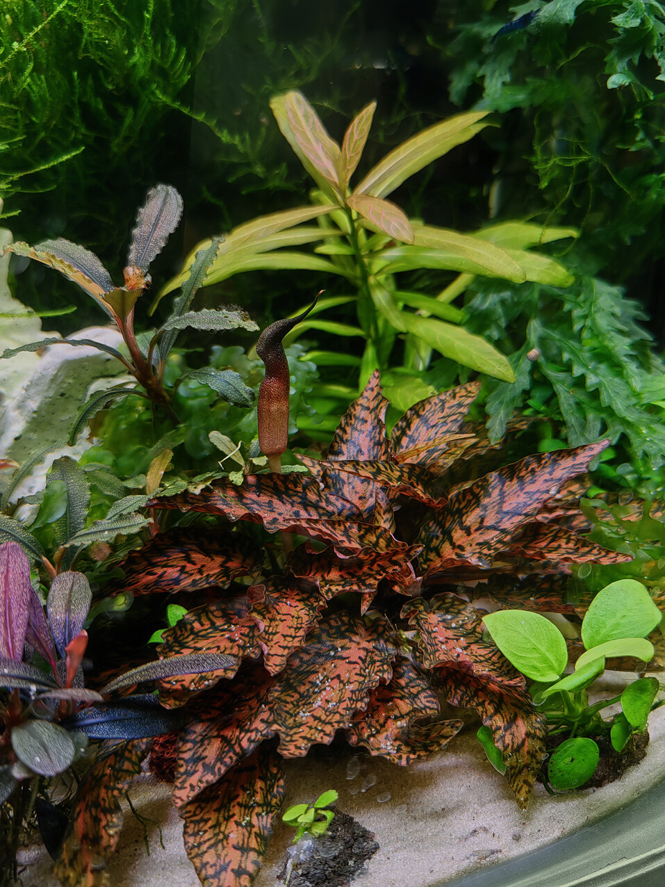 Камень 2793 Жалоба Опубликовано 11 октября Аквариум 36л/2, 38х28х37 -ДхШхВ. СО2, RGB+UV Фильтр: Sunsun LW 602B, внешний 6Вт, 400 л/час - заявленная (по факту 210 л/час) и навесной мини-самп "380" 3w. Свет: Week Aqua M300 Pro - К, 25w, 1500Lm. Режим "Red", в пике 50% мощности. Световой день с 8:30 до 13:40 и с 17:40 до 21:40. СО2: реактор на соде и лимонной кислоте, 40-50 пуз/мин, 14,5 часов. Нагреватель не использую. Компрессор не использую. Грунт: кварцевая пыль, слой 1,5-2 см. Вода: водопровод+осмос 1:3, плюс рем "Нилпа GH+" Параметры воды: kH 3-4; pH 6,7-7; gH 9-11. Температура 22-25С зимой; 24-27С летом. Удобрения: Aquabalance Premium Макро NPK, NK, PK, плюс Aquaerus Калий; Aquaerus Микро, плюс Aquaerus Железо. Витамины: Aquaerus, йодинол. Животные: Poecilia reticulata "Dumbo Red Tail" - гуппи "Дамбо красный хвост" - не много. Neocaridina davidi "Bloody Mary" - Креветка "Кровавая Мэри" - много. Caridina japonica - Креветка Амано - 4 шт. Улитки: катушки, физы, меланьи. Растения: Анубиасы: Anubias barteri var. nana "Gold", Anubias barteri var. nana "Pinto", Anubias barteri var. nana "Petite" Anubias barteri var. nana "Pangolino", Anubias barteri var. nana "Round Leaf", Anubias barteri var. glabra minima. Буцефаландры: Bucephalandra sp. "Brownie Ghost", Bucephalandra sp. "Kualakuayan-1", Bucephalandra sp. "Raven", Bucephalandra sp. "Kedagang", Bucephalandra sp. "Tumbang Kelaken", Bucephalandra sp. "Godzilla", Bucephalandra sp. "Flamingo", Bucephalandra sp. "Black Rose", Bucephalandra sp. "Super Blue Type Round", Bucephalandra sp. "Theia silver", Bucephalandra sp. "Brownie Phoenix", Bucephalandra sp. "Brownie Purple". Bucephalandra sp. неопознанная "изумрудная". Bucephalandra sp. неопознанная "желто-сине-зеленая/персиковая". Schismatoglottis roseospatha, Schismatoglottis prietoi, Длинностебельные: Hemianthus micranthemoides - Хемиантус малоцветковый, Proserpinaca palustris - Прозерпинака болотная, Myriophyllum heterophyllum - Перистолистник красностебельный, Alternanthera reineckii Rosanervig - Альтернантера розанервиг, Ludwigia palustris Super red - Людвигия супер рэд, Hygrophila lancea "Araguaia" - Гигрофила Арагвайа, Rotala wallichii sp. Bangladesh - Ротала Бангладеш, Rotala ramosior "Florida" - Ротала Флорида. Мхи: Taxiphyllum sp - Flame Moss - мох пламя Fissidens cf. fontanus Grande - Octodiceras fontanum - мох фонтан (большой феникс) Lomariopsis lineata - заросток папоротника Ломариопсис Плавающие: Pistia stratiotes- Пистия, Limnobium stoloniferum - Лимнобиум, Salvinia natans - Сальвиния, Phyllanthus fluitans - Филлантус. - Это бывший аквариум 32л. Он был из тонкого акрила с закругленными углами и в конце мая лопнул вертикально по всей высоте. Просуществовал лет десять. Грунт, оборудование и вся живность спустя время переехали в этот 36л аквариум. Переезд прошел не совсем гладко, немного вылазил эдогониум, вьетнамка лютовала и некоторые растения приуныли. За лето вроде все стабилизировалось, все выжили оклимались и хорошо растут. Борюсь с бородой, пока побеждаю. Креветки плодятся, гуппиков уменьшил. Картинка нравится, а композиция нет, буду переделывать, уже двигаю немного, но пока только хуже получается. Видимо придется принимать "трудные решения" и урезать биомассу, но номенклатуру постараюсь не уменьшать. - Bucephalandra sp. "Black Rose", прекрасно себя чувствует в аквариуме с СО2, цвет насыщенный темно-сине-пурпурный: - Hygrophila lancea "Araguaia". Приехала ко мне в ноябре прошлого года, в виде Hygrophila Chai (Pink lady). Вся такая нежная, с листьями неоново-розового цвета. (фото ноябрь 2024): Но в моих условиях начала грубеть, выпускать красно-коричневые листья - выродилась обратно в Hygrophila "Araguaia" , стала хрупкой и ломкой. Поломалась вся, повтыкал несколько обломков на переднем плане. Сейчас такая, растет фиг пойми куда, пытается стелиться по дну, но симпатичная: - Rotala ramosior "Florida". Приехала в прошлом году, вместе с Сhai (вверху на ноябрьском фото они сидят в одном горшке). Вроде прижилась, красивая! 9 Antik, Nevidimka, AlexLi и 6 люди отреагировали на это Поделиться сообщени