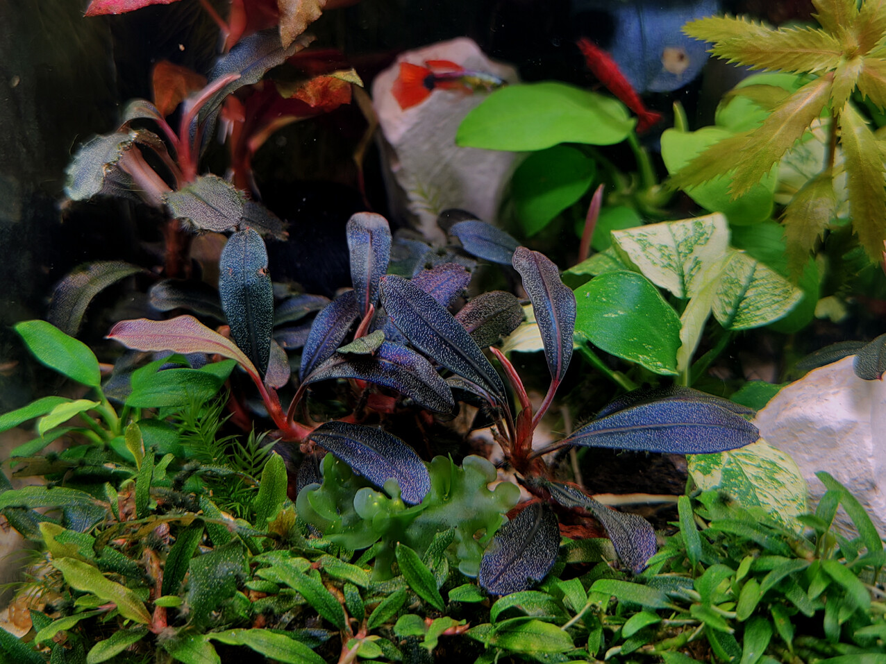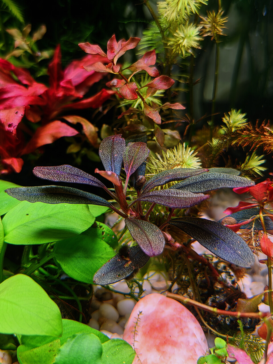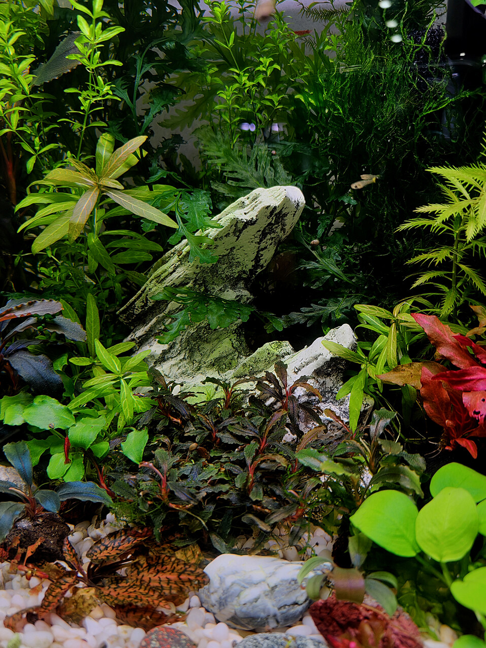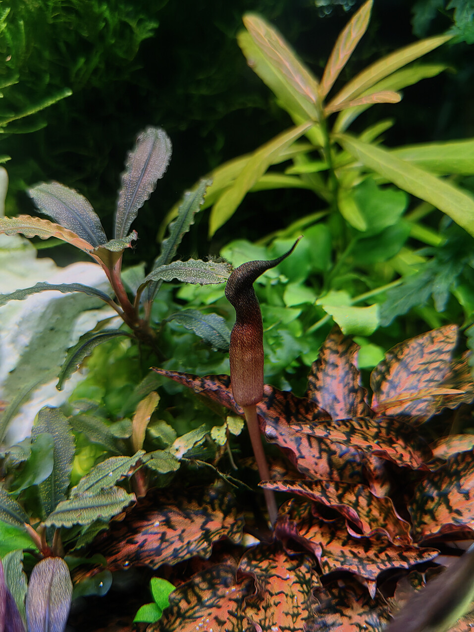 Камень 2793 Жалоба Опубликовано 11 октября Аквариум 36л/2, 38х28х37 -ДхШхВ. СО2, RGB+UV Фильтр: Sunsun LW 602B, внешний 6Вт, 400 л/час - заявленная (по факту 210 л/час) и навесной мини-самп "380" 3w. Свет: Week Aqua M300 Pro - К, 25w, 1500Lm. Режим "Red", в пике 50% мощности. Световой день с 8:30 до 13:40 и с 17:40 до 21:40. СО2: реактор на соде и лимонной кислоте, 40-50 пуз/мин, 14,5 часов. Нагреватель не использую. Компрессор не использую. Грунт: кварцевая пыль, слой 1,5-2 см. Вода: водопровод+осмос 1:3, плюс рем "Нилпа GH+" Параметры воды: kH 3-4; pH 6,7-7; gH 9-11. Температура 22-25С зимой; 24-27С летом. Удобрения: Aquabalance Premium Макро NPK, NK, PK, плюс Aquaerus Калий; Aquaerus Микро, плюс Aquaerus Железо. Витамины: Aquaerus, йодинол. Животные: Poecilia reticulata "Dumbo Red Tail" - гуппи "Дамбо красный хвост" - не много. Neocaridina davidi "Bloody Mary" - Креветка "Кровавая Мэри" - много. Caridina japonica - Креветка Амано - 4 шт. Улитки: катушки, физы, меланьи. Растения: Анубиасы: Anubias barteri var. nana "Gold", Anubias barteri var. nana "Pinto", Anubias barteri var. nana "Petite" Anubias barteri var. nana "Pangolino", Anubias barteri var. nana "Round Leaf", Anubias barteri var. glabra minima. Буцефаландры: Bucephalandra sp. "Brownie Ghost", Bucephalandra sp. "Kualakuayan-1", Bucephalandra sp. "Raven", Bucephalandra sp. "Kedagang", Bucephalandra sp. "Tumbang Kelaken", Bucephalandra sp. "Godzilla", Bucephalandra sp. "Flamingo", Bucephalandra sp. "Black Rose", Bucephalandra sp. "Super Blue Type Round", Bucephalandra sp. "Theia silver", Bucephalandra sp. "Brownie Phoenix", Bucephalandra sp. "Brownie Purple". Bucephalandra sp. неопознанная "изумрудная". Bucephalandra sp. неопознанная "желто-сине-зеленая/персиковая". Schismatoglottis roseospatha, Schismatoglottis prietoi, Длинностебельные: Hemianthus micranthemoides - Хемиантус малоцветковый, Proserpinaca palustris - Прозерпинака болотная, Myriophyllum heterophyllum - Перистолистник красностебельный, Alternanthera reineckii Rosanervig - Альтернантера розанервиг, Ludwigia palustris Super red - Людвигия супер рэд, Hygrophila lancea "Araguaia" - Гигрофила Арагвайа, Rotala wallichii sp. Bangladesh - Ротала Бангладеш, Rotala ramosior "Florida" - Ротала Флорида. Мхи: Taxiphyllum sp - Flame Moss - мох пламя Fissidens cf. fontanus Grande - Octodiceras fontanum - мох фонтан (большой феникс) Lomariopsis lineata - заросток папоротника Ломариопсис Плавающие: Pistia stratiotes- Пистия, Limnobium stoloniferum - Лимнобиум, Salvinia natans - Сальвиния, Phyllanthus fluitans - Филлантус. - Это бывший аквариум 32л. Он был из тонкого акрила с закругленными углами и в конце мая лопнул вертикально по всей высоте. Просуществовал лет десять. Грунт, оборудование и вся живность спустя время переехали в этот 36л аквариум. Переезд прошел не совсем гладко, немного вылазил эдогониум, вьетнамка лютовала и некоторые растения приуныли. За лето вроде все стабилизировалось, все выжили оклимались и хорошо растут. Борюсь с бородой, пока побеждаю. Креветки плодятся, гуппиков уменьшил. Картинка нравится, а композиция нет, буду переделывать, уже двигаю немного, но пока только хуже получается. Видимо придется принимать "трудные решения" и урезать биомассу, но номенклатуру постараюсь не уменьшать. - Bucephalandra sp. "Black Rose", прекрасно себя чувствует в аквариуме с СО2, цвет насыщенный темно-сине-пурпурный: - Hygrophila lancea "Araguaia". Приехала ко мне в ноябре прошлого года, в виде Hygrophila Chai (Pink lady). Вся такая нежная, с листьями неоново-розового цвета. (фото ноябрь 2024): Но в моих условиях начала грубеть, выпускать красно-коричневые листья - выродилась обратно в Hygrophila "Araguaia" , стала хрупкой и ломкой. Поломалась вся, повтыкал несколько обломков на переднем плане. Сейчас такая, растет фиг пойми куда, пытается стелиться по дну, но симпатичная: - Rotala ramosior "Florida". Приехала в прошлом году, вместе с Сhai (вверху на ноябрьском фото они сидят в одном горшке). Вроде прижилась, красивая! 9 Antik, Nevidimka, AlexLi и 6 люди отреагировали на это Поделиться сообщени
