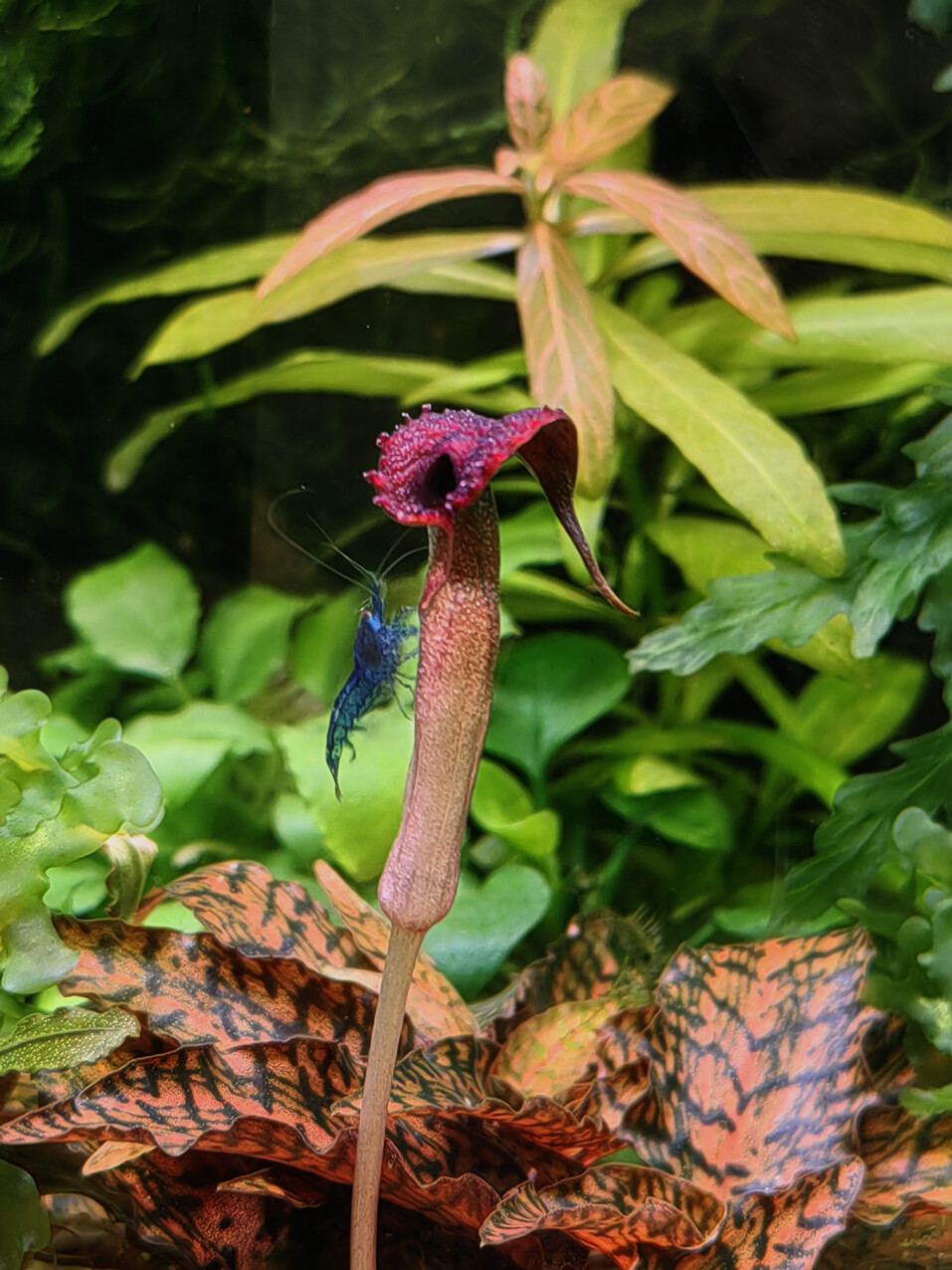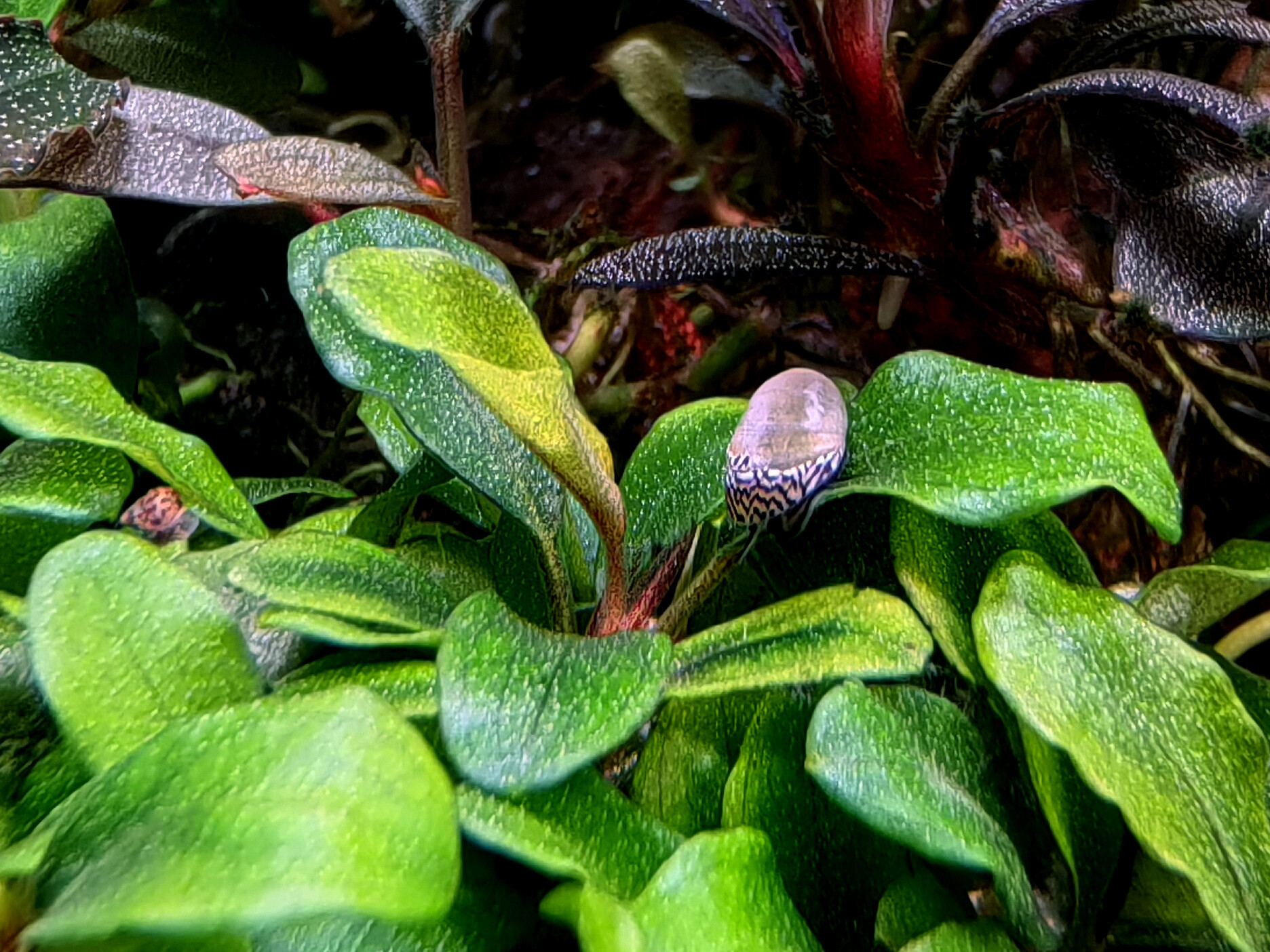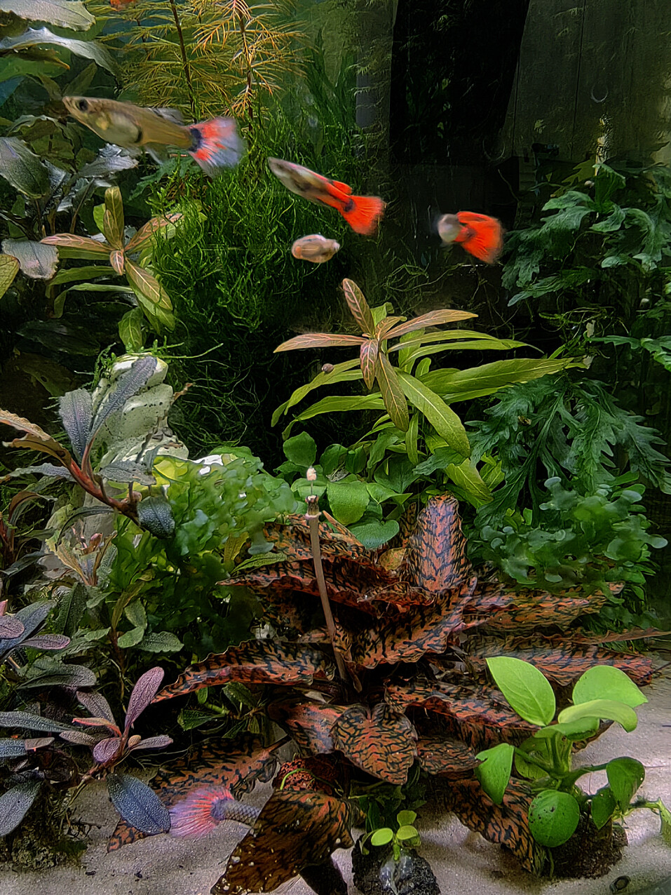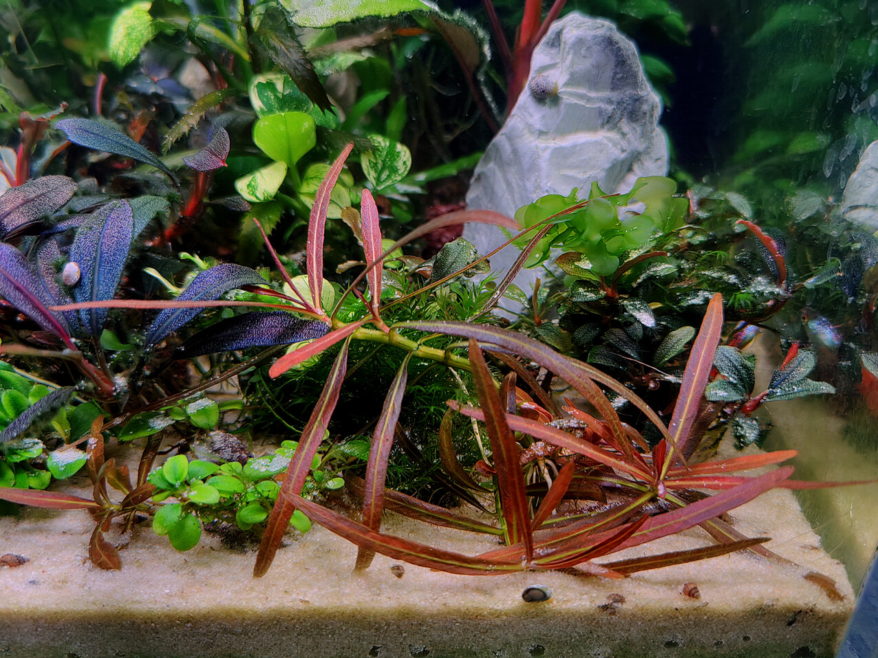 Камень 2793 Жалоба Опубликовано 11 октября Аквариум 36л/2, 38х28х37 -ДхШхВ. СО2, RGB+UV Фильтр: Sunsun LW 602B, внешний 6Вт, 400 л/час - заявленная (по факту 210 л/час) и навесной мини-самп "380" 3w. Свет: Week Aqua M300 Pro - К, 25w, 1500Lm. Режим "Red", в пике 50% мощности. Световой день с 8:30 до 13:40 и с 17:40 до 21:40. СО2: реактор на соде и лимонной кислоте, 40-50 пуз/мин, 14,5 часов. Нагреватель не использую. Компрессор не использую. Грунт: кварцевая пыль, слой 1,5-2 см. Вода: водопровод+осмос 1:3, плюс рем "Нилпа GH+" Параметры воды: kH 3-4; pH 6,7-7; gH 9-11. Температура 22-25С зимой; 24-27С летом. Удобрения: Aquabalance Premium Макро NPK, NK, PK, плюс Aquaerus Калий; Aquaerus Микро, плюс Aquaerus Железо. Витамины: Aquaerus, йодинол. Животные: Poecilia reticulata "Dumbo Red Tail" - гуппи "Дамбо красный хвост" - не много. Neocaridina davidi "Bloody Mary" - Креветка "Кровавая Мэри" - много. Caridina japonica - Креветка Амано - 4 шт. Улитки: катушки, физы, меланьи. Растения: Анубиасы: Anubias barteri var. nana "Gold", Anubias barteri var. nana "Pinto", Anubias barteri var. nana "Petite" Anubias barteri var. nana "Pangolino", Anubias barteri var. nana "Round Leaf", Anubias barteri var. glabra minima. Буцефаландры: Bucephalandra sp. "Brownie Ghost", Bucephalandra sp. "Kualakuayan-1", Bucephalandra sp. "Raven", Bucephalandra sp. "Kedagang", Bucephalandra sp. "Tumbang Kelaken", Bucephalandra sp. "Godzilla", Bucephalandra sp. "Flamingo", Bucephalandra sp. "Black Rose", Bucephalandra sp. "Super Blue Type Round", Bucephalandra sp. "Theia silver", Bucephalandra sp. "Brownie Phoenix", Bucephalandra sp. "Brownie Purple". Bucephalandra sp. неопознанная "изумрудная". Bucephalandra sp. неопознанная "желто-сине-зеленая/персиковая". Schismatoglottis roseospatha, Schismatoglottis prietoi, Длинностебельные: Hemianthus micranthemoides - Хемиантус малоцветковый, Proserpinaca palustris - Прозерпинака болотная, Myriophyllum heterophyllum - Перистолистник красностебельный, Alternanthera reineckii Rosanervig - Альтернантера розанервиг, Ludwigia palustris Super red - Людвигия супер рэд, Hygrophila lancea "Araguaia" - Гигрофила Арагвайа, Rotala wallichii sp. Bangladesh - Ротала Бангладеш, Rotala ramosior "Florida" - Ротала Флорида. Мхи: Taxiphyllum sp - Flame Moss - мох пламя Fissidens cf. fontanus Grande - Octodiceras fontanum - мох фонтан (большой феникс) Lomariopsis lineata - заросток папоротника Ломариопсис Плавающие: Pistia stratiotes- Пистия, Limnobium stoloniferum - Лимнобиум, Salvinia natans - Сальвиния, Phyllanthus fluitans - Филлантус. - Это бывший аквариум 32л. Он был из тонкого акрила с закругленными углами и в конце мая лопнул вертикально по всей высоте. Просуществовал лет десять. Грунт, оборудование и вся живность спустя время переехали в этот 36л аквариум. Переезд прошел не совсем гладко, немного вылазил эдогониум, вьетнамка лютовала и некоторые растения приуныли. За лето вроде все стабилизировалось, все выжили оклимались и хорошо растут. Борюсь с бородой, пока побеждаю. Креветки плодятся, гуппиков уменьшил. Картинка нравится, а композиция нет, буду переделывать, уже двигаю немного, но пока только хуже получается. Видимо придется принимать "трудные решения" и урезать биомассу, но номенклатуру постараюсь не уменьшать. - Bucephalandra sp. "Black Rose", прекрасно себя чувствует в аквариуме с СО2, цвет насыщенный темно-сине-пурпурный: - Hygrophila lancea "Araguaia". Приехала ко мне в ноябре прошлого года, в виде Hygrophila Chai (Pink lady). Вся такая нежная, с листьями неоново-розового цвета. (фото ноябрь 2024): Но в моих условиях начала грубеть, выпускать красно-коричневые листья - выродилась обратно в Hygrophila "Araguaia" , стала хрупкой и ломкой. Поломалась вся, повтыкал несколько обломков на переднем плане. Сейчас такая, растет фиг пойми куда, пытается стелиться по дну, но симпатичная: - Rotala ramosior "Florida". Приехала в прошлом году, вместе с Сhai (вверху на ноябрьском фото они сидят в одном горшке). Вроде прижилась, красивая! 9 Antik, Nevidimka, AlexLi и 6 люди отреагировали на это Поделиться сообщени