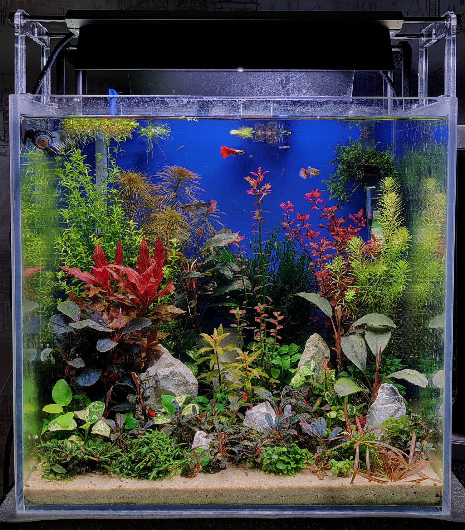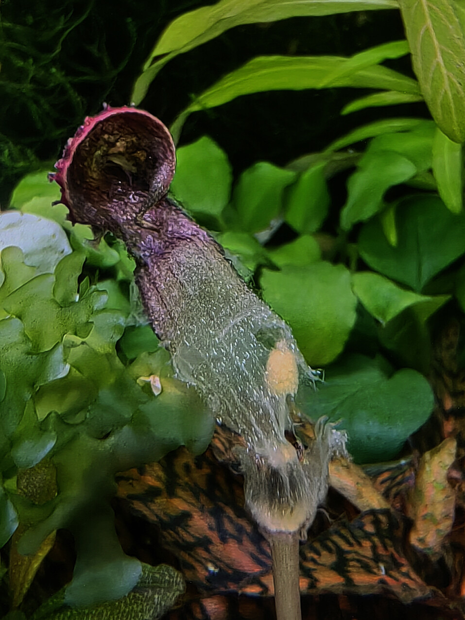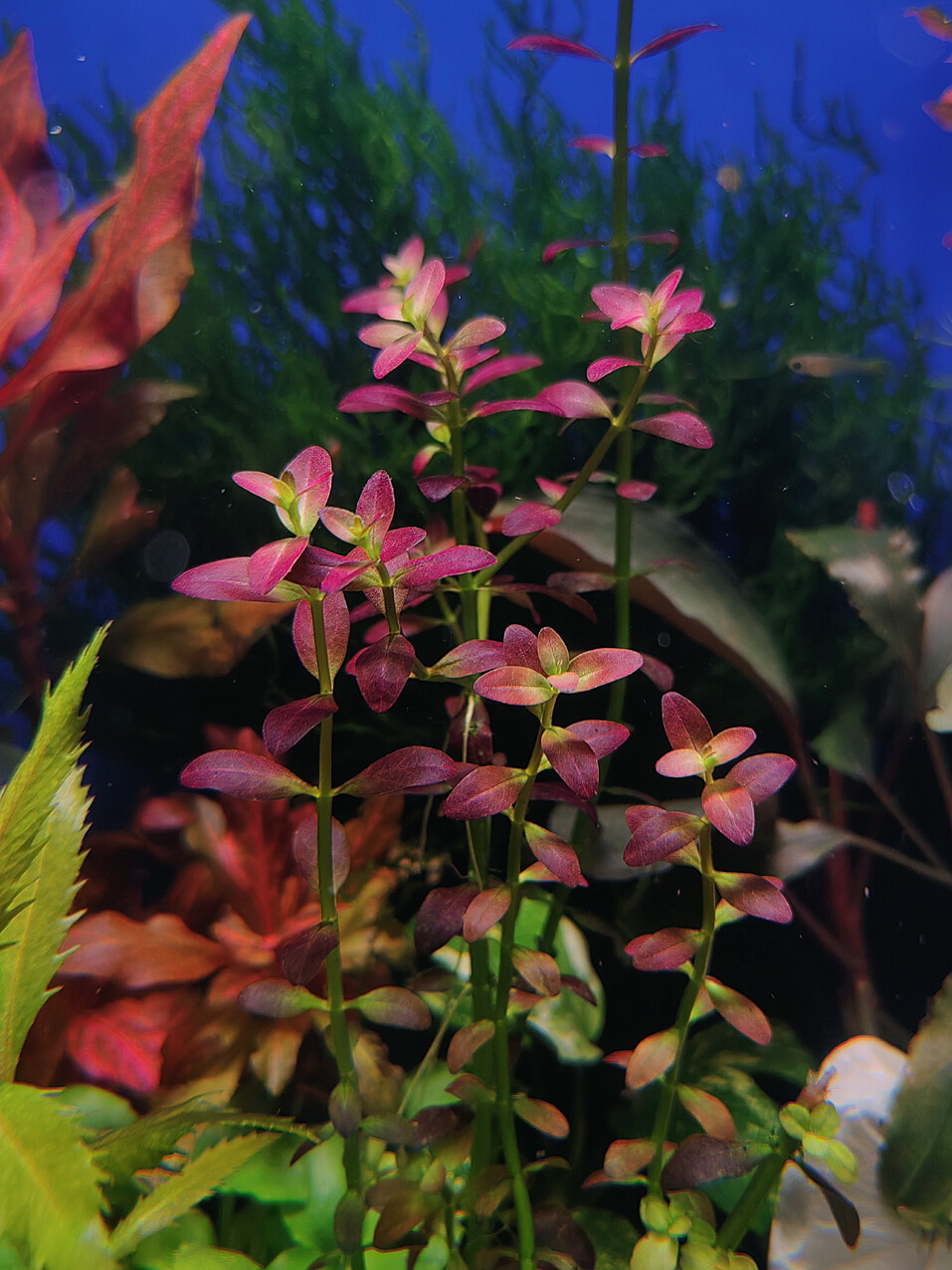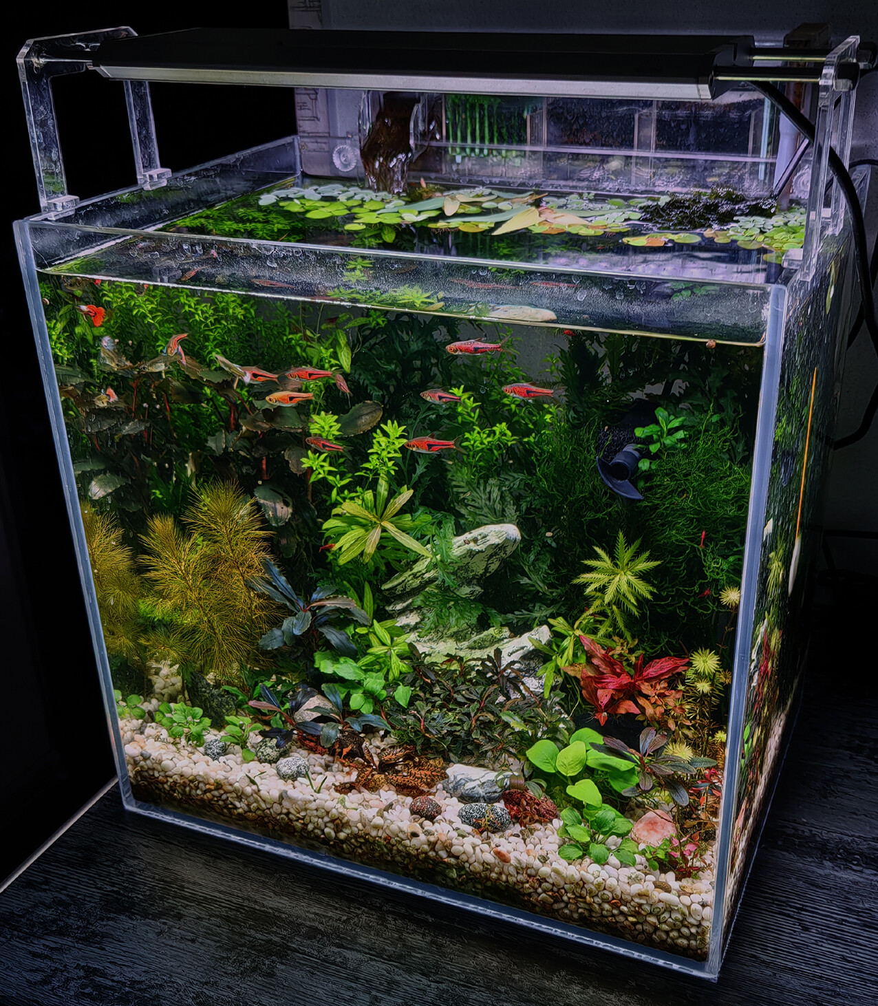 Камень 2793 Жалоба Опубликовано 11 октября Аквариум 36л/2, 38х28х37 -ДхШхВ. СО2, RGB+UV Фильтр: Sunsun LW 602B, внешний 6Вт, 400 л/час - заявленная (по факту 210 л/час) и навесной мини-самп "380" 3w. Свет: Week Aqua M300 Pro - К, 25w, 1500Lm. Режим "Red", в пике 50% мощности. Световой день с 8:30 до 13:40 и с 17:40 до 21:40. СО2: реактор на соде и лимонной кислоте, 40-50 пуз/мин, 14,5 часов. Нагреватель не использую. Компрессор не использую. Грунт: кварцевая пыль, слой 1,5-2 см. Вода: водопровод+осмос 1:3, плюс рем "Нилпа GH+" Параметры воды: kH 3-4; pH 6,7-7; gH 9-11. Температура 22-25С зимой; 24-27С летом. Удобрения: Aquabalance Premium Макро NPK, NK, PK, плюс Aquaerus Калий; Aquaerus Микро, плюс Aquaerus Железо. Витамины: Aquaerus, йодинол. Животные: Poecilia reticulata "Dumbo Red Tail" - гуппи "Дамбо красный хвост" - не много. Neocaridina davidi "Bloody Mary" - Креветка "Кровавая Мэри" - много. Caridina japonica - Креветка Амано - 4 шт. Улитки: катушки, физы, меланьи. Растения: Анубиасы: Anubias barteri var. nana "Gold", Anubias barteri var. nana "Pinto", Anubias barteri var. nana "Petite" Anubias barteri var. nana "Pangolino", Anubias barteri var. nana "Round Leaf", Anubias barteri var. glabra minima. Буцефаландры: Bucephalandra sp. "Brownie Ghost", Bucephalandra sp. "Kualakuayan-1", Bucephalandra sp. "Raven", Bucephalandra sp. "Kedagang", Bucephalandra sp. "Tumbang Kelaken", Bucephalandra sp. "Godzilla", Bucephalandra sp. "Flamingo", Bucephalandra sp. "Black Rose", Bucephalandra sp. "Super Blue Type Round", Bucephalandra sp. "Theia silver", Bucephalandra sp. "Brownie Phoenix", Bucephalandra sp. "Brownie Purple". Bucephalandra sp. неопознанная "изумрудная". Bucephalandra sp. неопознанная "желто-сине-зеленая/персиковая". Schismatoglottis roseospatha, Schismatoglottis prietoi, Длинностебельные: Hemianthus micranthemoides - Хемиантус малоцветковый, Proserpinaca palustris - Прозерпинака болотная, Myriophyllum heterophyllum - Перистолистник красностебельный, Alternanthera reineckii Rosanervig - Альтернантера розанервиг, Ludwigia palustris Super red - Людвигия супер рэд, Hygrophila lancea "Araguaia" - Гигрофила Арагвайа, Rotala wallichii sp. Bangladesh - Ротала Бангладеш, Rotala ramosior "Florida" - Ротала Флорида. Мхи: Taxiphyllum sp - Flame Moss - мох пламя Fissidens cf. fontanus Grande - Octodiceras fontanum - мох фонтан (большой феникс) Lomariopsis lineata - заросток папоротника Ломариопсис Плавающие: Pistia stratiotes- Пистия, Limnobium stoloniferum - Лимнобиум, Salvinia natans - Сальвиния, Phyllanthus fluitans - Филлантус. - Это бывший аквариум 32л. Он был из тонкого акрила с закругленными углами и в конце мая лопнул вертикально по всей высоте. Просуществовал лет десять. Грунт, оборудование и вся живность спустя время переехали в этот 36л аквариум. Переезд прошел не совсем гладко, немного вылазил эдогониум, вьетнамка лютовала и некоторые растения приуныли. За лето вроде все стабилизировалось, все выжили оклимались и хорошо растут. Борюсь с бородой, пока побеждаю. Креветки плодятся, гуппиков уменьшил. Картинка нравится, а композиция нет, буду переделывать, уже двигаю немного, но пока только хуже получается. Видимо придется принимать "трудные решения" и урезать биомассу, но номенклатуру постараюсь не уменьшать. - Bucephalandra sp. "Black Rose", прекрасно себя чувствует в аквариуме с СО2, цвет насыщенный темно-сине-пурпурный: - Hygrophila lancea "Araguaia". Приехала ко мне в ноябре прошлого года, в виде Hygrophila Chai (Pink lady). Вся такая нежная, с листьями неоново-розового цвета. (фото ноябрь 2024): Но в моих условиях начала грубеть, выпускать красно-коричневые листья - выродилась обратно в Hygrophila "Araguaia" , стала хрупкой и ломкой. Поломалась вся, повтыкал несколько обломков на переднем плане. Сейчас такая, растет фиг пойми куда, пытается стелиться по дну, но симпатичная: - Rotala ramosior "Florida". Приехала в прошлом году, вместе с Сhai (вверху на ноябрьском фото они сидят в одном горшке). Вроде прижилась, красивая! 9 Antik, Nevidimka, AlexLi и 6 люди отреагировали на это Поделиться сообщени