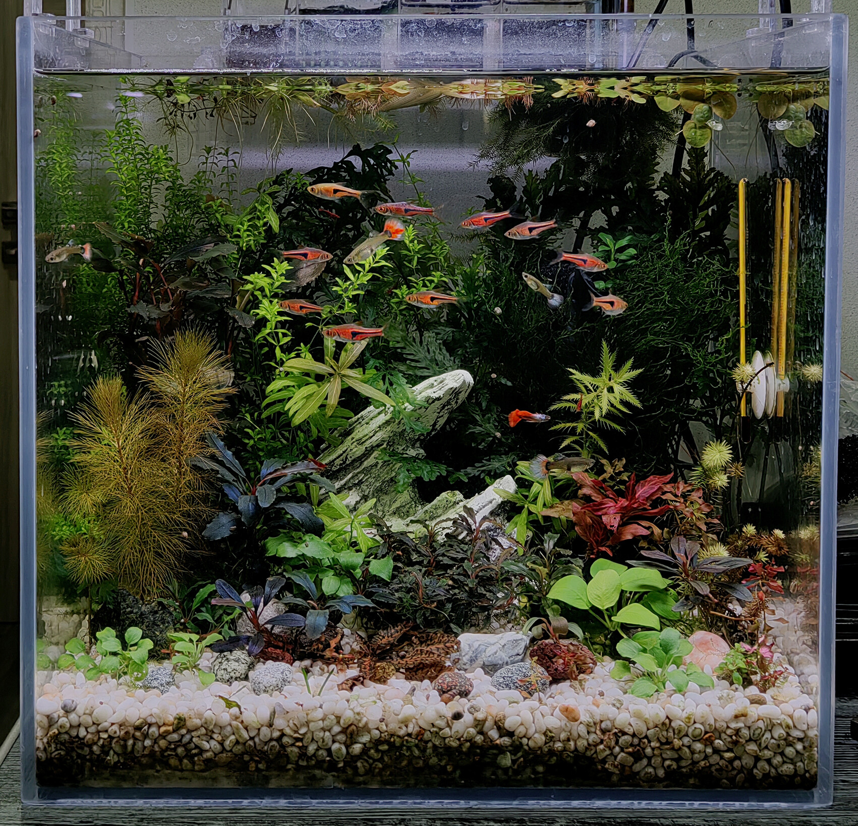 Камень 2793 Жалоба Опубликовано 2 октября Отчитаюсь за аквариум, который запустил в начале апреля. Запуск здесь. Последнее фото общего плана здесь. Аквариум 36л/1, без СО2, свет RGB+UV. Фильтр: Aquael PAT mini, 4 Вт, 400 л/ч и навесной мини-самп Jeneca XGD-17. Свет: Week Aqua M300 Pro - К, 25w, 1500Lm. Режим "Red", в пике 50% мощности. Световой день с 8:40 до 13:40 и с 17:40 до 21:40. СО2: нет Нагреватель не использую. Компрессор не использую. Удобрения: Aquabalance Premium Макро NPK, NK, PK. Aquaerus Калий, Микро, Железо. Витамины: Aquaerus, йодинол. Грунт: жемчужная галька 2-6 мм, слой 4 см. Параметры воды: kH 3-4; pH 7,5; gH 10-12. Температура 22-25С зимой; 24-27С летом. - Пока используется для "запасных" растений, которые не поместились в основные кубики 28л без СО2 и 36л/2 с СО2. Стабильный, водорослей нет, бывают редкие мелкие кустики вьетнамки. Гуппи, креветки Блади Мэри и улитки Теодоксусы - живут и размножаются. На этой неделе переселил сюда разбор Эспей из 28л - им здесь места побольше. Аквариум "в живую" смотрится очень даже не плохо, а фотки получились так себе. Животные: Rasbora espei - Расбора эспей - 10 шт. Poecilia reticulata "Dumbo Red Tail" - гуппи "Дамбо красный хвост" - немного. Neocaridina davidi "Bloody Mary" - Креветка "Кровавая Мэри" - стадо Caridina japonica - Креветка Амано - 2 Улитки: катушки, физы, меланьи, теодоксусы. Растения: Анубиасы: Anubias barteri var. nana "Gold". Anubias barteri var. nana "Pangolino". Буцефаландры: Bucephalandra sp. "Kedagang". Bucephalandra sp. "Tumbang Kelaken". Bucephalandra sp. "Brown Grande". Bucephalandra sp. "Flamingo". Bucephalandra sp. "Black Rose". Bucephalandra sp. "Brownie Purple". Bucephalandra sp. неопознанная "изумрудная". Bucephalandra sp. неопознанная "желто-сине-зеленая/персиковая". Schismatoglottis prietoi. Cryptocoryne nurii "Rosen Maiden". Длинностебельные: Hemianthus micranthemoides - Хемиантус малоцветковый. Myriophyllum heterophyllum - Перистолистник красностебельный. Hygrophila polysperma Rosanervig - Гигрофилла розанервиг. Proserpinaca palustris - Прозерпинака болотная. Rotala wallichii sp. Bangladesh - Ротала Бангладеш. Alternanthera sp. Rosanervig - Альтернантера розанервиг, Мхи: Taxiphyllum sp - Flame Moss - мох пламя. Fissidens cf. fontanus Grande - Octodiceras fontanum - мох фонтан (большой феникс). Папоротники: Bolbitis heudelotii - Болбитис Геделоти (конголезский папоротник). Bolbitis heudelotii mini. Lomariopsis lineata - заростк папоротника Ломариопсис. Плавающие: Pistia stratiotes- Пистия. Limnobium stoloniferum - Лимнобиум. Salvinia natans - Сальвиния. Phyllanthus fluitans - Филлантус. Hygrorhiza aristata - Гигрориза (плавающий бамбук). 9 Lx671, AnaAna, Ника и 6 люди отреагировали на это Поделиться сообщением Ссылка на сообщение