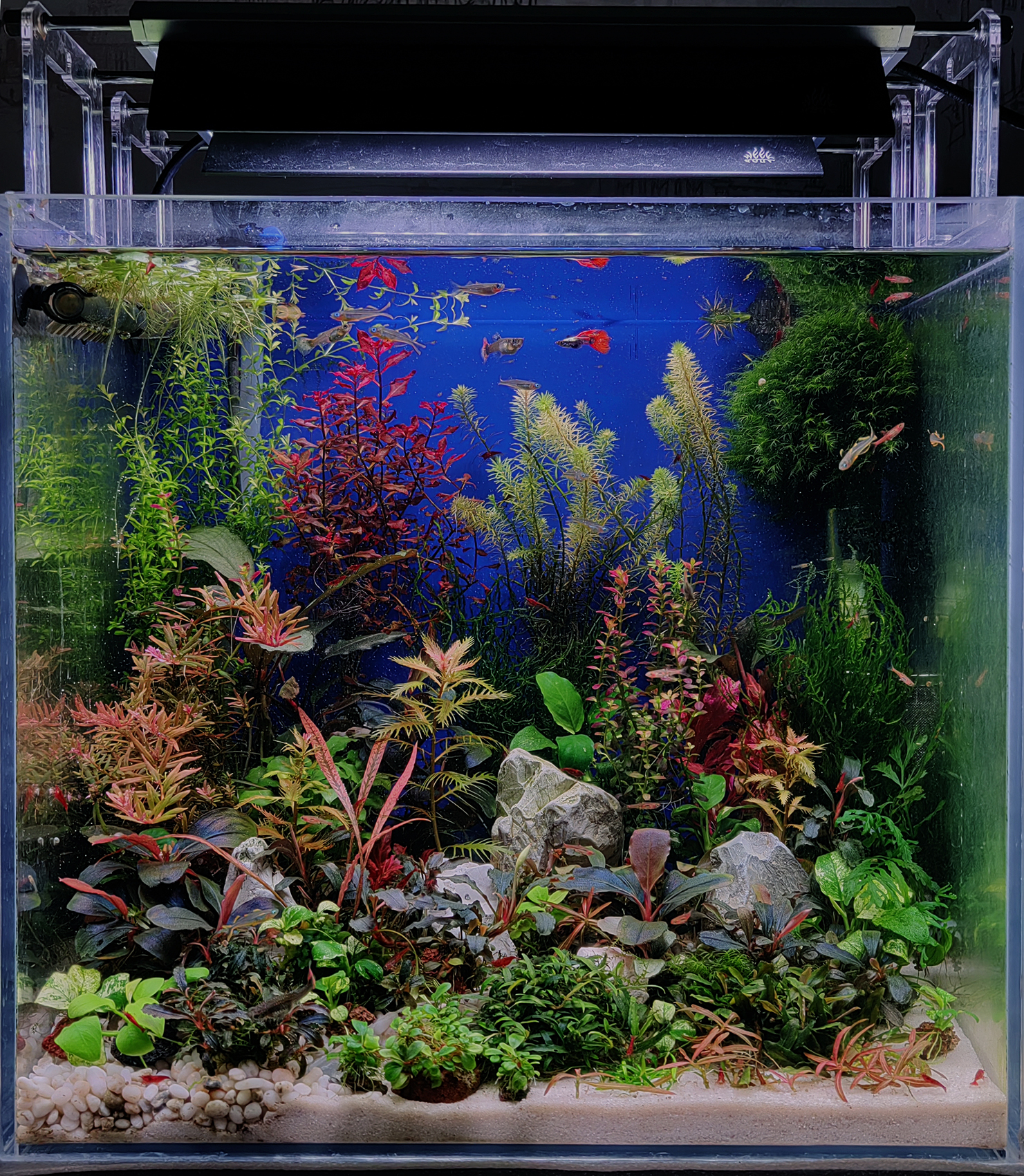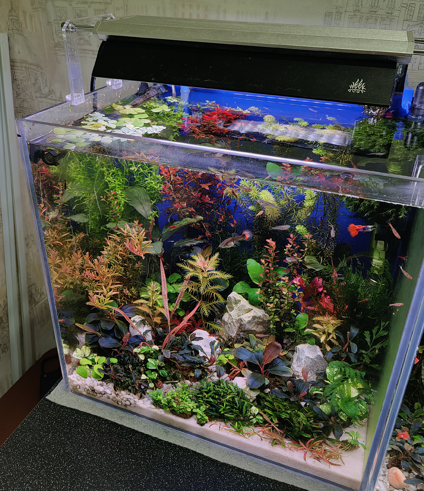 Камень 2991 Жалоба Опубликовано 24 января Аквариум 36л/2, 38х28х37 -ДхШхВ. СО2, RGB+UV Фильтр: Sunsun LW 602B, внешний 6Вт, 400 л/час - заявленная (по факту 210 л/час) и навесной мини-самп ZHIYANG AF380, 3w. Свет: Week Aqua M300 Pro - К, 25w, 1500Lm. Режим "Red", в пике 50% мощности. Световой день с 8:30 до 13:40 и с 17:40 до 21:40. СО2: реактор на соде и лимонной кислоте, 40-50 пуз/мин, 14,5 часов. Нагреватель не использую. Компрессор не использую. Грунт. 65% площади дна - Жемчужная галька 2-6 мм, высота 4 см. 35% площади дна - Кварцевый песок 0,4-0,6 мм, Высота 2 см. Вода: водопровод+осмос 1:7, плюс рем "Нилпа GH+". Подмена 12л раз в неделю. Параметры воды: kH 2-3; pH 6,5-6,7; gH 9-11. Температура 22-25С зимой; 24-27С летом. Удобрения: Aquabalance Premium Макро NPK, NK, PK. плюс Aquaerus Калий. Aquaerus Микро, плюс Aquaerus Железо. Витамины: Aquaerus, йодинол. Удобрения вношу один раз в неделю, после подмены , из расчета на весь обьем: Азот 12 мг/л, Фосфат 0,8 мг/л, Калий 6 мг/л, Железо 0,12 мг/л. Животные: Poecilia reticulata "Dumbo Red Tail" - гуппи "Дамбо красный хвост" - несколько. Boraras brigittae - Расбора Бригитта (Расбора-комар) - было 12 Pseudomugil furcatus - Попондетта фруката - было 10 Neocaridina davidi "Bloody Mary" - Креветка "Кровавая Мэри" - много. Caridina japonica - Креветка Амано - было 4 шт. Улитки: катушки, физы, меланьи. Растения: Анубиасы: Anubias barteri var. nana "Gold", Anubias barteri var. nana "Pinto", Anubias barteri var. nana "Petite" Anubias barteri var. nana "Pangolino", Anubias barteri var. nana "Round Leaf". Буцефаландры: Bucephalandra sp. "Brownie Ghost", Bucephalandra sp. "Kualakuayan-1", Bucephalandra sp. "Kedagang", Bucephalandra sp. "Tumbang Kelaken", Bucephalandra sp. "Godzilla", Bucephalandra sp. "Flamingo", Bucephalandra sp. "Black Rose", Bucephalandra sp. "Super Blue Type Round", Bucephalandra sp. "Theia silver", Bucephalandra sp. "Brownie Phoenix", Bucephalandra sp. "Brownie Purple", Bucephalandra sp. неопознанная "желто-сине-зеленая/персиковая". Schismatoglottis roseospatha, Schismatoglottis prietoi, Cryptocoryne parva, Cryptocoryne spiralis "Tiger". Длинностебельные: Hemianthus micranthemoides - Хемиантус малоцветковый, Proserpinaca palustris - Прозерпинака болотная, Alternanthera reineckii Rosanervig - Альтернантера розанервиг, Ludwigia palustris Super red - Людвигия супер рэд, Hygrophila lancea "Araguaia" - Гигрофила Арагвайа, Hygrophila pinnatifida - Гигрофила Пиннантифида, Rotala wallichii sp. Bangladesh - Ротала Бангладеш, Rotala ramosior "Florida" - Ротала Флорида, Rotala rotundifolia H'Ra - Ротала Хра. Мхи: Taxiphyllum sp - Flame Moss - мох пламя Fissidens cf. fontanus Grande - Octodiceras fontanum - мох фонтан (большой феникс) Папоротники: Bolbitis heudelotii mini - Болбитис Геделоти мини (конголезский папоротник). Lomariopsis lineata - заростк папоротника Ломариопсис. Плавающие: Pistia stratiotes- Пистия, Limnobium stoloniferum - Лимнобиум, Salvinia natans - Сальвиния, Phyllanthus fluitans - Филлантус. На новогодних праздниках поменял грунт. Вместо кварцевой пыли взял кварцевый песок с фракцией 0,4-0,6 мм. Песком засыпал правый ближний угол, примерно 35% площади дна. Остальную площадь засыпал жемчужной галькой 2-6 мм. Часть гальки взял из действующего аквариума, запущенного в апреле прошлого года и часть свежей досыпал. Из-за большой плотности посадки, фактуры дна не видно, еще буду работать над дизайном в сторону уменьшения количества растений. В конце прошлого года понизил кН подменной воды. Раньше мешал осмос с водопроводом в пропорции 3:1, кН был 4. Теперь мешаю 7:1, кН 2. Для повышения gH, в подменную воду добавляю реминерализатор "Нилпа GH+" Обитатели аквариума чувствуют себя хорошо, грунт "настаивается", водорослей нет, кроме немного вьетнамки. Boraras brigittae - Расбора Бригитта (Расбора-комар) - Pseudomugil furcatus - Попондетта фруката (самец). 10 1 Поделиться сообщением Ссылка на сообщение