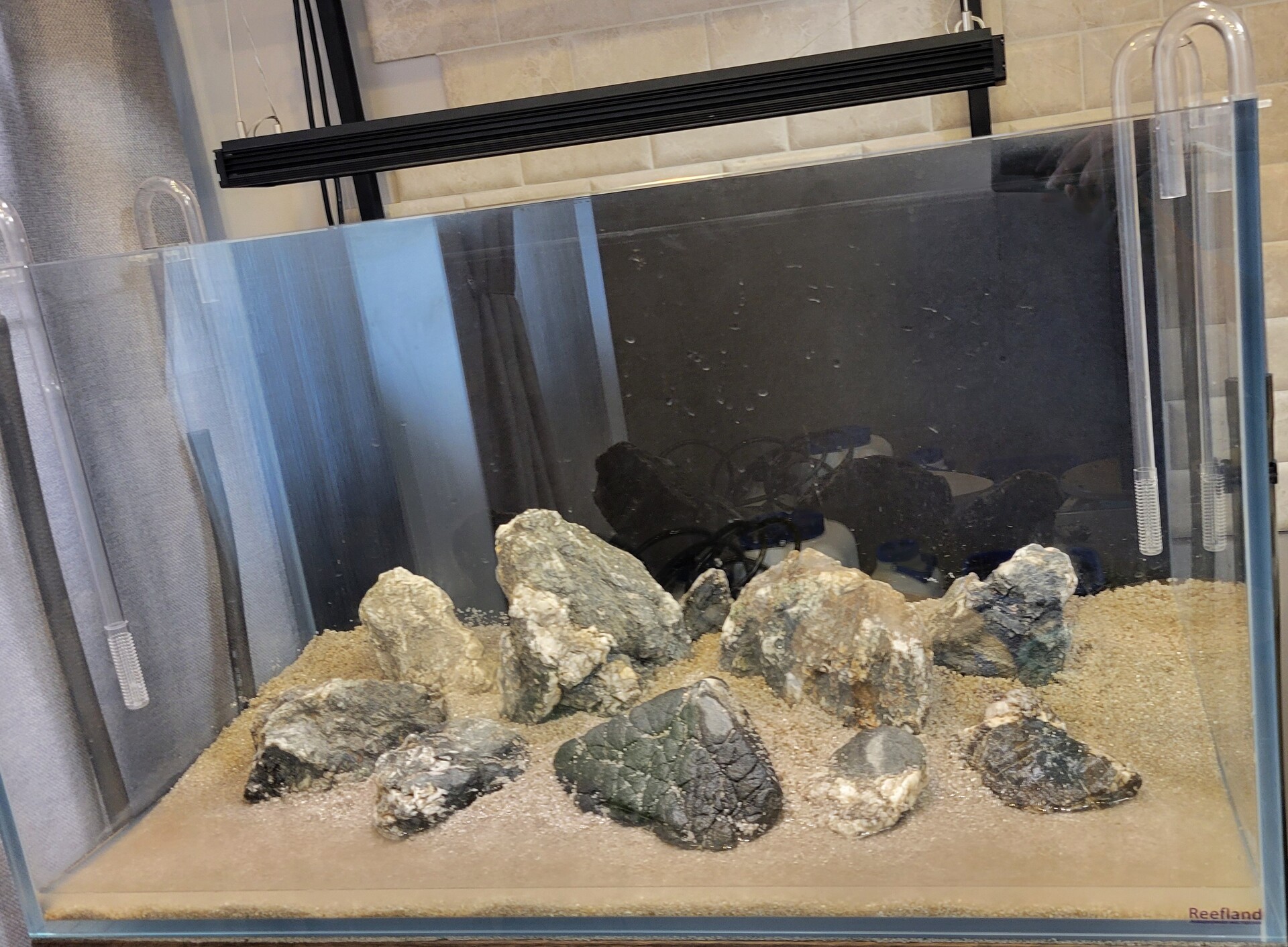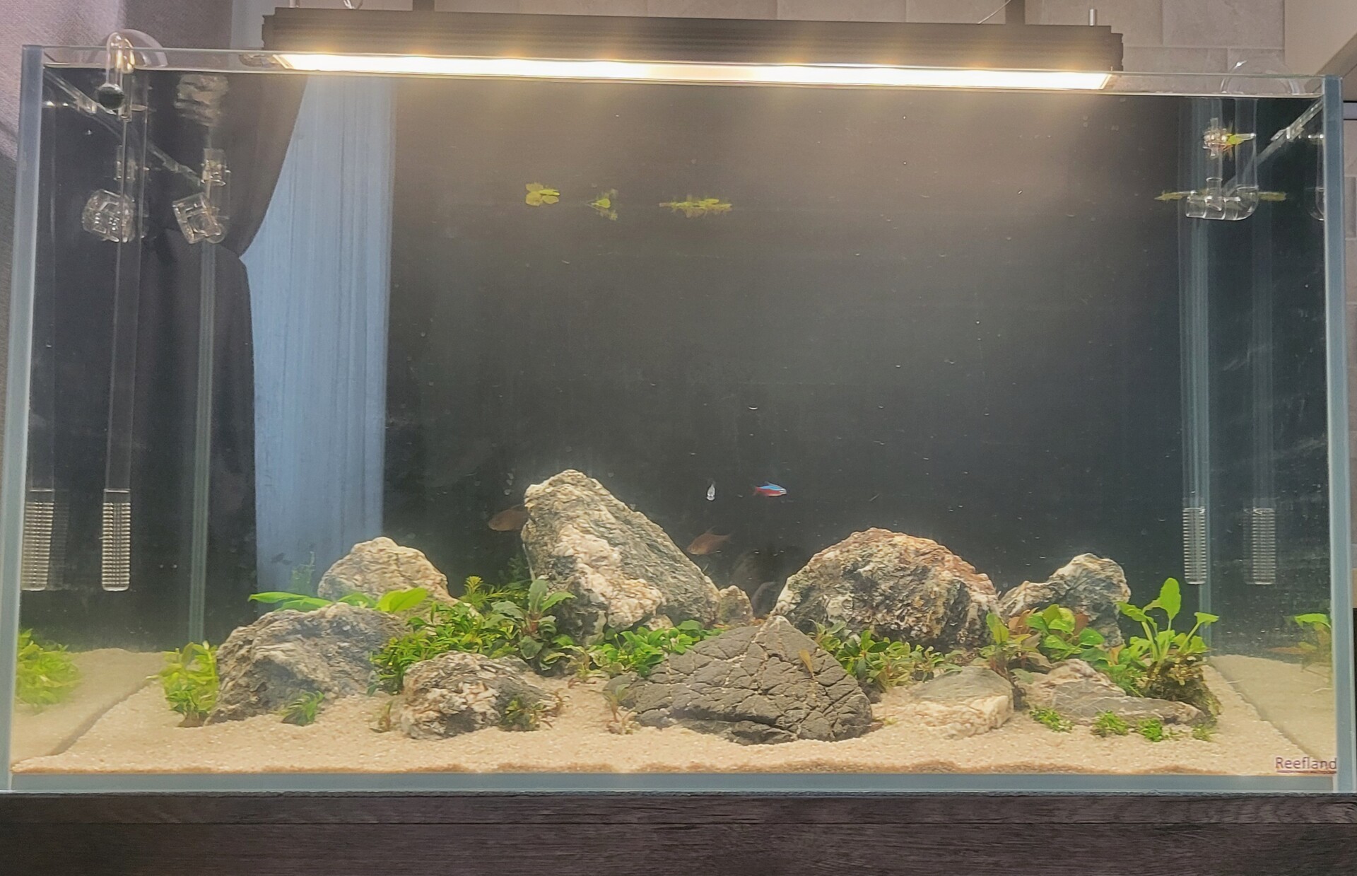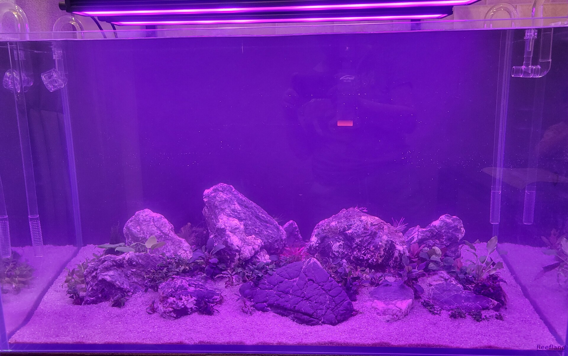 Хорошее начало! Там даже уже новосельцы есть) Свет такой теплый и уютный, будто 3000 К. Трубки аккуратно смотрятся) Песочек красивый) Ты главное не забывай периодически обновлять тут картинку, хочется ж видеть, как всё разрастется между камешков)