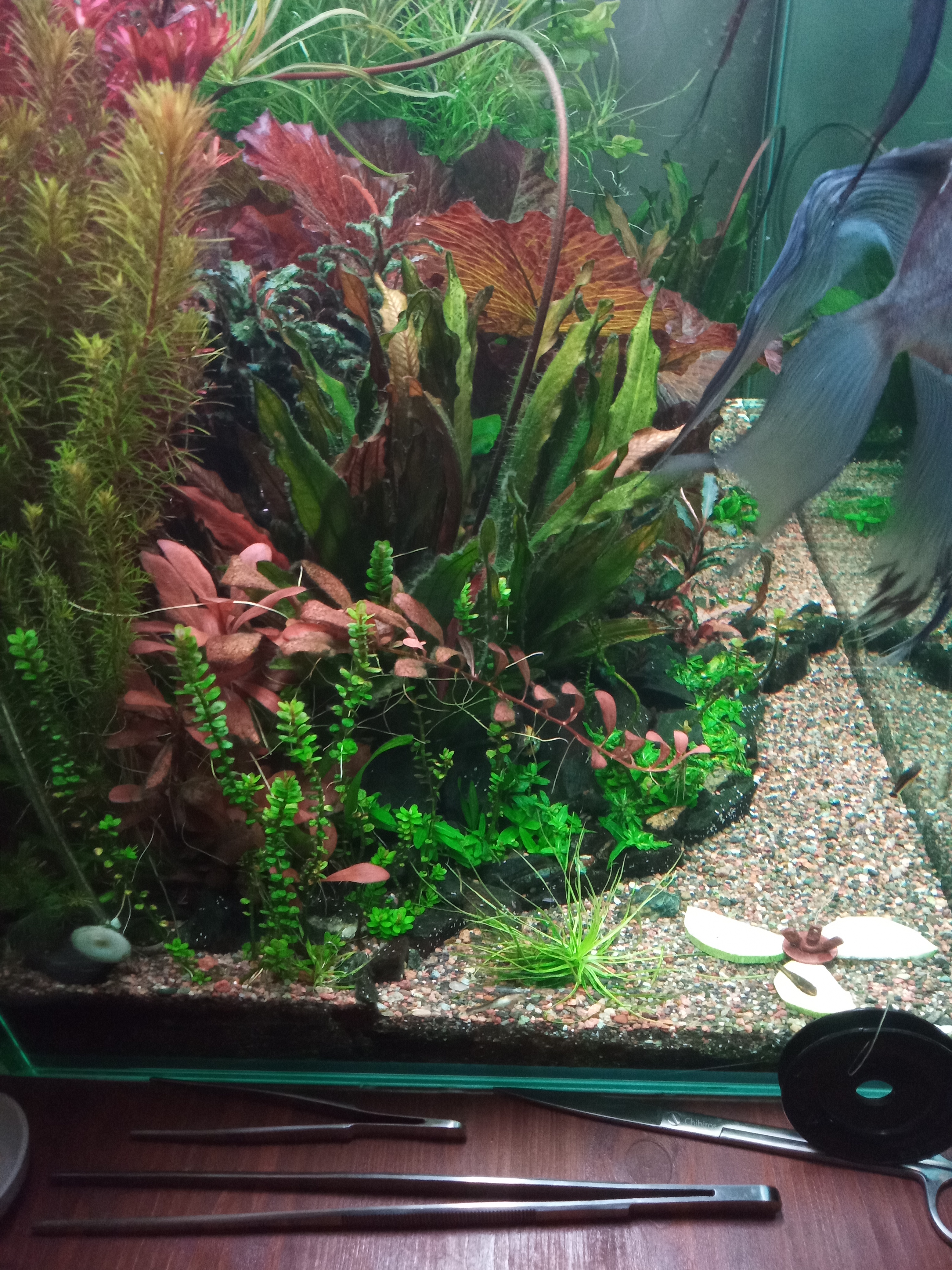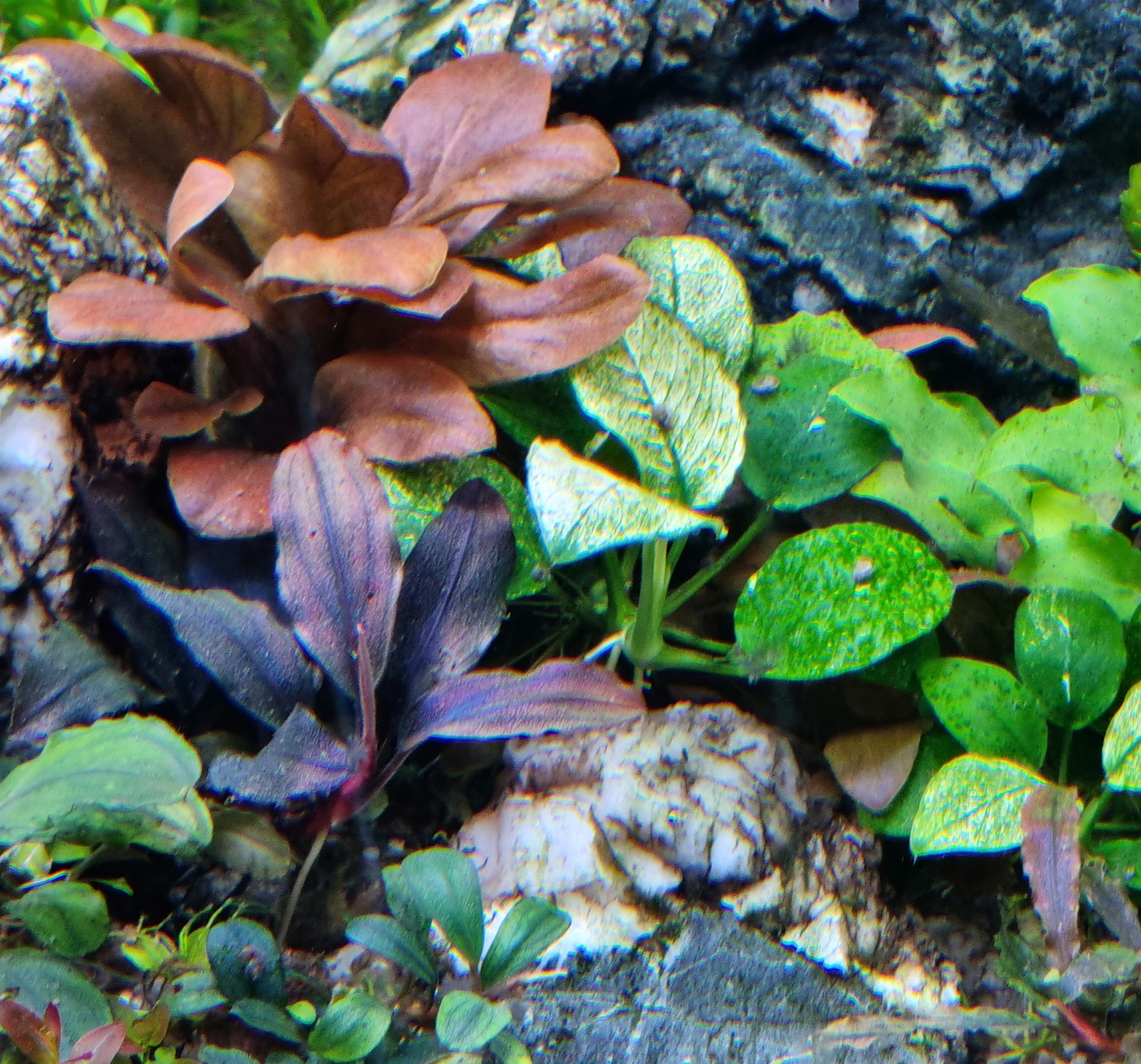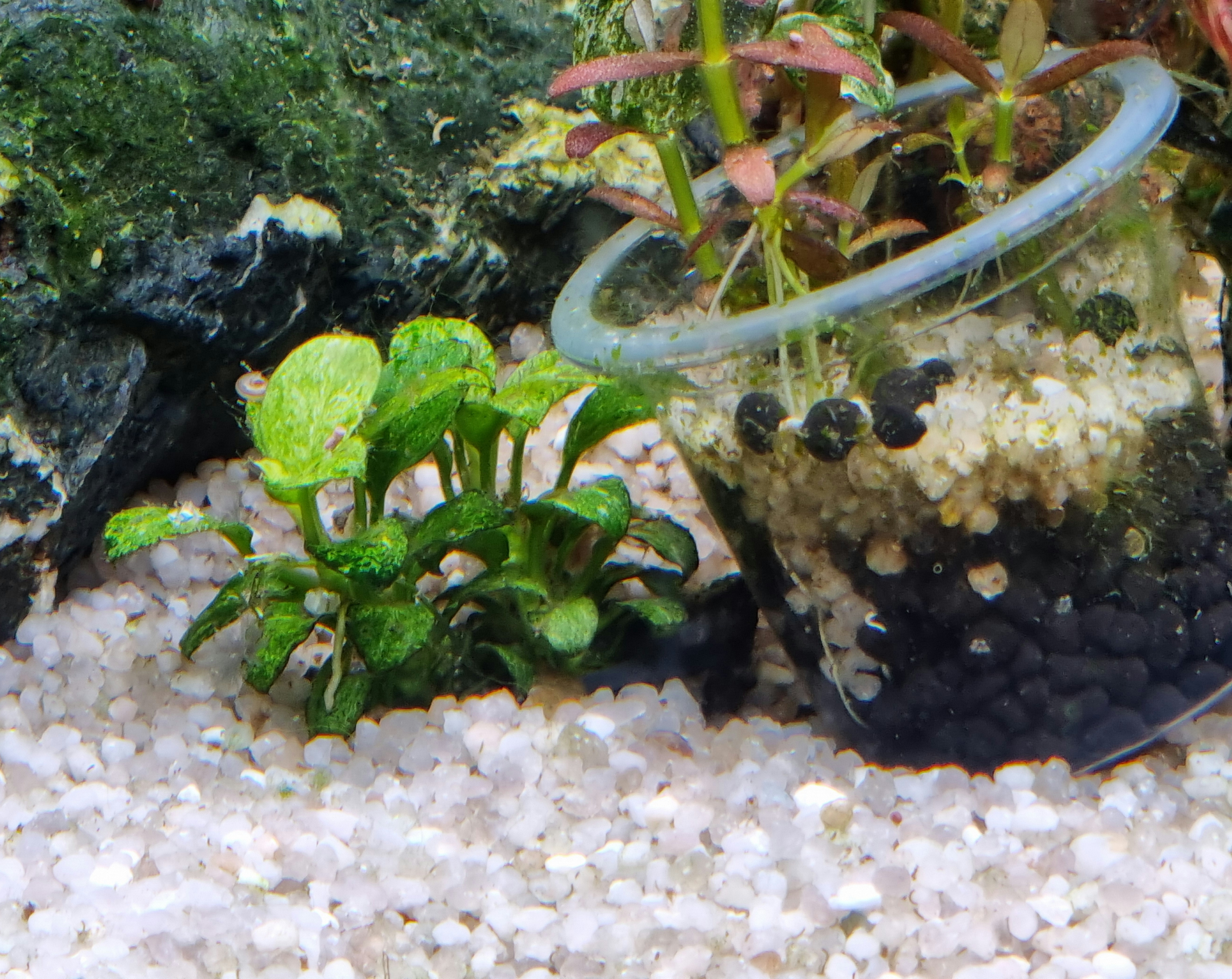 В стаканчиках - апоногетон (слева) и бакопа зальцмана пурпл (почти центр). Апоногетоша приехал ко мне без корней и мы с ним очень долго договаривались, что он таки остаётся. Бакопа - неудачный запуск и переезд из старого в новый. Старый акв стоял 2 недели без света. Бакопа, внешне демонстрировшая сносный габитус, при пересадке показала практически тотальное растворения. Спасти удалось 3 огрызка. Вроде дернулись в рост.