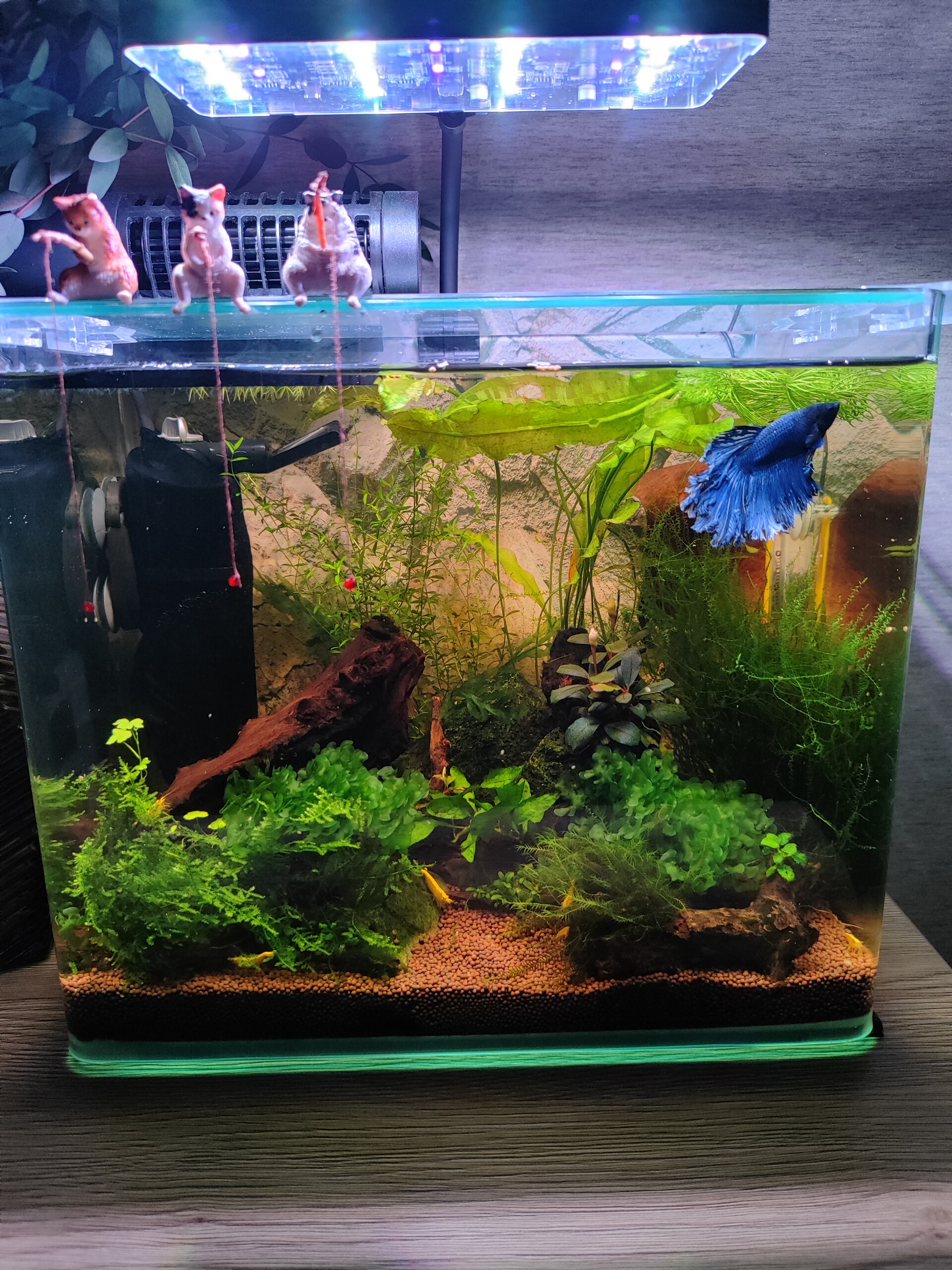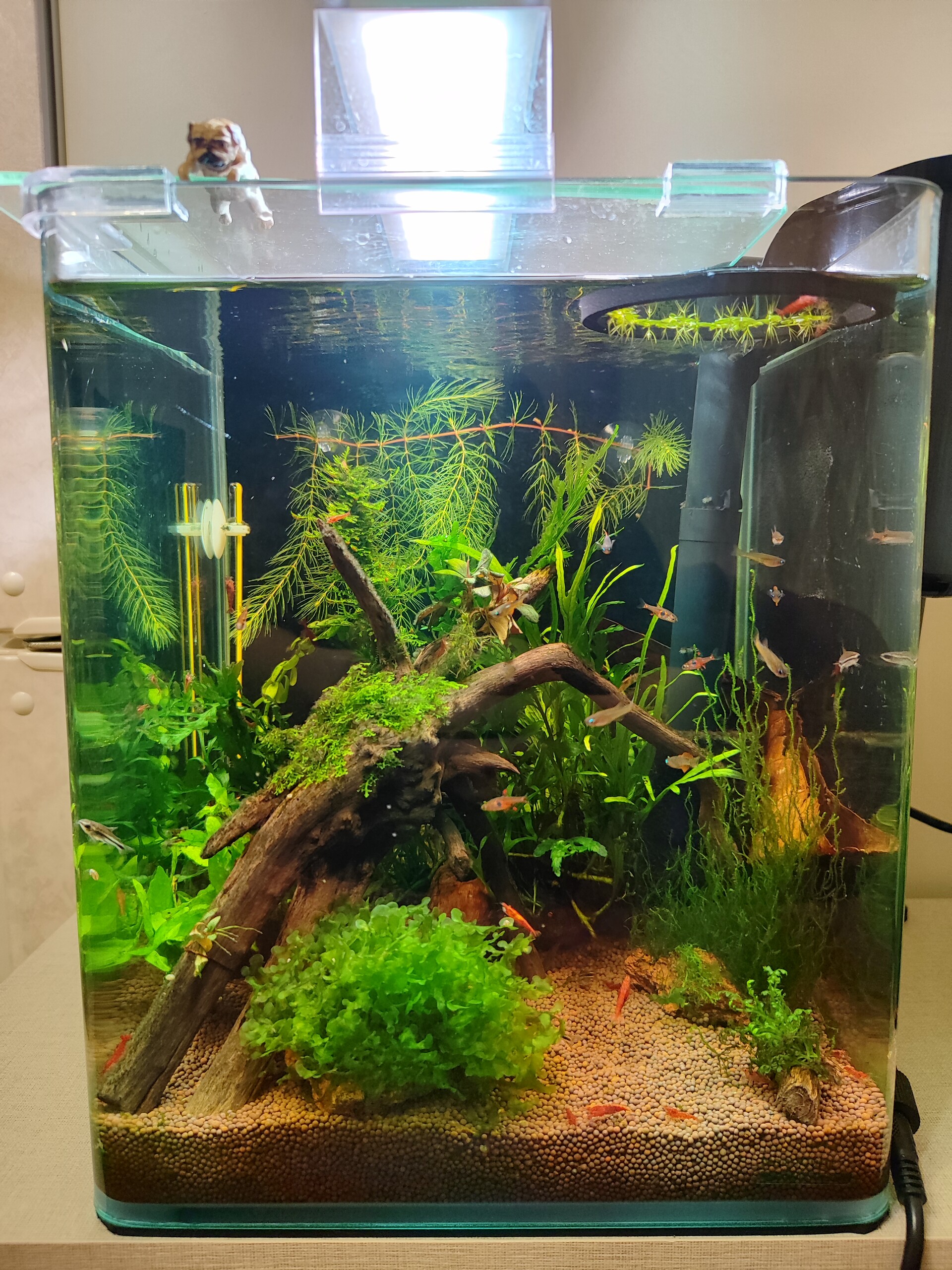Nevidimka 3188 Жалоба Опубликовано 3 июля Тем временем в 14 л всё более менее стабильно. Наконец-то там прижилась растючка для заднего фона - хемиантус микрантемоидес от Петра)) С маленькой полуживой веточки нарастил неплохой кустик) И тут выжила веточка гидрокотилы)) Зацепилась за мох и сидит там, не трогаю её, пусть живёт) Буцка всё время с бутонами, но они не распускаются, отгнивают и всё( Сальвиния минима здесь стала покрупнее, чем в 20 л, вчера при подмене заметила это изменение) Креветки продолжают бесследно исчезать. Натянула капроновый носок на фильтр и добавила желтых неонов от другого поставщика. Посмотрим, что из этого выйдет) Василий не перестает тренировать свои таланты архитектора) Так и не видела ни разу его интереса к креветкам, на кормежку всегда шустро приплывает, ест аж чавкает))) На сегодняшний день 14 литровый козявочник выглядит так: Второй аквариум, мне кажется, удачнее первого получился. Растения выглядят в нем лучше. Коряг +- столько же, а вот населения меньше значительно. Может всё-таки я переборщила в 20 л И всё же разный свет, в 20 л белый чих, в 14 л вика с УФ 9 минут назад, Paracheirodon сказал(а): Кубинос Роголистос..! Мне понравилась эта веточка, приехала ко мне с креветками)) 6 Камень, Paracheirodon, Пятница и 3 люди отреагировали на это Поделиться сообщением Ссылка на сообщение