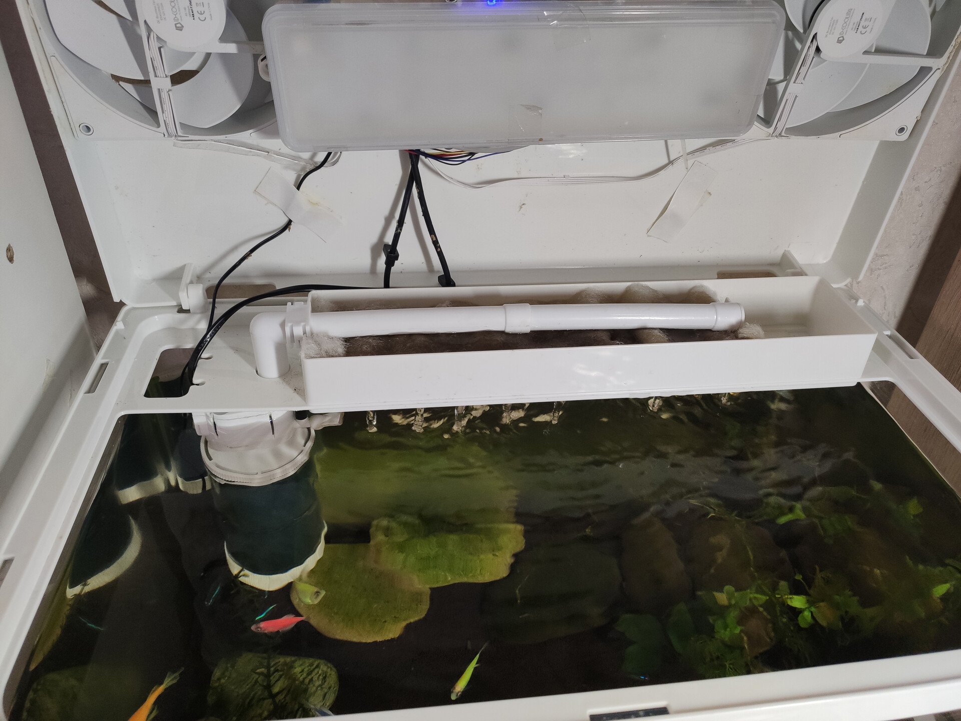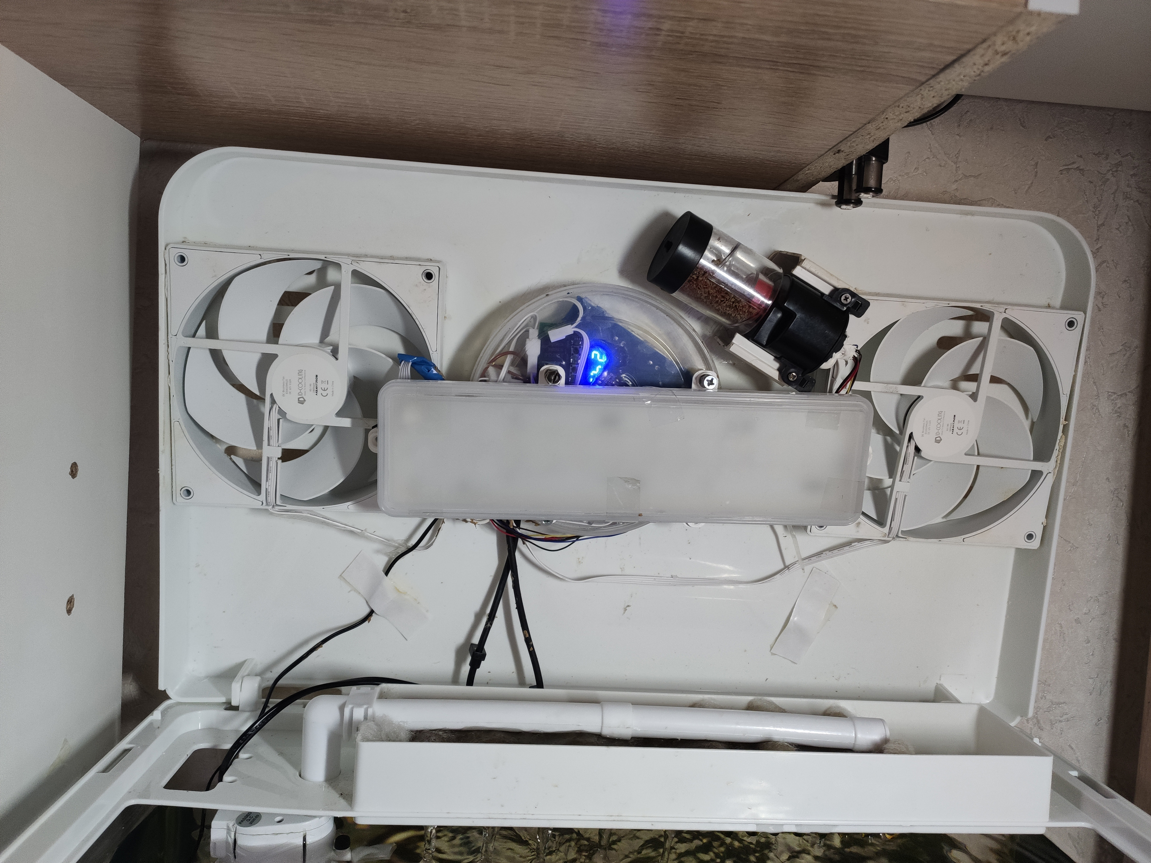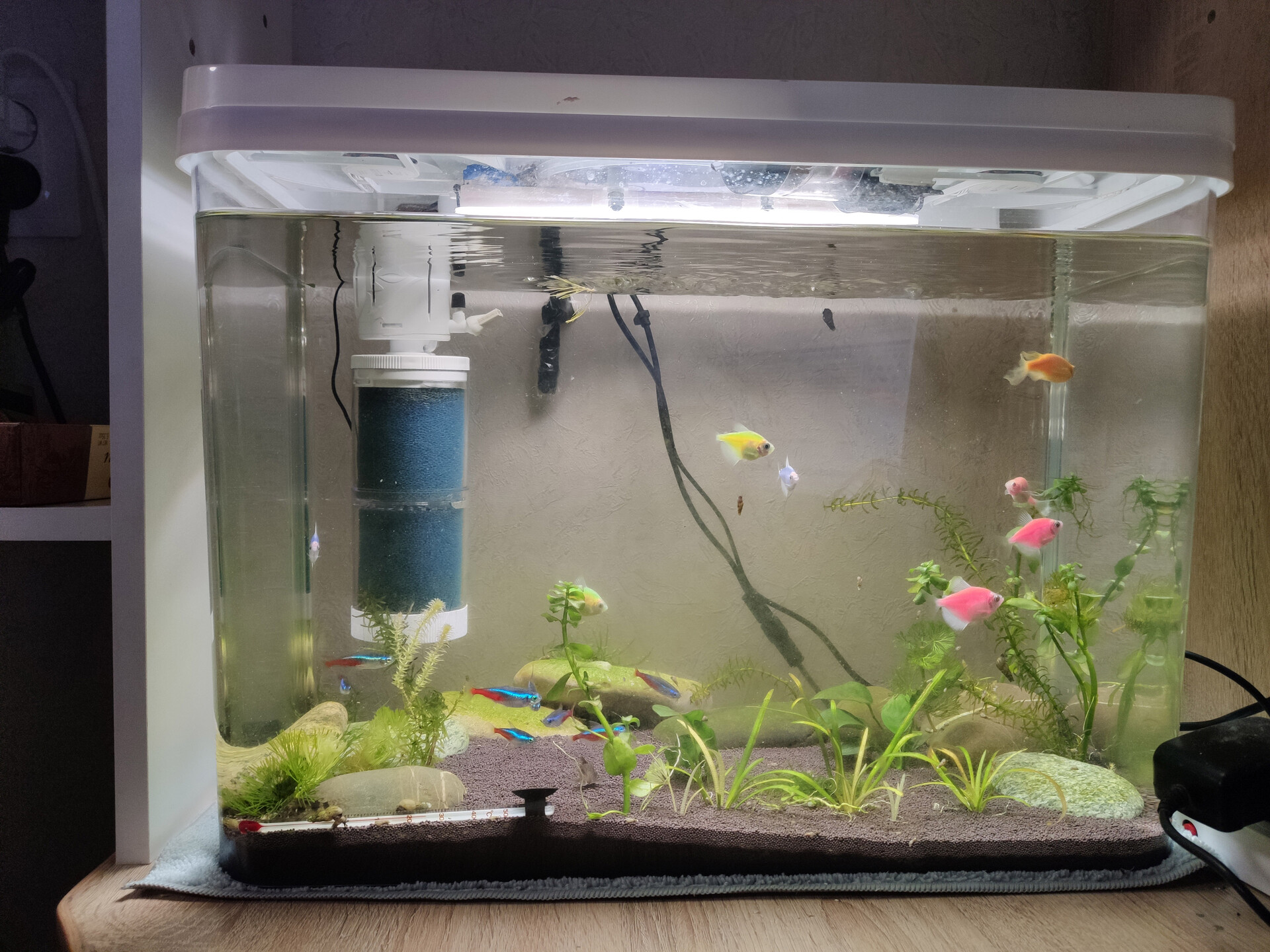 pocox 2 Жалоба Опубликовано 28 октября Мне надоел со своими поломками насосов ( 2 штуки поменял ) и своим малым объёмом , купил на али заготовку-аквариум 50 литров (2300р, ждал месяц) , добавил насос с Озона IPF-010 (400р 500л/ч), приклеил свет, кормушку, плату управления с нашего Сяоми. В течении 3 недель добавил автоохлаждение ( многим это лишнее, а у меня квартира очень жаркая), модернизировал насос (добавив ещё секцию фильтра и секцию насадки флейты ) а также сделал скиммер прямо в насосе. В общем очень доволен - всё автоматизировано - уже 2 раза автовключалось охлаждение (включается при 25,6 градусах, отключается при 24,4) ну и конечно на следующей неделе выкину траву и приклею фон , убавлю свет ( появилась зеленка- аквариум ещё запускается ) 2 Nevidimka и AlexLi отреагировали на это Поделиться сообщением Ссылка на сообщение