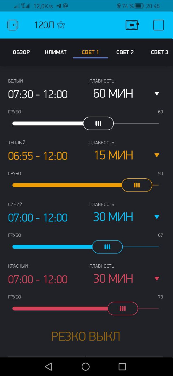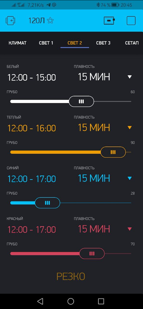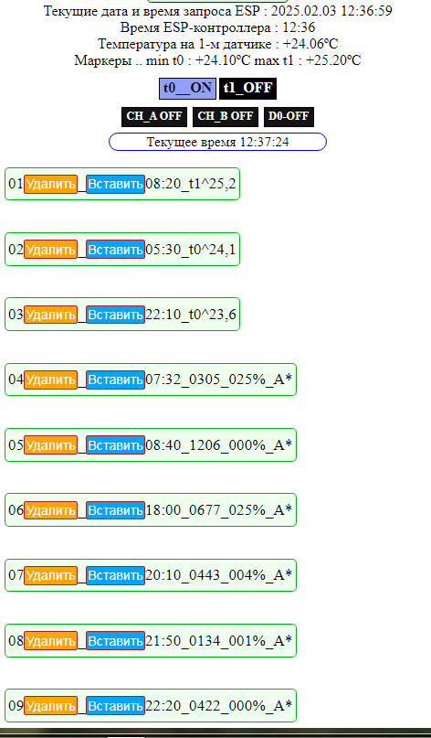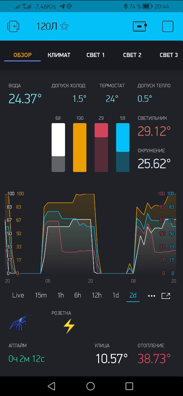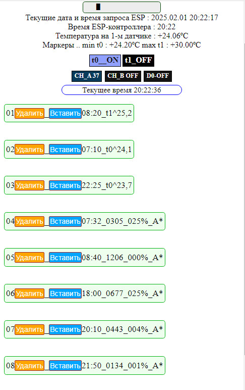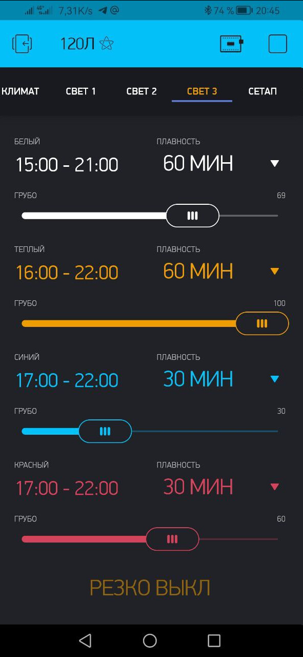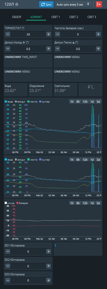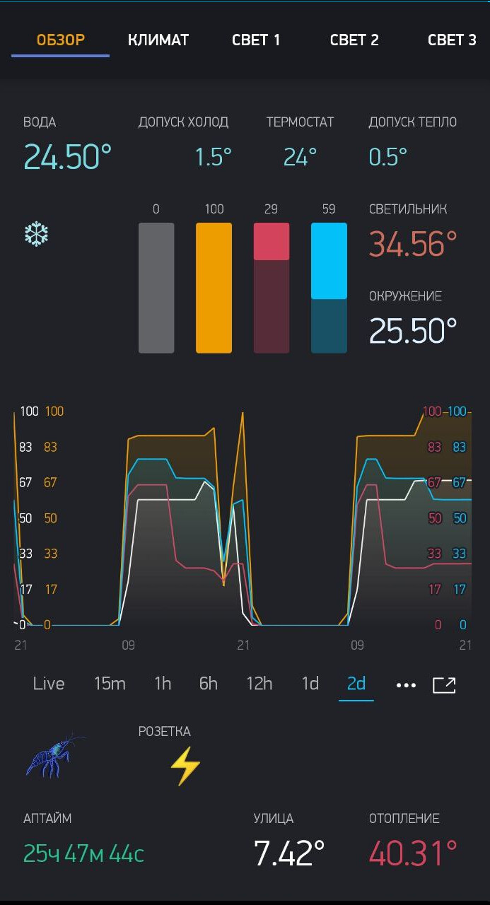 Lx671 389 Жалоба Опубликовано 25 января Ну вот здесь можно посмотреть и позадовать параметры для управления контроллером для аквы. Конфигурация рассчитана на 2 лампы (каналы A и B) с плавным управлением, 1 нагреватель(t0), вентилятор (t1) - можно менять температуру в течении суток X кол-во раз. И D0-устройство вкл/выкл. Это не эмулятор, обмен данными через 20 сек. До 17-ти часов на проверке. Глюки смотрю)) Поделиться сообщением Ссылка на сообщение