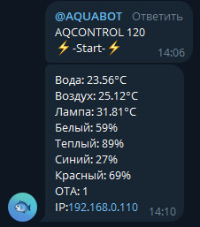 VALKNUT 3842 Жалоба Опубликовано 1 февраля Управление аквасом заиграло новыми красками.. Использовать бота телеграм, это не новость конечно и примерно с 21-го года я получал уведомления в телегу о включении контроллера и изменении режима климат-контроля. Иногда использовал команду-запрос, чтоб получить информацию о текущем состоянии в акваасе.. Сейчас немного пересобрал все исходники, библиотеки и прочее-всякое. Очень показалось мне здравой мысль управлять параметрами через телегу.. Пример запроса.. А можно и нужные параметры устанавливать... и термостат и гистеризис и интенсивность нужного канала.. /полезное/ Поделиться сообщением Ссылка на сообщение