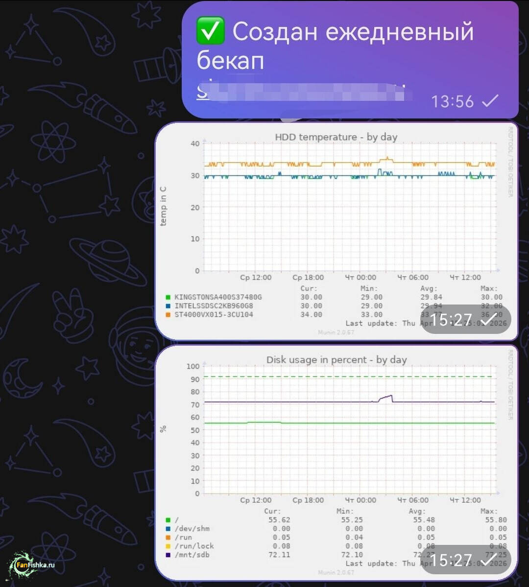 VALKNUT 4289 Жалоба Опубликовано 2 апреля Время социальных ограничений привело меня к заботе: как получать уведомления от серверов, роутеров И! Аквариумов (Arduino и ESP), в Мах, вместо упокоенного Телегушки? На данный момент в Мах мне уже приходит информация из Windows, из Linux и из RouterOS (роутеры MikroTik). Осталось отправить хоть одно сообщение из ESP32 и для меня этот "переломный" момент можно считать закрытым. RouterOS cURL Windows (cmd) cURL Linux (bash) Но! Пока есть куча но. И желание заборцевать их. ESP, я иду к тебе. /ЗЫ Почему здесь (в этой теме)? Всё просто, мои аквасы постоянно мне рассказывают о своем состоянии (охлаждают или нагревают воду). Ну и просто я люблю такой контроль над устройствами. 1 Поделиться сообщением Ссылка на сообщение