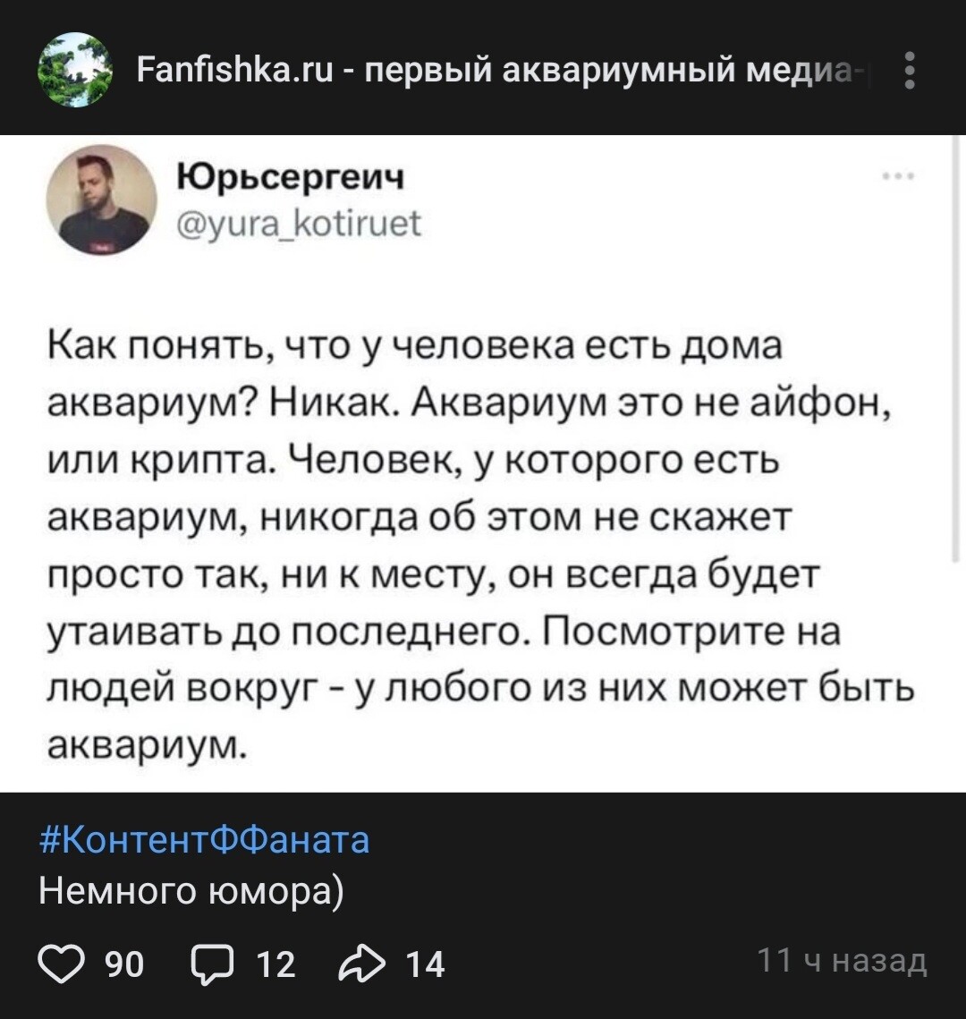 Меня часто спрашиваеют, что читаешь? Народ обычно скролит тик-так, лицобук, стограмм, а у меня текст. И графики со схемами. Недавно выдал: "техническое оснасщение аквариума". Реакция была о_О. И началось заливание ерунды мне в глаза...