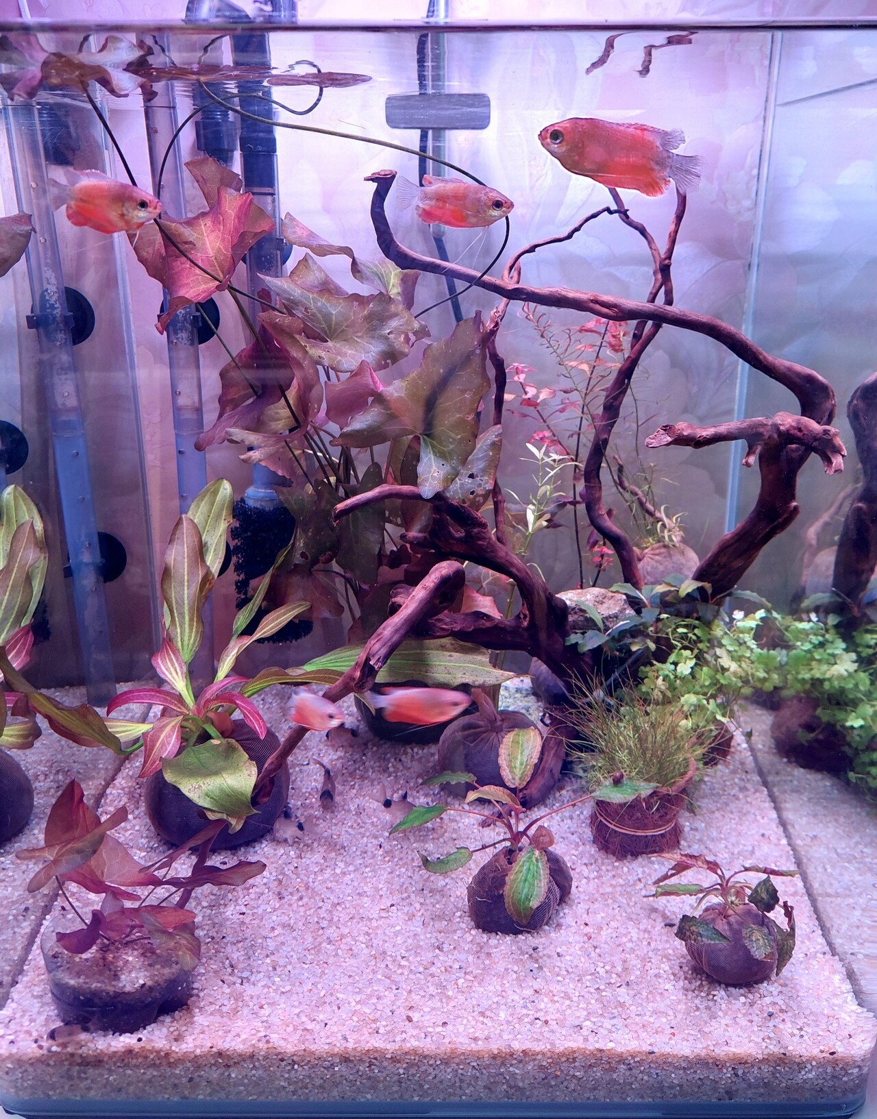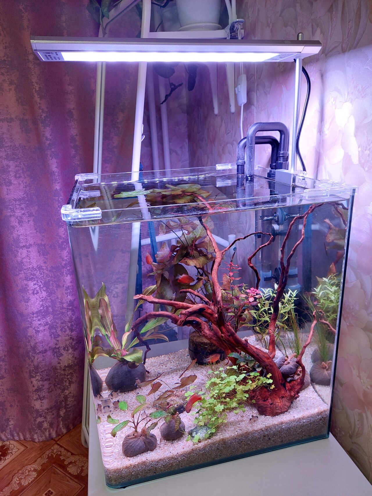 Gala17 5001 Жалоба Опубликовано 26 декабря, 2024 Ура! Сегодня привезли светильник наконец-то, после двух переносов доставки. Первое впечатление - тяжёлый! ? Приложение установилось без проблем. Функционал бедненький по сравнению с чихом. Настройки выставила легко! (Благодаря честно стыренным у Геннадия ?). Мощность получилась чуть больше по ваттам, чем была на временном чихе, да еще продолжительность увеличила на два часа. Будем наблюдать))) Картинка в общем нравится. ? Теперь вопросы к опытным юзерам. Зачем в комплекте две стяжки? Не придумала, куда их можно было бы применить на светильнике. ? Оказалось, что основание викаквы даже чуть выше, чем у чиха. Меня и чиховский пластик в воде слегка коробил, а тут "люминий"))) Ничего, что он всегда "по колено" в воде будет? Не доливать до него - не комильфо, да и @Demetris ругаться будет))) Ну, и фоточки под новым светом ? Интересно, что вживую цвета воспринимаются гораздо теплее, чем на фото, нет вот этой синюшности)) 10 ЛаГГен, Nevidimka, Grolf и 7 люди отреагировали на это Поделиться сообщением Ссылка на сообщение