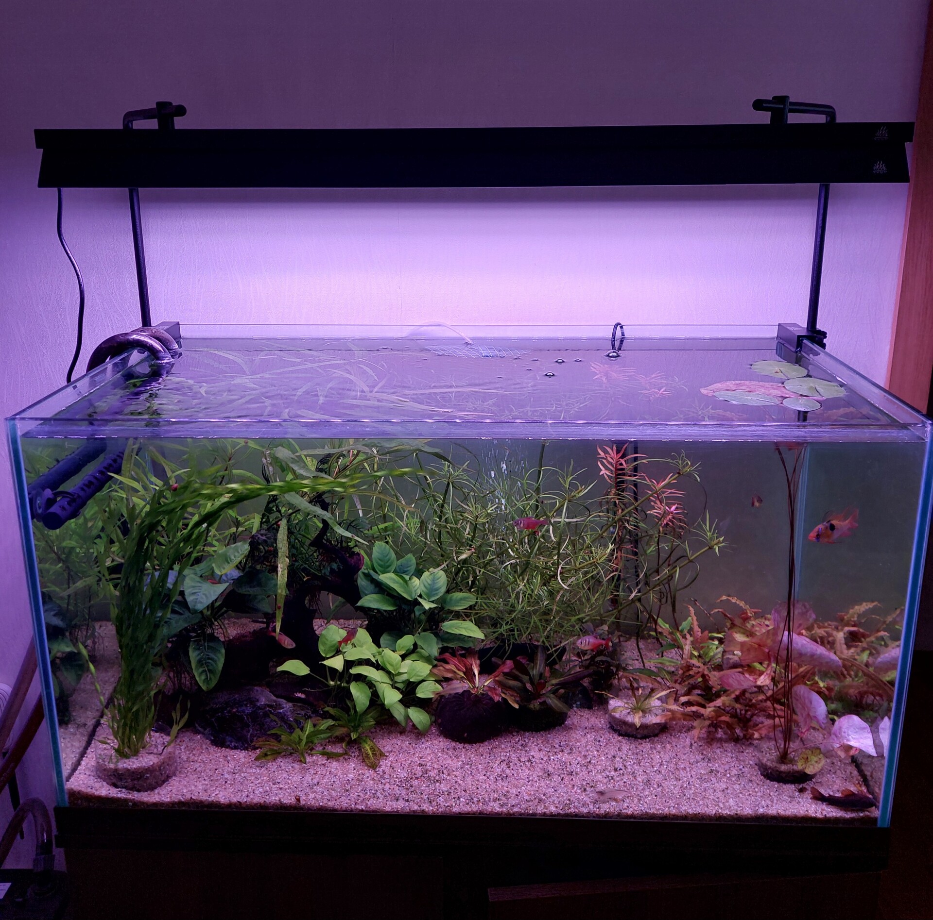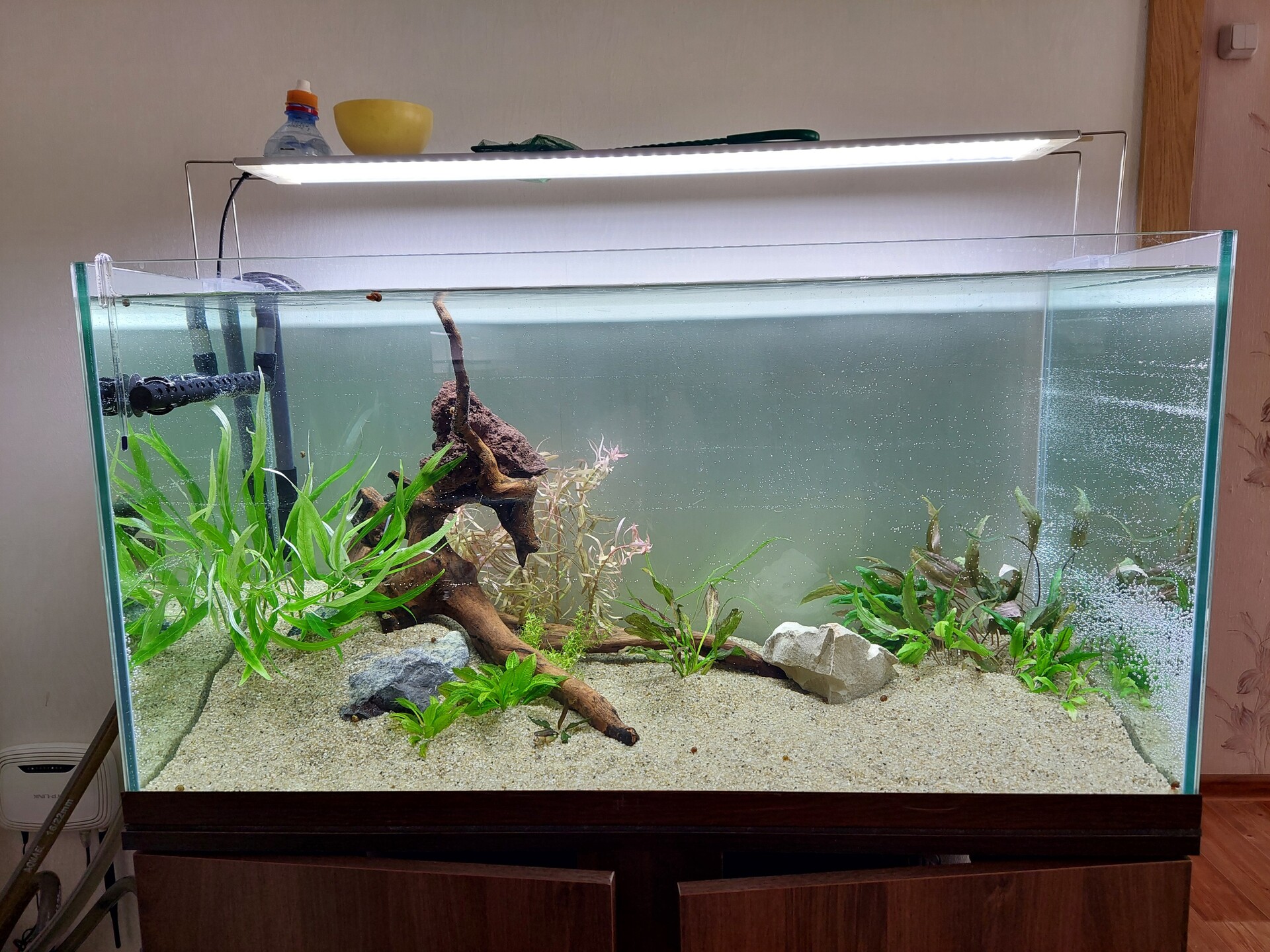 Gala17 5001 Жалоба Опубликовано 16 мая Итак, установила светильник. Высота, глубина выверены линейкой до миллиметра, угол поворота стоек - на глаз. ? Выглядит с непривычки монументально, если не сказать - монструозно, особенно в сравнении со стареньким сереньким чихом))) Но!! При первом же включении светильника аквариум заиграл красками! У меня никогда прежде не было таких красных рыб и растений! ? И это оказался всего лишь пресет Green! Поиграла пресетами и выставила свои настройки, начну с 45%, попробую еженедельно понемногу прибавлять. Что сказать? Я очень довольна! Спасибо всем коллегам, что словами и личными примерами убедили поменять свет. Нашла старую фотку с чихом ? Это год назад, сразу после перезапуска. А настройки пока такие 13 shkush, Nevidimka, Lemmonbri (Егор) и 10 люди отреагировали на это Поделиться сообщением Ссылка на сообщение