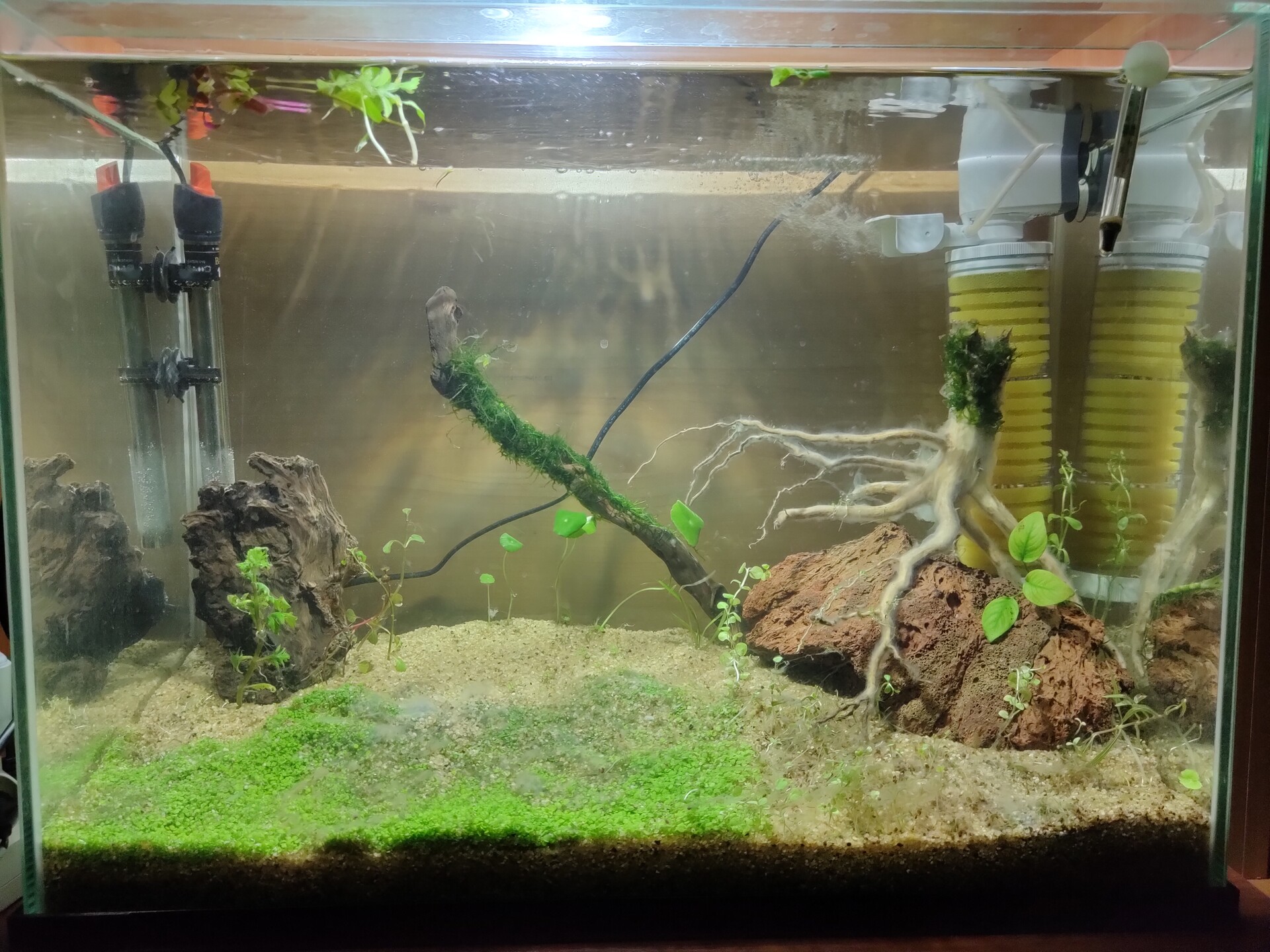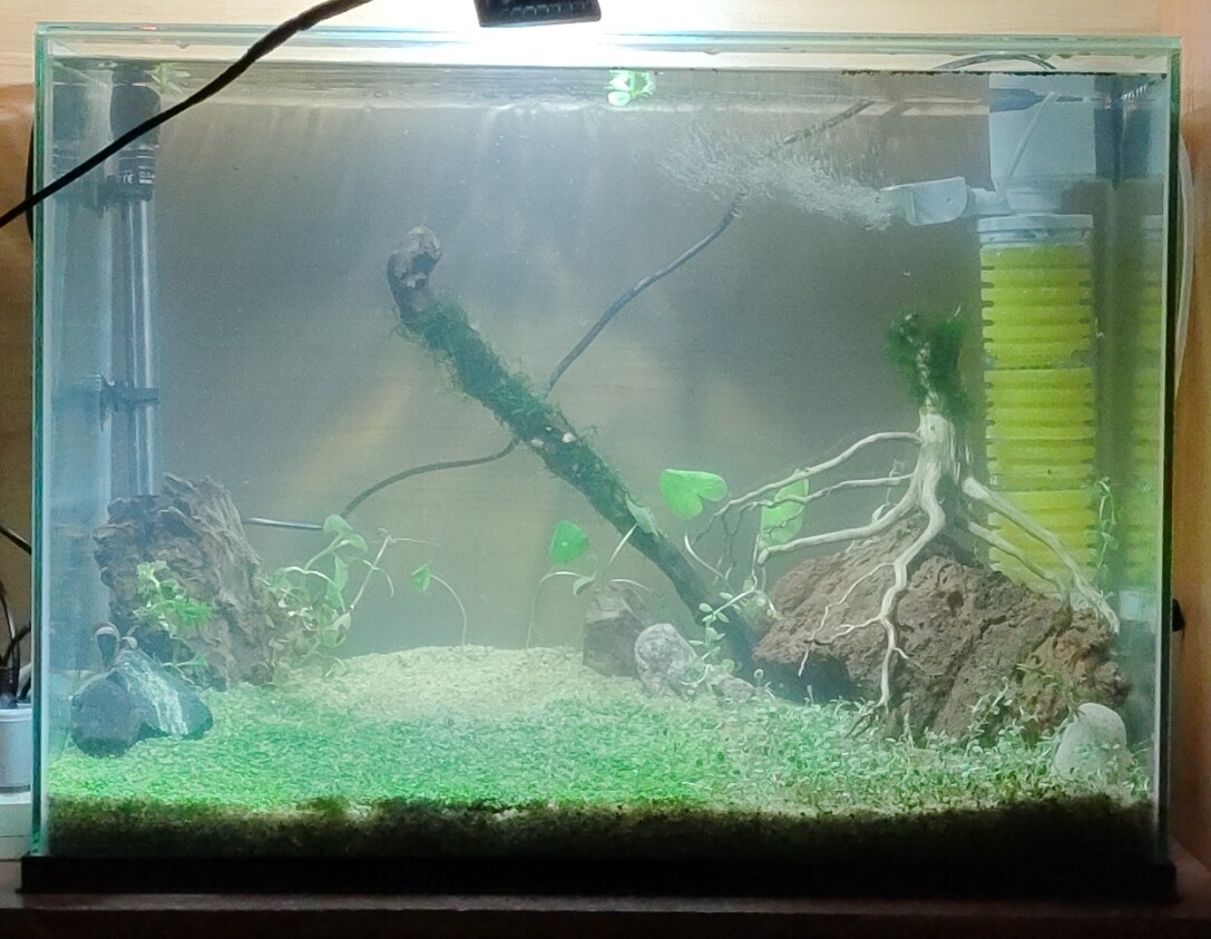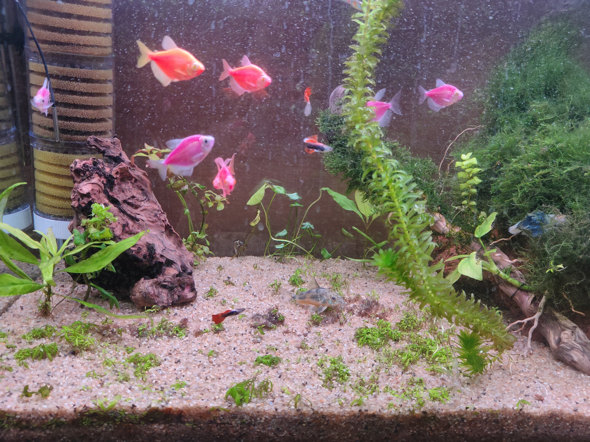 И снова здравствуйте! Аквариуму 1,5 месяца (с 21.04.2025г), при запуске рыб всё было хорошо, вода не издавала лишних запахов, тесты в норме, растения начинали приживаться. На сегодняшний день вернулась проблема как и из старого аквариума - эдагониум! Покрыл листья некоторых растений, и стекла аквариума.  Добавила удобрения, а затем прибавила свет - со стенок аквариума пушок ушёл, но на листьях растений цветет как ни в чем не бывало. Ещё и  вода пахнет затхлой речкой или что-то вроде того, в старом аквариуме такого запаха не было.