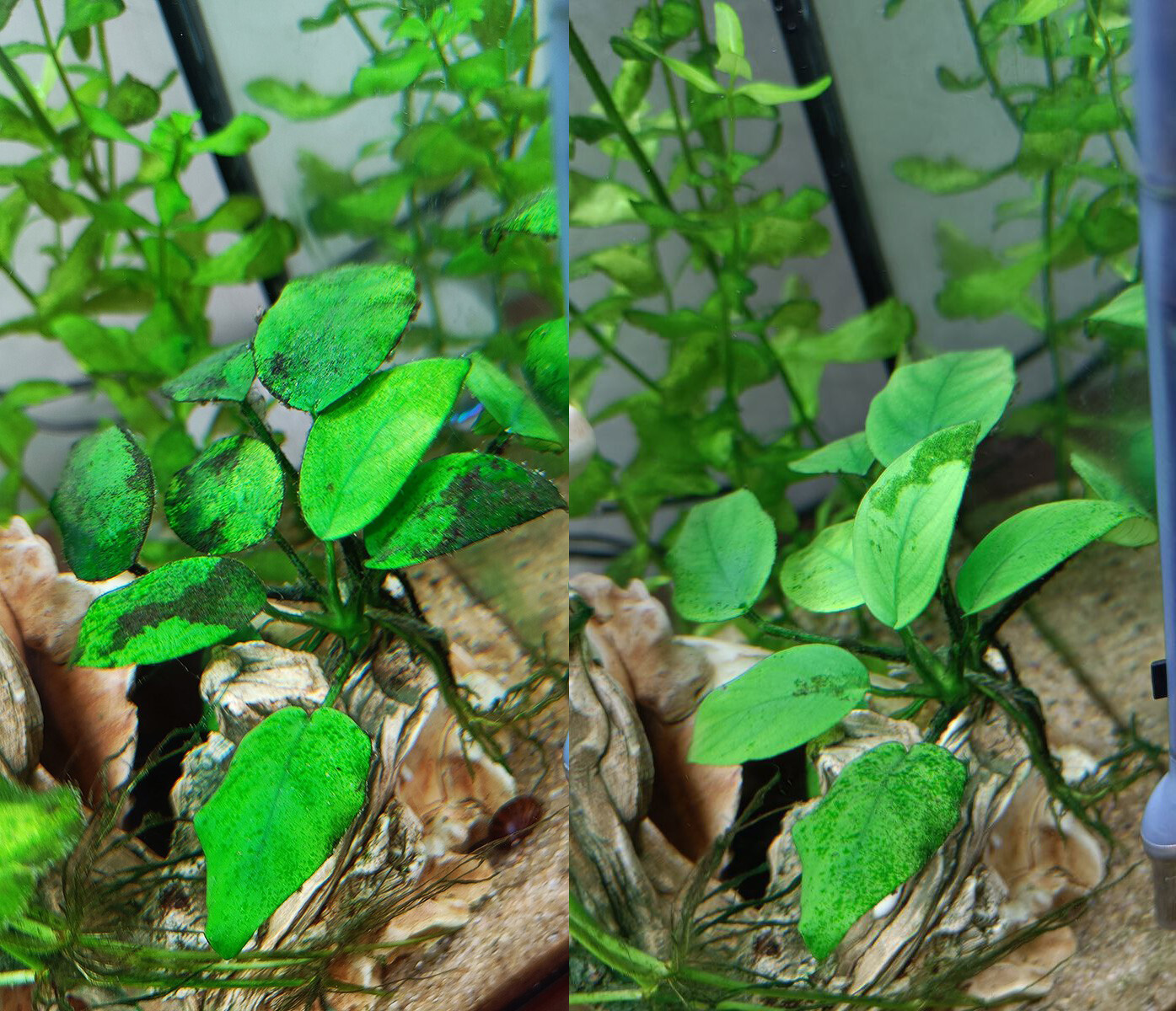 Делаю очень мягкие обработки альгицидом ("Algae prevention" от  Water Sci). Доза ниже профилактической, но обработка чаще их схемы. Брала по 5 мл (на мои 42 л чистыми) два дня подряд, потом  подмена воды 20%. Через 8 дней ещё раз два дня по 5 мл и подмена воды. Улиткам такая доза ок, не вызывает даже попыток отсидеться. Черные водоросли снимает на ура. Анубиас и криптокорина практически полностью очистились.