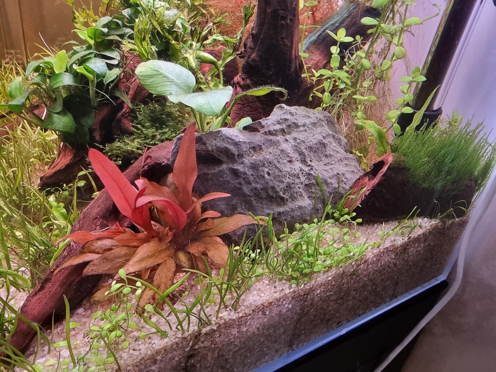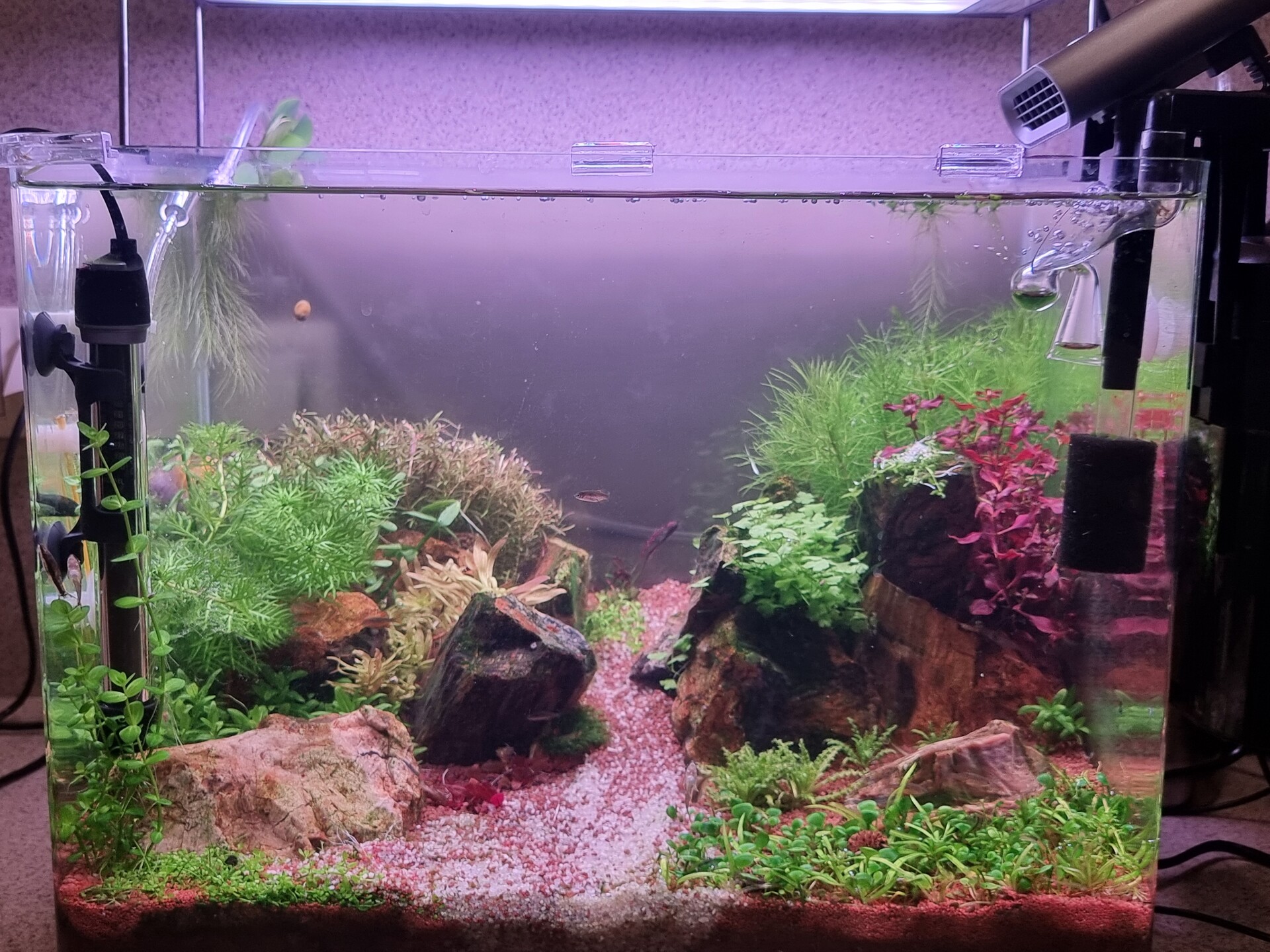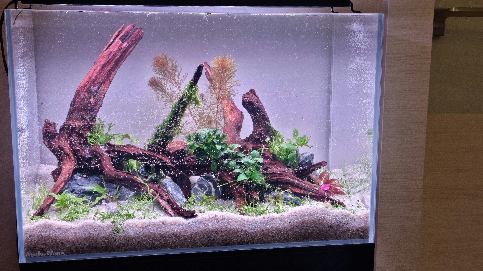 Абыч 290 Жалоба Опубликовано 17 апреля Ребяты, надо помощь) Аквас запущен 23 марта. Обьем по воде литров 27 наверно (номинал 36) Грунт кварц 3-4 мм. Свет китаец FG158 четотам, 2100 люм вроде. Светит на 80% с 18 до 24. Удо watersci NK/PK отдельно, железо 2 вариации по 0.3 мл в день (88 г/ л no3, 8 г/л po4) Co2 нет Трава: винделов, глоссостигма, чето там бразильский на "Л":) анубы 2 вида, крипт мелких два вида (пигмей и курчавая чтоли), перистолистник красный ну и по мелочи насовано , чисто посмотреть как оно без со2 и света. И мхи феникс, крисмас и пламя. Живность: 6 тернеций древних (2.5 года живут) , 2 рамирези, 2 анцика. улитки какието Тесты: No3 -5мг, po4 0.25. Запускался на старом грунте (с аквы 8 мес) и фильтр тетра экс600 гонял там же пару недель. Рыб частями селил. Вода осмос с ремом той же фирмы. Kh 3 gh 8. Тдс 230 Вопрос номер 1: ph тут 7.4-7 5. Камни могут влиять? Шипели в уксусе бодро, но их штук 5, весом грамм 400, решил рискнуть. Вопрос 2. Появились синезеленые дня 4-5 назад, облепляют растюхи, на грунте нет. Как я понимаю изза органики от коряг? После запуска вода цвета крепкого чая была, сунул пакетик пуригена в фильтр, стала норм. Памятуя что он не безграничен и начинает потом отдавать- недельку назад вытащил и почистил в белизне. Очаги вытаскиваю сифонкой, но на след.день новые нарастают. Подмены по 3 л делаю. План: щас засунул снова пуриген, 2-3 дня, понаблюдаю, так же сифонка очагов, замена 3л воды. Если нет - четверть таблетки эритромицина залью. Что думаете? Это запуск и вот сегодня Поделиться сообщением Ссылка на сообщение