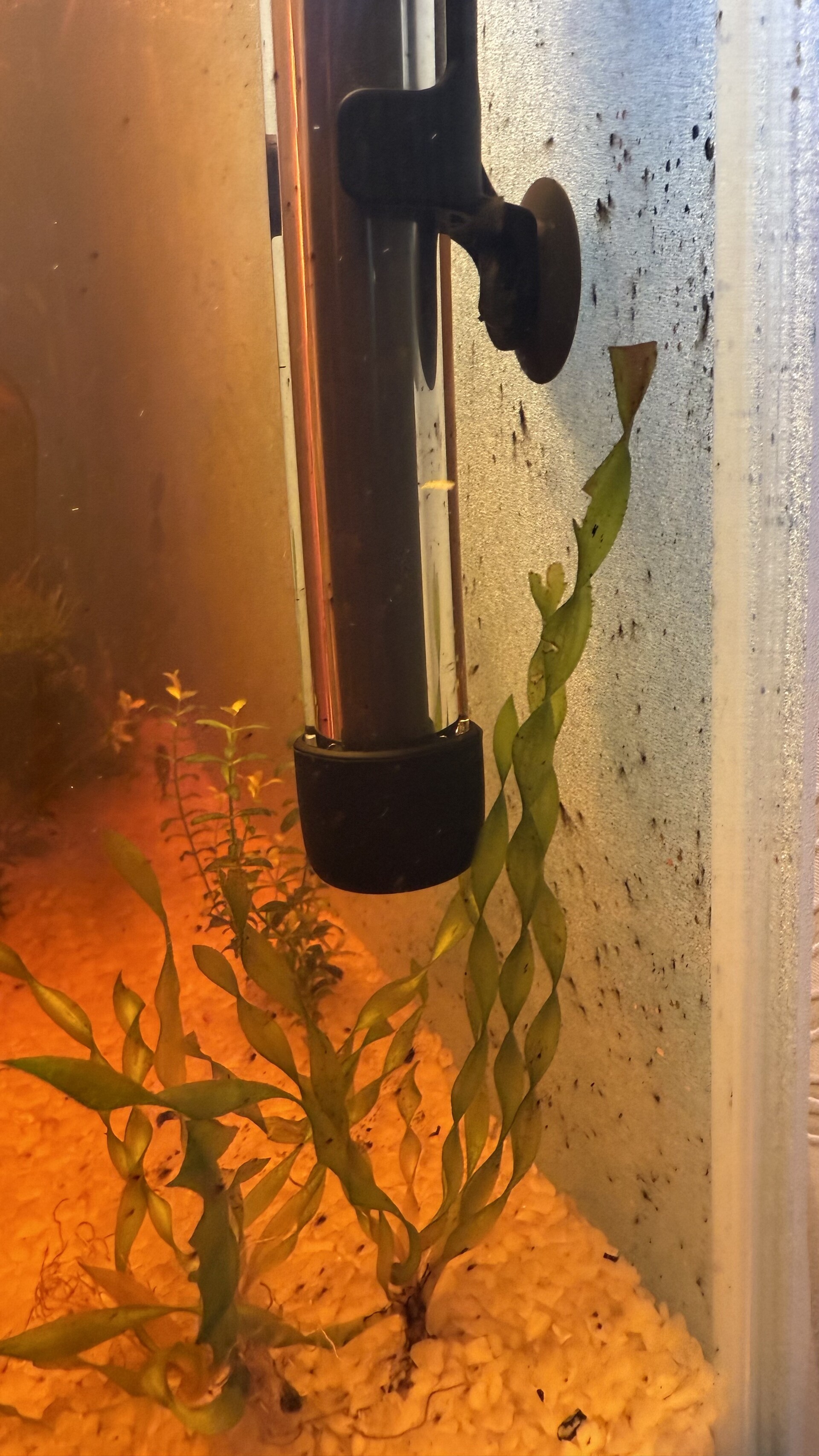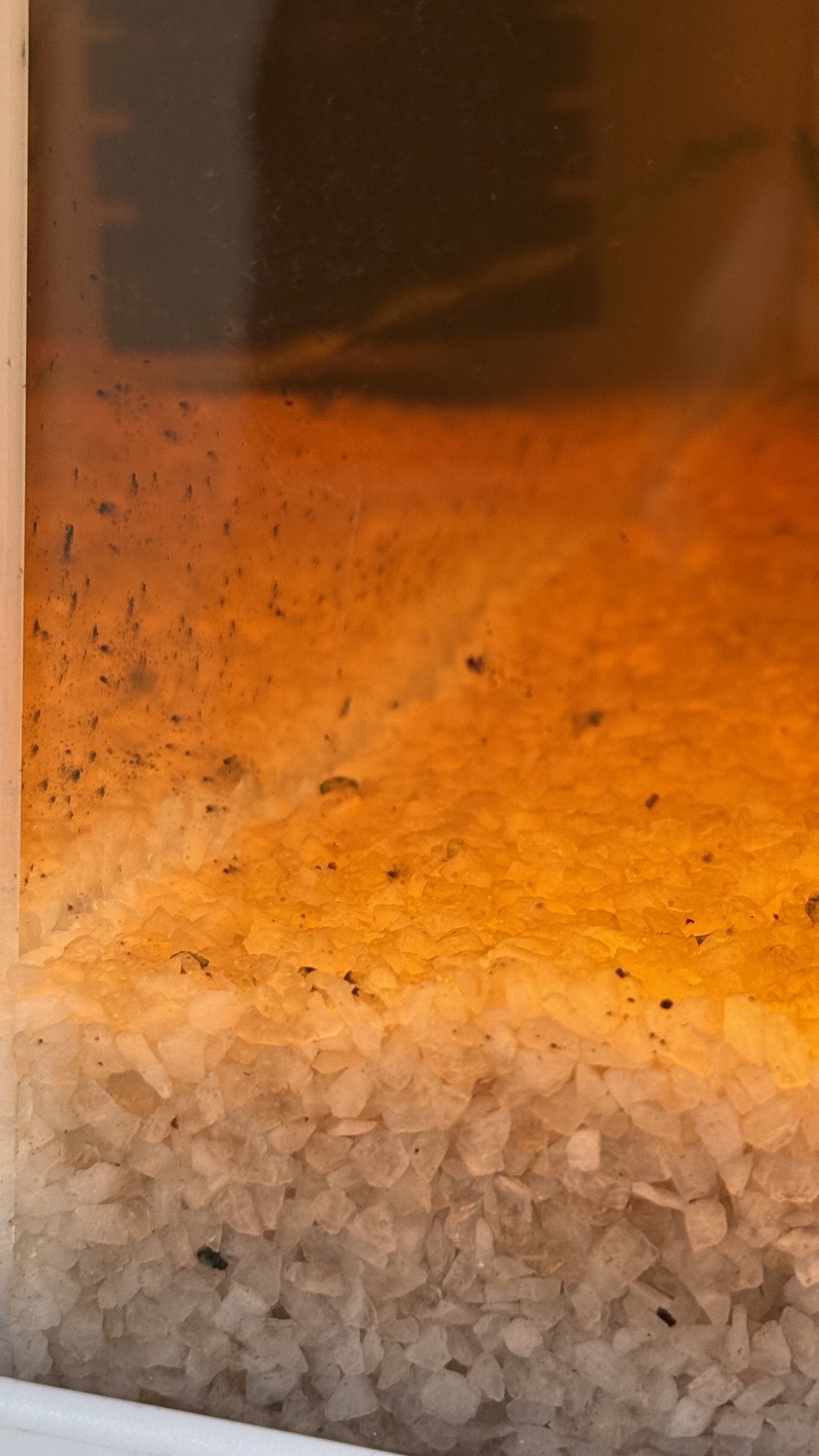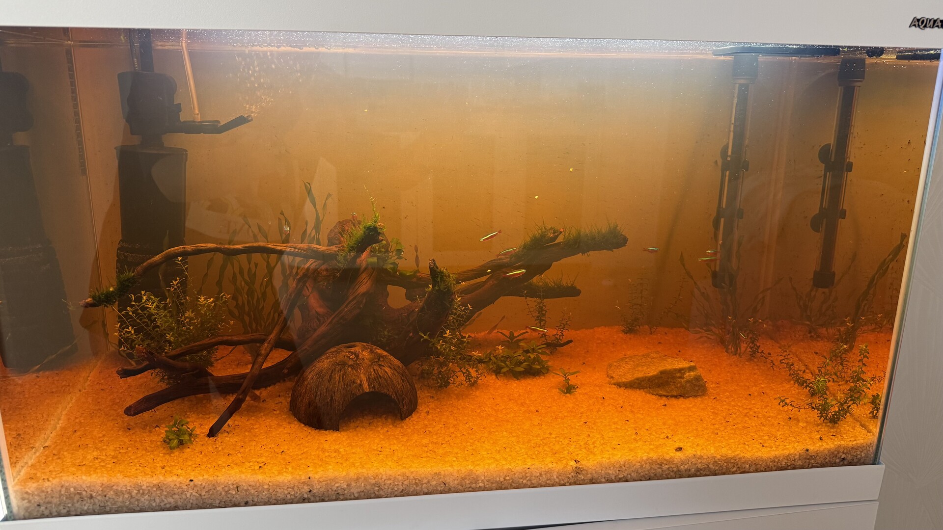 Nickoletta 0 Жалоба Опубликовано 16 апреля Дорогие опытные аквариумисты. Нужна помощь новичку. Опишу более-менее подробно запуск, веду дневник для себя, чтобы ничего не упустить. Вероятно, что-то делаю неправильно, или не делаю чего-то нужного…. Фото прикреплю ниже Запуск аквариума 20.03.2025 Aquael 125 л. Лава в мешочках 2 кг Грунт кварц-20 кг. Коряга (корень азалии) + мох Фильтр Aquael Turbo 500 Baсtozym в корзину фильтра Свет -2 лампы по 1270 лм. t- 25 22.03.2025 вода стала тёмного цвета, как крепкий чай. 27.03.2025 сделала тесты Vladox (вода из крана) gH-2 kH-18 pH-8 PO4-0,25 NO3-10 NO2-0,15 NH3/NH4- 0 Подмена воды 10-15% Губку фильтра заменила на мелкопористую, побольше размером Добавлены растения: Валлиснерия спиральная 10 шт Анубиас нана на корягу 2 пучка Хемиантус 2 пучка Стаурогина репенс Рыбы: Неоны красные 10 шт. Сом Неретины зебры 5 шт Корбикулы 2 шт Корм Tetra хлопья Периодически раз в несколько дней делала тесты, результаты всегда примерно одинаковые (такие, как выше) Подмены воды по 10-20% Слизь на коряге ест сом и улитки. 30.03.2025 одна улитка закрылась и умерла. Валлиснерия стала прозрачной, неяркой. 02.04.2025 Под растения добавила таблетки Нилпа Микротабс 04.04.2025 Добавлены 5 крапчатых коридорасов Вода мутная коричневая, добавила кристалайн 10 мл. В корзине фильтра керамические кольца заменила на синтепон (кольца пересыпала в банку и залила водой из аквариума). Через сутки вода хорошо очистилась, синтепон был сильно забит коричневой взвесью. Заменила на чистый. 09.04.2025 Вода снова сильно помутнела и потемнела. Оставшиеся 4 улитки умерли одновременно практически. Добавлена еще 1 лампа 1200 лм Тесты: gH-4 kH-13 pH-8 PO4-0,15 NO3-2 NO2-0,15 NH3/NH4- 0 10.04.2025 Вода стала еще темнее и мутнее. Заменила 30% воды. На стенках аквариума появились черные точки. Практически невозможно оттереть губкой. Вернула кольца корзину фильтра, вместо синтепона. 16.04.2025 Вода мутная и коричневая. Черных точек на стеклах становится больше. Просто точки, без волосков. gH-4 kH-15 pH-8,5 PO4-0,1 NO3-1 NO2-0,01 NH3/NH4- 0 Вопросы: Сколько может красить коряга (никогда не слышала, что корень азалии может красить воду, обычно красят мангровые)? Что это за точки? Думала на бороду, но волосков нет. Как помочь растениям? У хемиантуса листики белеют, валлиснерия или прозрачная, или коричневая, у Анубиса листики скручиваются, только мох более-менее себя чувствует. Добавить удобрений? Боюсь навредить, и получить водорослей, т.к. Не знаю, сколько и чего правильно добавлять. Изучила массу статей, но почти все про удобрения заканчиваются словами «но вы можете получить водоросли, если неправильно нальете…» Хочу добавить больше растений, но боюсь, что им тоже станет плохо, как уже имеющимся. Живность пока тоже больше не добавляю, т.к. жду, когда устаканится все. Хотя тесты показывают все ок. Смущает kH высокий, тоже непонятно, как уменьшить. Разве только kH- какой-то добавлять… Есть ли другие варианты? Осмос дома есть только «человеческий» с колбой реминерализатора. В общем, буду признательна за любые советы и наставления. Очень хочется красивый и здоровый аквариум с радостными питомцами и колосящейся зеленью Поделиться сообщением Ссылка на сообщение