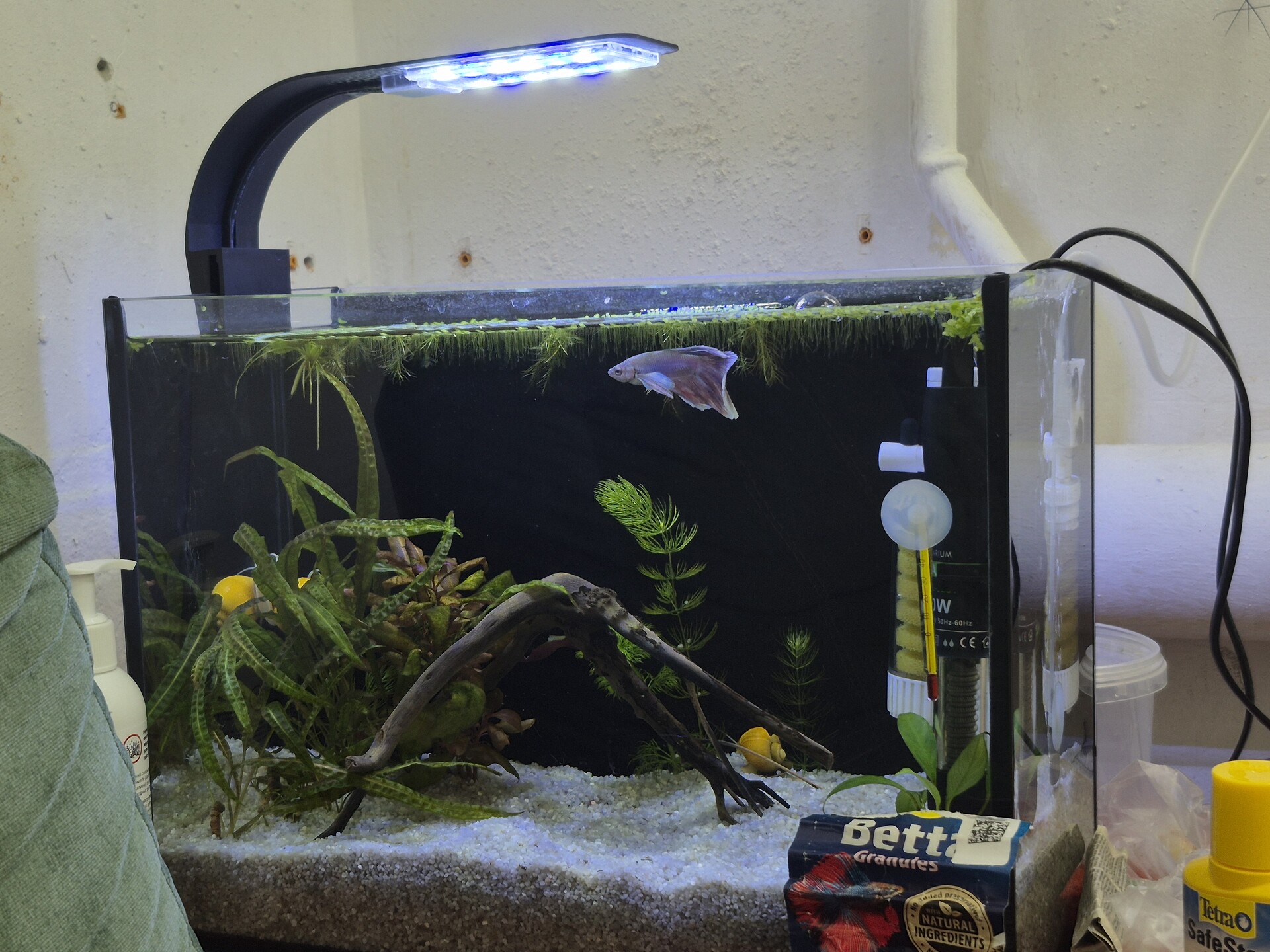 GlintveiN 2 Жалоба Опубликовано 17 мая Здравствуйте, перезапустила аквариум 20л в начале мая, просто пересадила все в новую ёмкость (из круглого в квадратный) и изменила грунт на Dennerle Crystal Quartz Gravel ~5-7см. 35% воды подменила отстоянной, и добавила немного SafeStart. Растения ряска и несколько плавающих листиков, криптокарина, роголистник, лимнофила и ещё какое-то красное. Есть коряжка для сомика, из зоомагазина. Подмениваю воду 2 раза в неделю по 10%, последний раз 15 мая (сегодня 17 мая) Вода отстоянная, с добавлением небольшого количества кондиционера AquaSafe. Фильр с аэрацией есть, чищу по мере загрязнения губки в аквариумной воде. Вода 26°С. Тесты тетровские полоски, все в норме. Население сомик анциструс звездчатый ~3,5см, 4 улитки ампулярии и петушок. Купили петушка 12 мая, к сегодняшнему дню начал слипаться второй плавник. Что делать? Не вижу на нём ничего подозрительного кроме поведения. Сидит в углу у воды или под терморегурятором, привыкает или плохо ему. Кушает нормально, пока только корм в гранулах для петушков, в ближайшее время приобрету замороженный/живой корм. (Последнее фото, каким он был при покупке) Пожалуйста помогите, это подарок, не хочется потерять такого красавца((( Поделиться сообщением Ссылка на сообщение