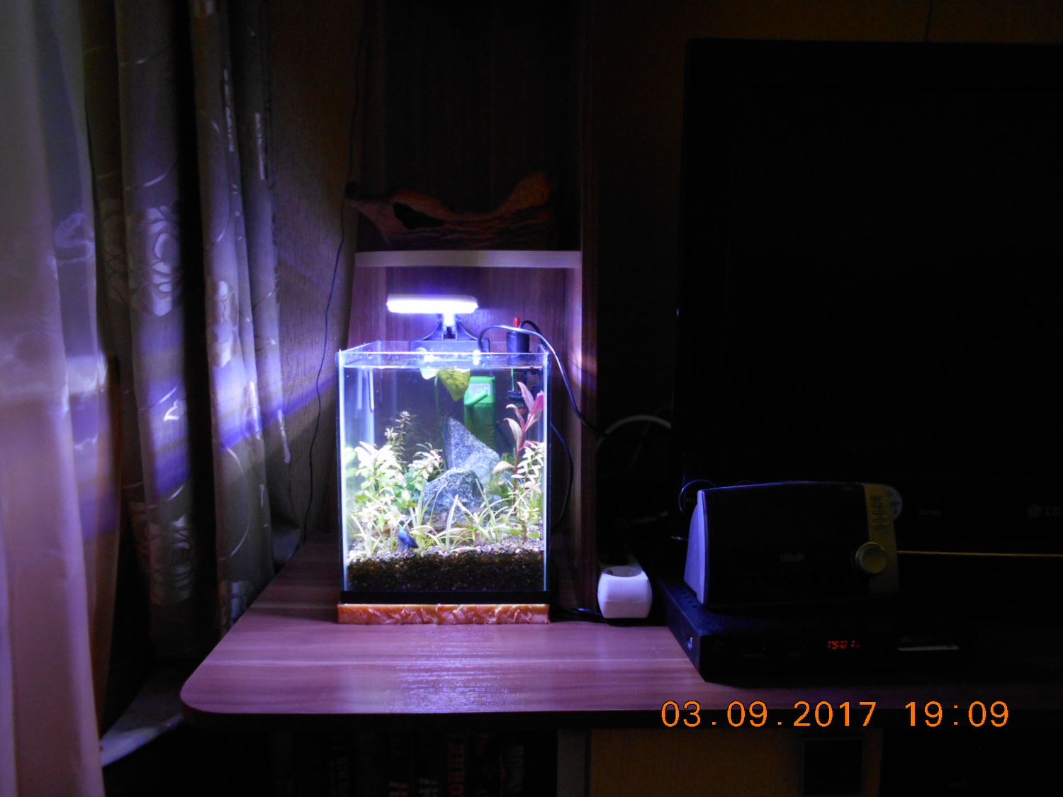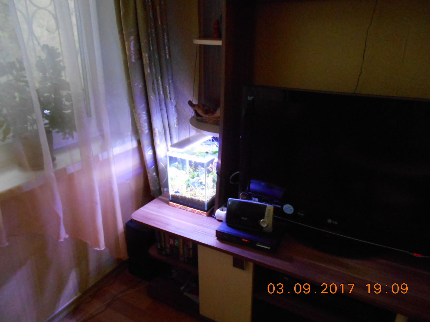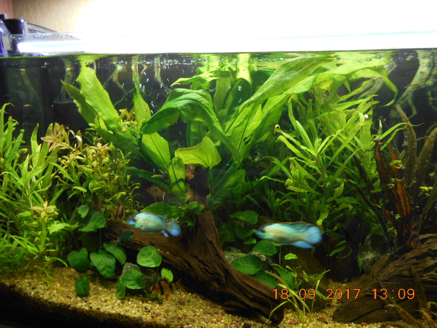 Екатерина Александровна 2846 Жалоба Опубликовано 12 сентября, 2017 После добавления света в 300-литровом прошло пять дней. Наверное, рано еще еще говорить о результатах, но кое-какие изменения есть. Свет включаю, как и раньше, с 17 до 22 часов. Заметила, что черный налет на листиках превращается в рыжий мягкий налет, который легко стирается руками. Черный налет не стирается, на ощупь шершавый, и листик со временем отмирает. Это уже очень хорошо. Два эхинодоруса больших, посаженных две недели назад, не очень радуют. На каждом по одному листику превратились в сито, пришлось отрезать. Новые листики вылезли и уже дырявые. Хотя по три больших старых листа еще держаться. Амбулия в 100-литровке скорее жива, чем мертва, дает много побегов зеленых, но в рост не идет, и цвет у неё желтоватый. Положила под корни таблетки, может лучше станет. Появились новые обитатели. Из кубика 30-литрового отдала восемь подросших блондинов и самца дворняжку, а запустила самца зеленой кобры. Компот гуппяшный получился, но самец обалденной красоты. Наннакару, отсаженную в 90-литровку, отдала в воскресенье. Вернее поменяла на семь неонов . Теперь у меня снова стайка - тринадцать штучек. Один фиг из кустов не вылазят. Но их теперь в кустах видно, плавают кучненько так. И расбору докупила, а то плавают два одиночества. Трое ушли - я уже писала. Теперь восемь. Шныряют все вместе стайкой. Аквариум столитровый оживился с неонами и расборой. Воюю с внешником Акваэль МультиКани. Стоят две канистры. В одной раньше были губки крупнопористые, в другой керамика и биошары. Все время взвесь какая-то летела из выхода. Решила поставить на выход мелкопористую губку. Купила, поставила. Не могла нарадоваться. Вода чистая, как слеза. Но напооор! Падает за месяц катастрофически. Когда вскрываешь, то все губки почти чистые, чуть только заилены, а мелкопористая, как мыло, и через неё вода не проходит. Приходится часто вскрывать и мыть. Плюнула, убрала эту губку. Опять теперь какие-то микрочастички по аквариуму летают. Вот и думаю, как лучше то. С мелкопористой конечно лучше, но вскрывать каждый месяц тоже не вариант. 1 Nomaktika отреагировали на это Поделиться сообщением Ссылка на сообщение