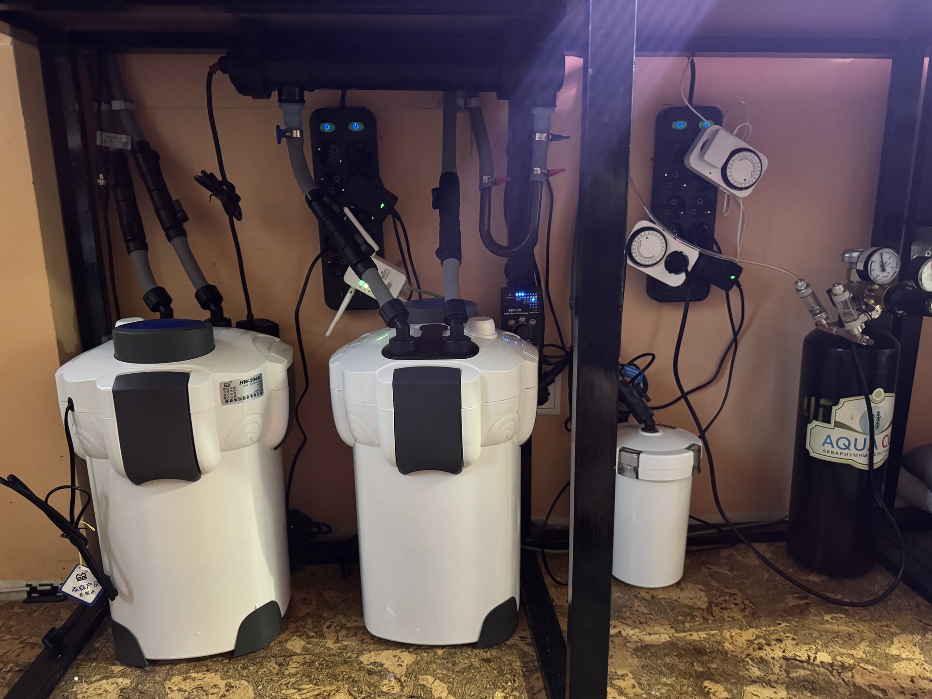 Idzumi 1782 Жалоба Опубликовано 29 июня Наконец-то получилось превозмочь себя и выделить свободный вечер, чтобы разобраться с оборудованием, розетками и раскроить пространство. 1) Фильтр для пресника на 2 этаже (сансан на 2000л/ч). Все корзины с Hel-X 2) Такой же фильтр для моря, наполнители те же 3) УФ для моря 36 вт (на всякий случай, если полезут дино или какие нибудь бак вспышки) 4) Помпа течения в море 5) Маленький сансан для 30л банки 6) Газ, кислород для обоих пресников Завтра приедет свет в море, сделаю подмену 70%, чтобы вывести фосфат, которым нафонило с живых камней и буду ставить первые кораллы. Кораллам азотный цикл не пригодился, они аммиак и нитрит не боятся. А вот повышенный нитрат и фосфат не любят. 5 1 ЛаГГен, Ника, Пятница и 3 люди отреагировали на это Поделиться сообщением Ссылка на сообщение