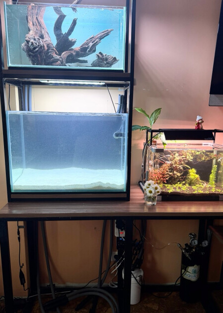 AnaAna 5505 Жалоба Опубликовано 3 июня В 01.06.2025 - 23:02, Idzumi сказал(а): Всех приветствую! Наверное, пора завести себе нормальную отдельную тему про домашний (-ие) аквариум (ы). Собралась я наконец то с мыслями и приступила к двойному запуску двух банок - моря 100л и травника 50л. Долго меня ломало, и я ленилась, но.. надо, значит - надо! Собственно.. Отмыты банки, поклеены фоны, шланги прикручены к стенам на крепления, песок в море намыт, море засолено, помпа подключена, коряги в преснике на отмачивание отправлены, вода везде залита. С бубнами тоже отплясались: поклейка фонов из меня всегда всю душу вынимает, кое-где стены поштробили, морока, короче... Весь процесс собрала в 30сек видеоролик, глянуть можно здесь. Было Стало За компанию к маленькому аквариуму были подведены "сложные" сантехнические конструкции Под тумбой нас пока встречает Бангладеш, и это еще фильтры и УФ не прикручены Далее по плану ждем приезда фильтров и УФ... @Idzumi а можно немного подробностей про море? Или отсылки на толковые источники о запуске и тонкостях содержания? Вообще тема интересная, но во всяких дзенах и т.п. статьи из серии "море для чайников" в лучшем случае повторяют друг друга, и насколько там адекватно, судить не получается ввиду отсутствия знаний и опыта. Если бы параллельно с запуском было бы немного пояснений о тонкостях из разряда отличий от пресника, было бы классно! Поделиться сообщением Ссылка на сообщение
