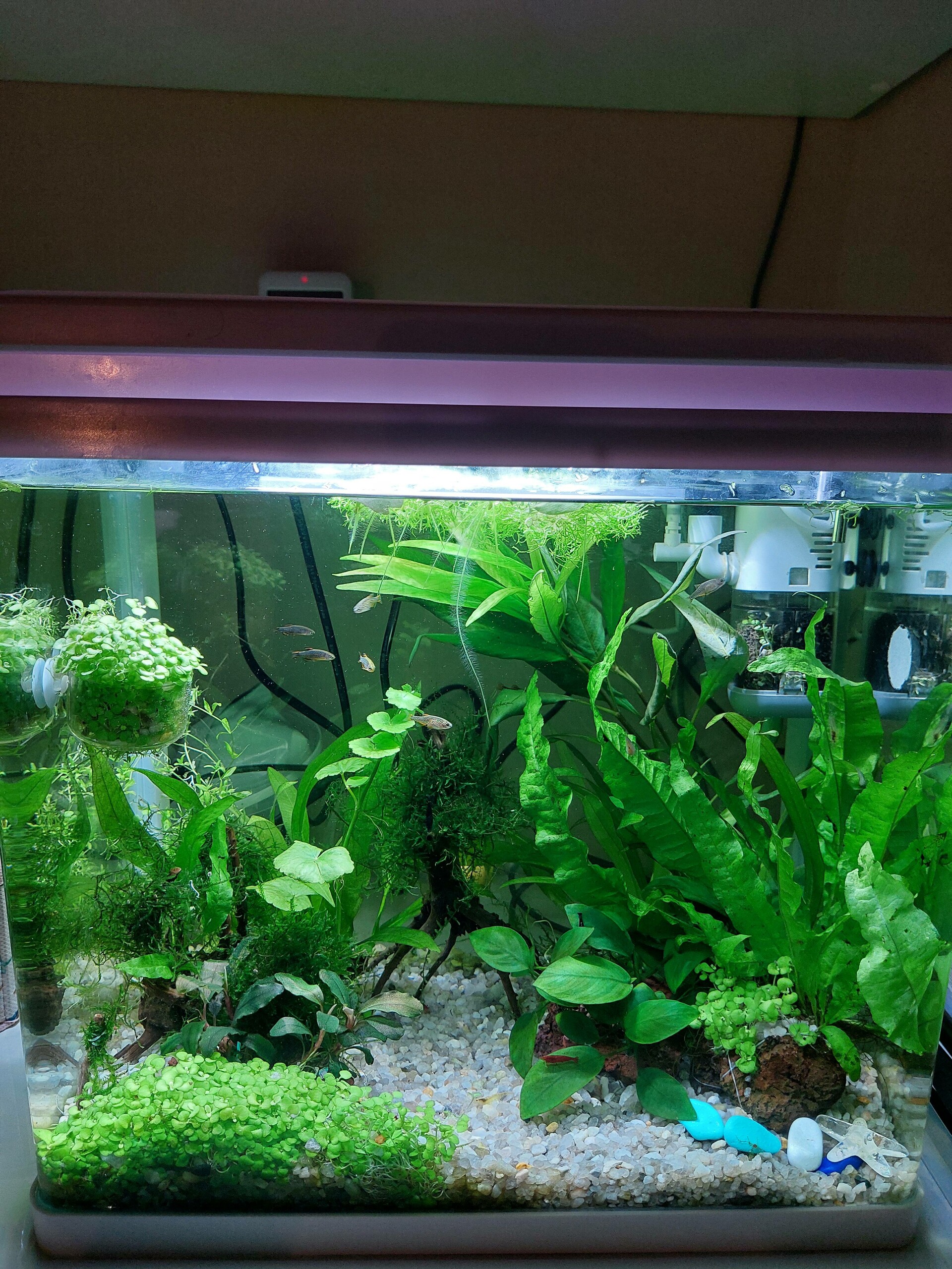 Василиса 191 Жалоба Опубликовано 8 июля Изначально аквариум на 22 литра был куплен в комплекте с фильтром и светильником (все китайского производства). Но когда, я начала активно высаживать очень неприхотливые растения, стало понятно, что им не хватает света....Листики анубиаса прям заметно посветлели ...гидрофила иволистная, вместо бордовой стала зеленой, верхние листочки активно тянула к этой несчастной лампочке, а нижние листочки вообще остановились в росте.. .Аквариум с крышкой, и там прям наглухо вмонтирован/встроен китайский светильник, который включается сенсорной кнопочкой на крышке, поэтому , рядышком с ним примостила то, что смогла вместить по параметрам, подошел Светодиодный светильник для аквариума бренд AQUAEl - LEDDY TUBE DAY & NIGHT 2.0 7 Вт Цветовая температура 7000 к, световой поток 730 Лм. Я не знаю какие были параметры у китайского коллеги по свету, но яяявно меньше ))) Эхх, так ярко всё вдруг сталои световой день был выставлен аж 10 часов...и через 3-4 дня анубиас покрылся ксеном, на стенках аквариума зеленые точки Был тотчас собран семейный консилиум Было решено единогласно, что света много...и все разошлись Вообщем, взяв на себя ответственность по длительности светового дня , легким движением руки был установлен вот такой режим : с 9.30 до 13.30 с 18.30 до 22.30, члены консилиума, правда поодиночке , одобрили. В итоге, сейчас вижу, что растения вроде довольны, анубиас приходит в себя, зеленые точки не появляются....ну во всяком случае, пока... А дальше...а дальше китайский фильтр -помпа с флейтой, решил, что свои часы он отработал...и выключился Ой...какого труда стоило туда подобрать что-то....Там еще под крышкой отсек для губки лежит, в нее льётся водичка из флейты...все эти трубочки и прочее входит и выходит из специальных отверстий... Примостила туда я вот это чудо : Внутренний фильтр для аквариума WaterBear с флейтой 8Вт производительность 500 л/ч ( на фотке выше его можно увидеть). Нууу...честно, он тоже обошел китайского коллегу . Главное, что все эти трубочки в пазл сложились , в банке от аэрации нет урагана, и водичка быстро становится кристально чистенькой )) 1 VALKNUT отреагировали на это Поделиться сообщением Ссылка на сообщение