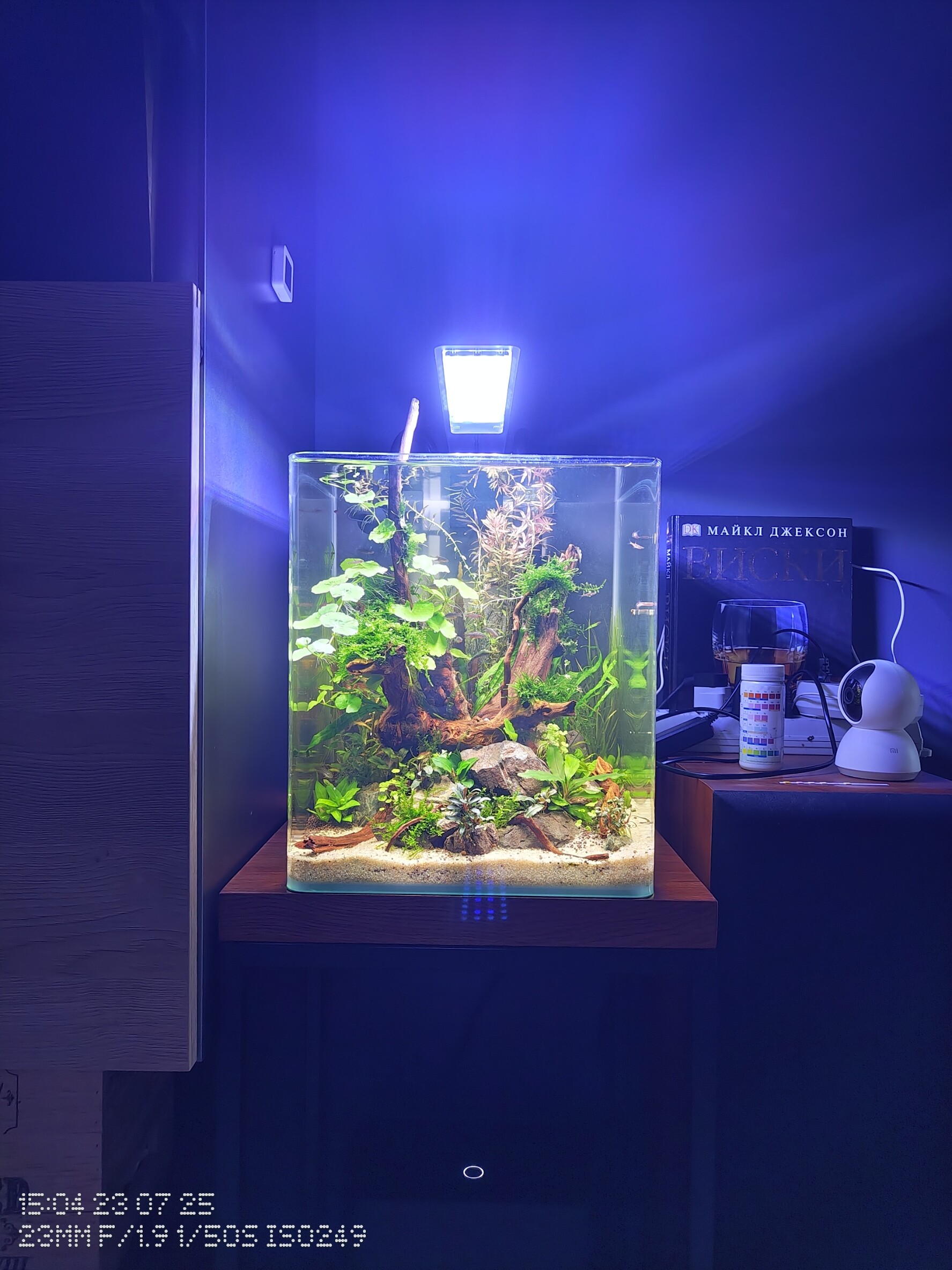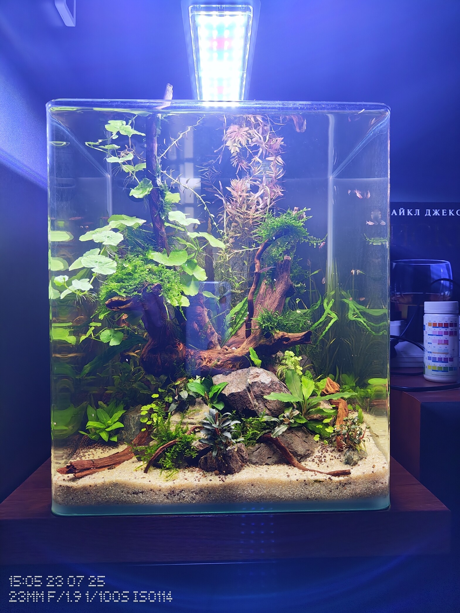 antyloop 37 Жалоба Опубликовано 23 июля День 16/17 В 16 день была небольшая чистка банки от растючки (которой было плохо), добавка длинностебельки Ротала Валлиха (Вьетнам), Ротала Индика и Прозерпинака полюстрис. Некоторые Буцефаландры начали давать побеги, а некоторые наоборот, Анубиасы - ОК, Стаурогин Репенс/Браун - ОК, папоротник Тайландский узколистный - ОК, Криптокарина Браун - ОК, Бликса - 50/50, Мхи растут - ОК, Гигрофила Пиннатифида - ОК, Погостемон Хелфери - откинулся весь . Ну да ладно, это все-таки путь, который надо пройти. Окончательно заполнил банку рыбасами, больше не планирую. Теперь там МикроРасбор Галактик - 20 шт., Расбор Бригиты - 19 шт. (1 покончила собой - выпрыгнула на пол и мумифицировалась), Коридорасов Пигмеев - 6 шт., Карликовых Искрящихся Гурами - 5 шт., креветок Амано (мелких совсем) - 5 шт., Теодоксусы (в пути) - 6 шт. Провел тесты воды с помощью капельных тестов UHE/НИЛПА (тест-полоски), вот результаты/сравнение: PH - 6,6/6,8 KH - 1,5/1 GH - 6/4 NO2 - 0,5/1 NO3 - 3/10 Чему тут верить больше не понятно...))) Сделана подмена воды 10 литров. Продолжаем лить УДО от Aquabalance: Макро + NPK - 0,35 мл ежедневно, МикроБаланс - 0,35 мл через день. Продолжительность светового дня - 8 часов. Как и обещал, фото банки на новом месте (Лофт Консоль, вместо рабочего стола). 4 Василиса, Пятница, AlexLi и 1 человек отреагировали на это Поделиться сообщением Ссылка на сообщение