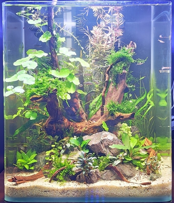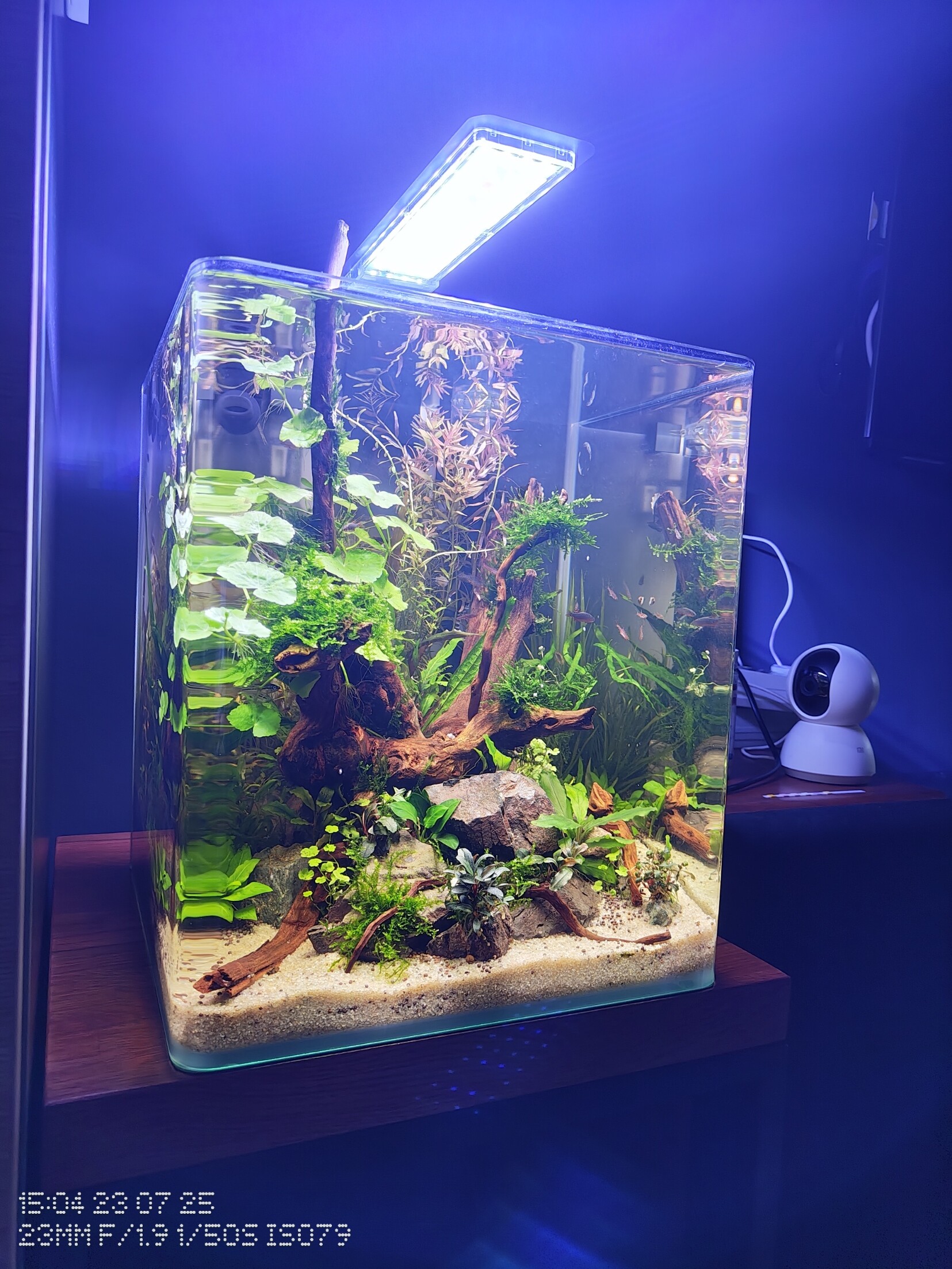 antyloop 37 Жалоба Опубликовано 7 августа Месяц 1 Аквариуму вчера исполнился месяц!!! Продолжаем лить УДО от Aquabalance: Макро + NPK - 0,35 мл ежедневно, МикроБаланс - 0,35 мл через день (сменил на Микро КН- премиум линейка этого-же производителя) . Продолжительность светового дня - 9 часов, с 14:00 до 23:00 (чтобы успеть покормить рыбасов и поглазеть на банку хоть сколько-то после работы). Новая лампа Week Aqua уже вот-вот приедет, но еще пока живем на старой нормально. Все в аквариуме вроде неплохо. Растючка вся более-менее уже устаканилась и потихоньку в рост идет. Стаурогин растет, Бликса которая выжила, тоже уже делится, длинностебелька, которую посадил позже всего отлично чувствует себя, Буцефаландра кидает новые листочки, меристимная оклемалась и тоже пришла в божеский вид. По факту мох я уже местами отщипываю не первый раз, чтобы прирастить на другие части коряги. Мне нравится на данном этапе, что я решил делать медленный скейп, без подачи CO2. Да растет все медленнее, но и внимания уделять можно поменьше. По воде - коряга по прежнему еще красит воду, но уже не так интенсивно, визуально тона на два светлее. Хотя возможно это дает аквариуму некий свой более природный естественный вид, ведь во многих водоемах вода хоть и прозрачная, но не как в бутылке с минералкой ))) Подмена 10 литров раз в 3-4 дня, как совпадет по моим выходным, в которых нет других планов. Показатели такие: PH - 6,8 KH - 1,5 GH - 5 NO2 - 1 NO3 - 10 Что не нравится - есть некие вопросы к фильтру Sun Sun XBL-500. При каждой смене воды приходится его снимать и наполнять водой под завязку из под крана, а то он почему-то не может прогнать воздушную пробку в трубке входа воды. Возможно ему не хватает мощности помпы проглотить воздушный пузырь из-за наполнителя (на холостую пустым он сглатывает все нормально), хотя в целом и эффективность фильтрации и мощность потока меня устраивает. Фотографии не передают (фоткать банку не умею), поэтому ссылка на видео - https://disk.yandex.ru/i/LBxZvEdpuo1ZLA Поделиться сообщением Ссылка на сообщение