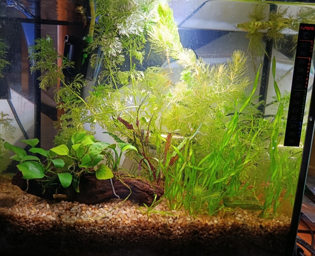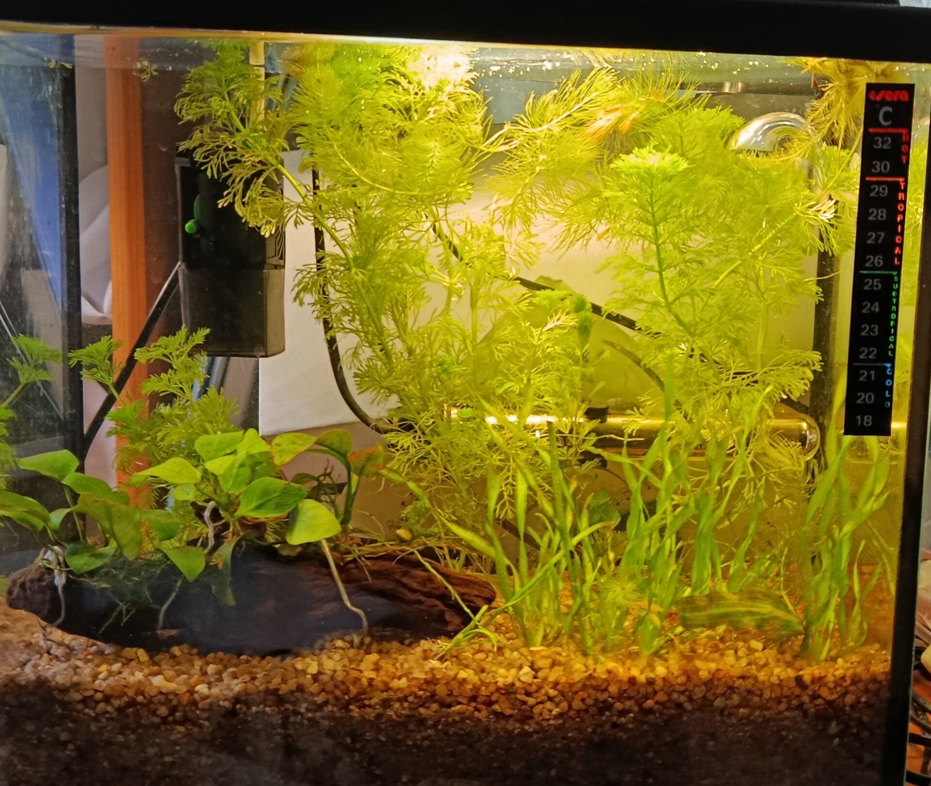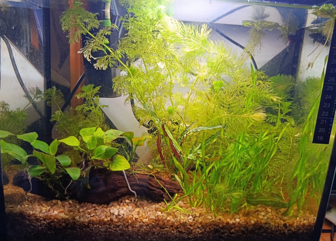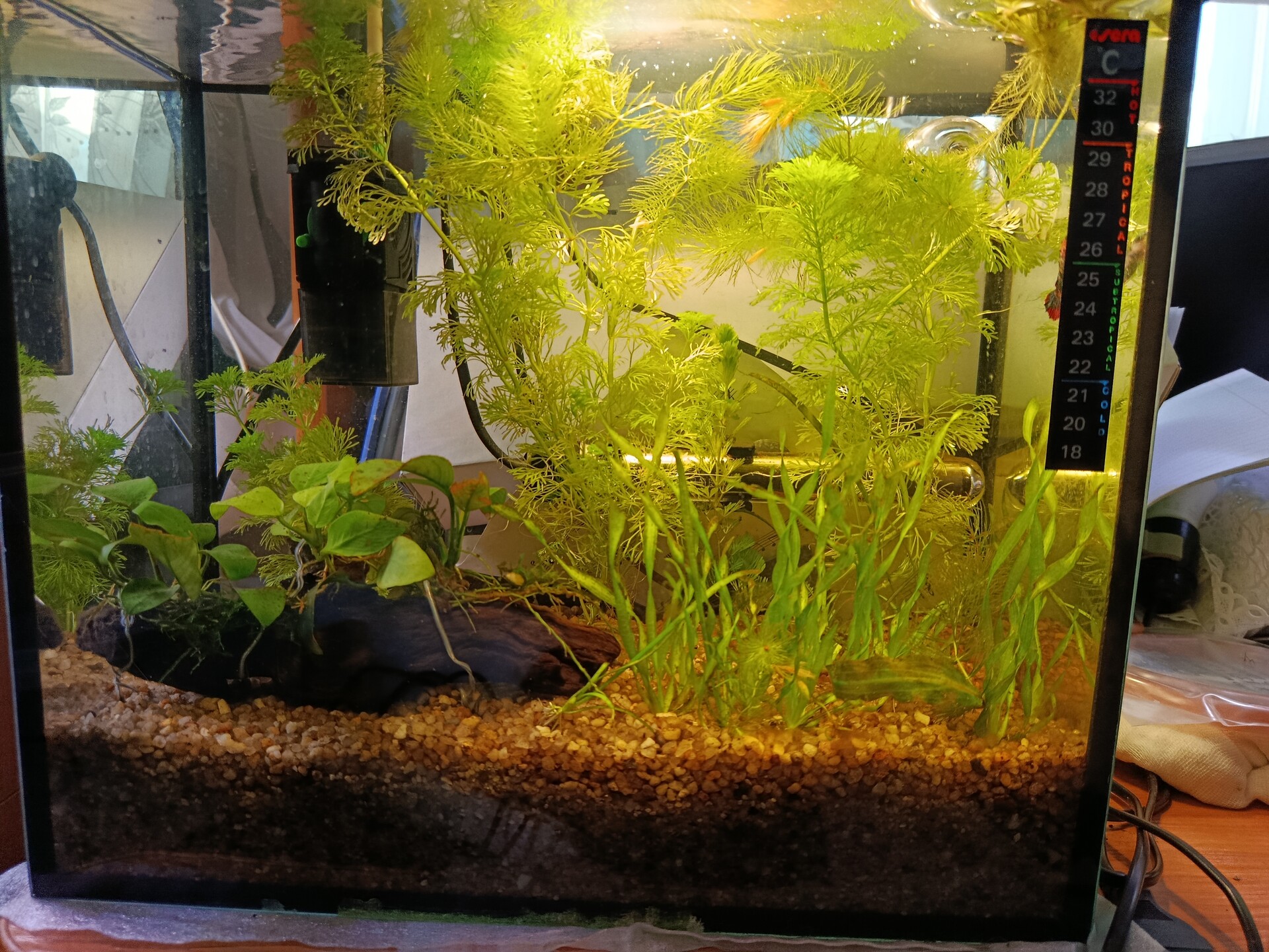 Tmouse 146 Жалоба Опубликовано 11 августа Третий аквариум не перезапускал и надеюсь в ближайшее время не буду, он тоже 30 литров и сейчас там живёт 5 сомиков корридорасов и петушок Хесус Запускал на кварце 0,1-0,2 см, сначала с фильтром акваэль фан микро плюс, но он перестал работать, и я не вытаскивая его поставил тот же же тетровский фильтр с внешней губкой, с тем же светом 6500к и 50лм/л Поставил туда коряжку только с большими анубиасами, сомики лежат на листьях часто, мох там яванский и ещё какой-то, растет очень быстро Сзади там валленсерия, моя любимая лимнофила и рдест Сверху плавает роголистник, который удерживает пистию и лимнобиум, чтобы они не закрывали свет лимнофиле Там не видел нематод, ноо думаю они там есть, должны же были переехать с Хесусом и ампуляриями (я запускал с ними двумя все аквариумы) Из нежданных других гостей на лимнобиуме поселилась тля интересная Фотки: аквариум в начале запуска, аквариум сейчас, сомики, тля, Хесус 1 Камень отреагировали на это Поделиться сообщением Ссылка на сообщение