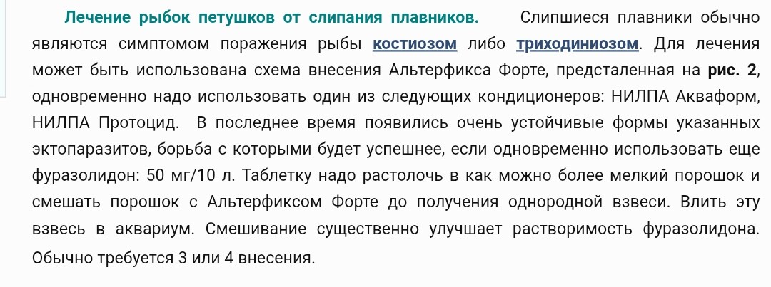 avlamix 5 Жалоба Опубликовано 24 сентября 8 минут назад, Insanna сказал(а): По планам курс формамеда закончу, а вот дальше что делать, если плавники такие и остануться? 3 курс лить через неделю отдыха? Наберитесь терпения. Курс пройдете, неделю отдыха, потом повторите курс. Как только рыбка выздоровеет плавники расправятся. У моего гуппика расправился хвостик и плавники постепенно. сейчас плавает радостный хвостищще веером, за пецилиями ухаживает дурачок ))). И у вашего петушка все восстановится не волнуйтесь. Сыпи нет это уже хорошо. Слипание плавников, как мне сказали - это начальная стадия, Вы вовремя обратили на это внимание - молодец, а вот я по незнанию затянул до последней стадии, когда сыпь появилась, вот рыбки и сдохли. То что 1 гуппёнышь выжил это чудо какое-то остальные все сдохли, а у меня их было 9. Поделиться сообщением Ссылка на сообщение