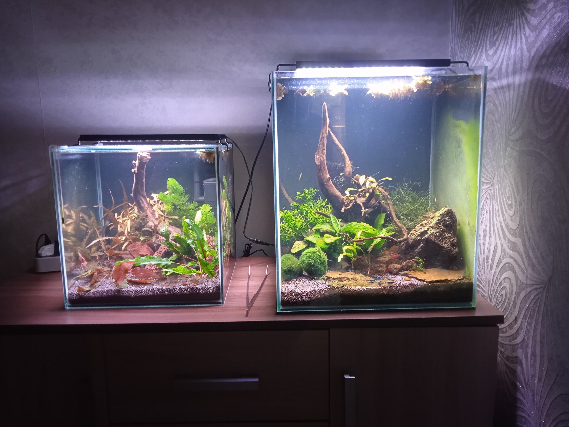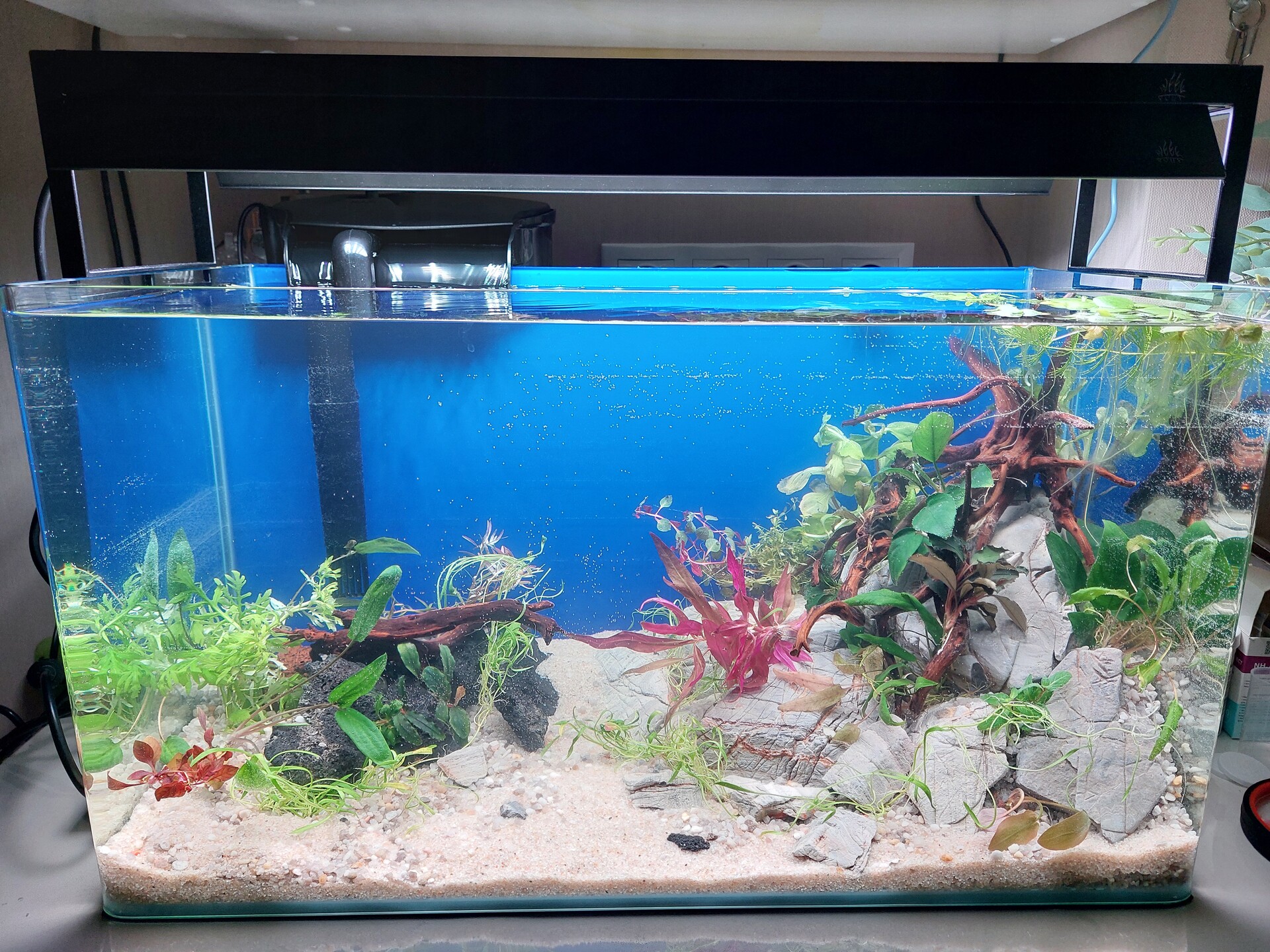 Василиса 191 Жалоба Опубликовано 9 сентября На момент запуска уже были выбраны растения. А так как, я прям чувствую, что феячить так по - полной..то и часть растючек выбрала не совсем простых, соответственно балон с СО2 тоже ждал своего запуска. Растения были высажены, аквариум был залит водой из водопровода с показателями pH 7.5 KH 8 GH8, в аквариуме был хорошо прополоскан синтепончик из 20 литрового аквариума (был оочень грязнющий, прям само то ), так же были добавлены бактерии для запуска, а через несколько денечков прополоскала в аквариуме еще и внутренний фильтр из 20 литрового аквариума. Свет был установлен в первую неделю на 5 часов 55% . Вся эта работа от композиции до полной высадки растений заняла времени с 10 утра до 19 вечера. На следующий день был подключен СО2. В течение дня мониторила показатели KH и pH воды, чтобы определить концентрацию газа в воде. Фото, когда только залила в аквариум воду. Через 3 дня приехала вторая порция растенийКомпозиция чуть изменилась, пришлось убрать вторую коряжку с черной лавы, чет места маловато было. На вторую неделю жизни аквариума увеличила свет на час, теперь светит 6 часов , так же установила ступенчатое освещение первый час 55 % и последний час 55%, посредине 75%. Аквариум был запущен 30 августа, через неделю появились первые жильцы первопроходцы 5 шт коридорасов Штерба Фото аквариума сегодня, ему 11 дней На верхней коряжке прижато нержавейкой Монте-карло..оочень надеюсь, что из него получится пышная крона для дерева. В день подключения СО2, также внесла макро удобрения пропорция 10/1, микро по инструкции и железо (пока не по инструкции). С 8 дня начала делать ежедневные подмены 10% . Ну , а так как я начала сразу же вносить удобрения, плюс позже живность добавилась, то конечно активный мониторинг азотистых. 5 Пятница, shkush, Grolf и 2 люди отреагировали на это Поделиться сообщением Ссылка на сообщение
