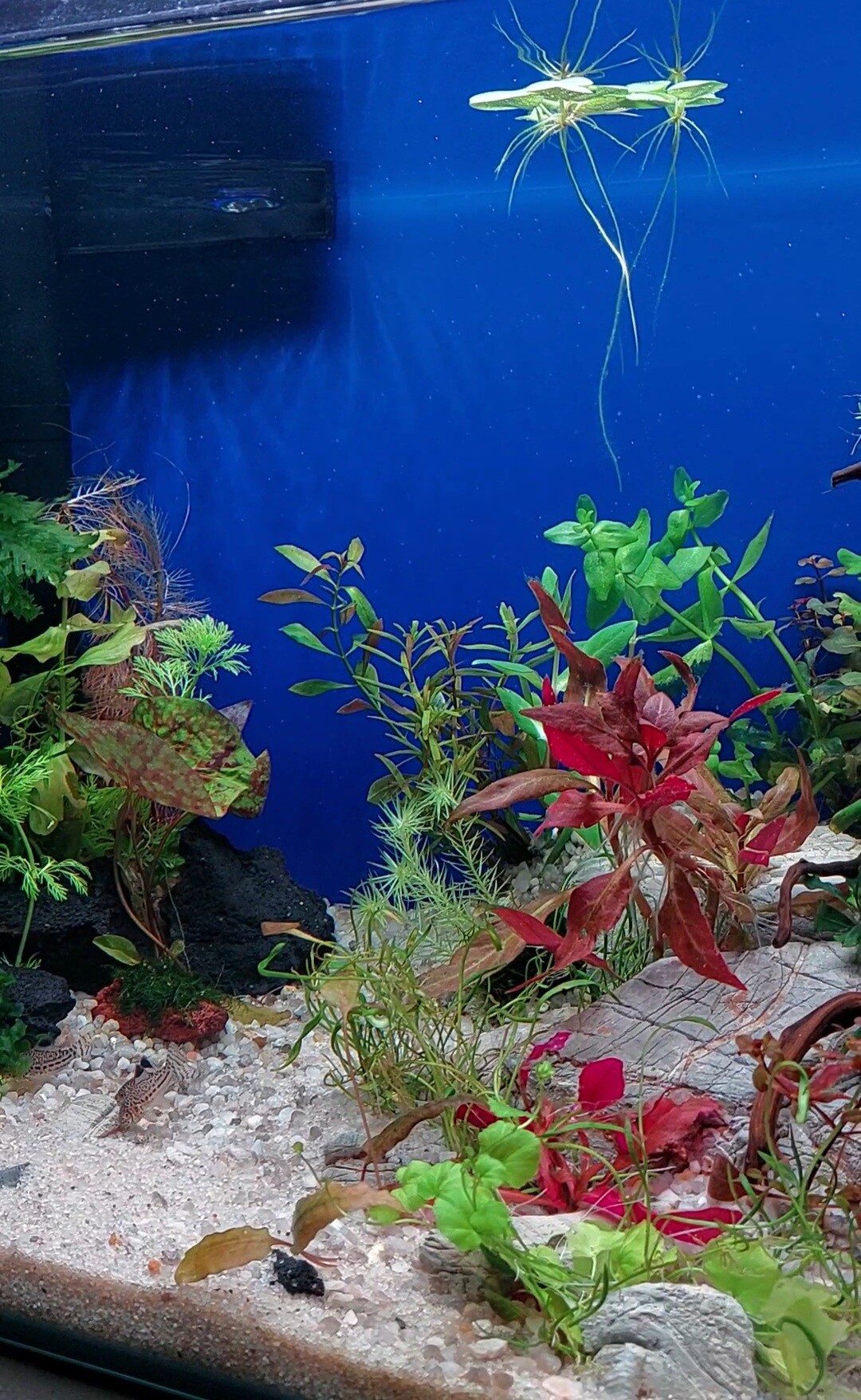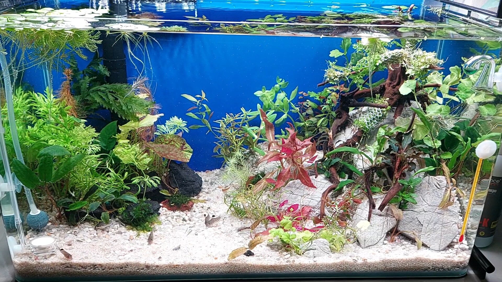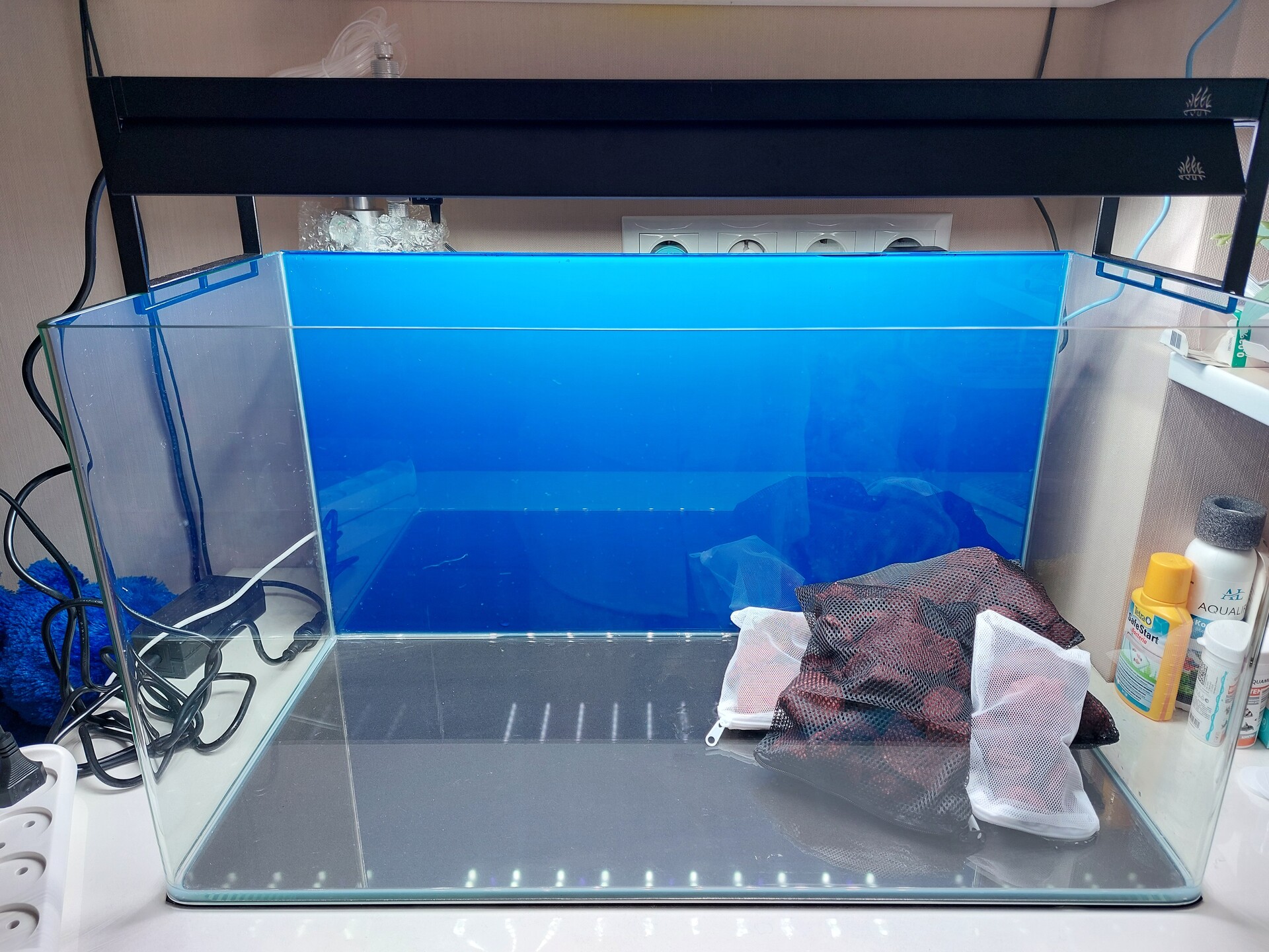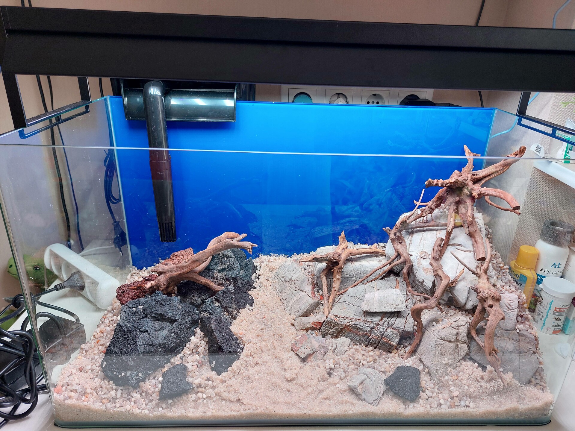 Василиса 191 Жалоба Опубликовано 9 сентября Новый аквариум, новая темка Ну что ж, дождалась я все комплектующие, особенно долго ехал светильник, 1,5 месяца ждала. В голове рисовалась картинка, как всё будет выглядеть, по итогу чуть что-то изменилось, добавилось/убралось, но главное, мне нравится Прошу строго не судить, делала, конечно, всё более осознанно, чем в первый раз, но было страаашно и интересно одномоментно . Аквариум Прайм 59 длина 60см/ высота 33 см/ ширина 30 см. Был выбран синий фон, и началась стройка композиции Грунт : кварц фракция 2-5 мм, кварцевый песок фракция 0,6-1,2 мм. Камни : слоновья кожа и черная лава, для формирования холма под камнями использована вулканическая лава фракция 3-6 мм (уложена в мешки сетки, с пластмассовыми замками), коряги - это корни Азалии (предварительно прокипяченные 2 часа в кастрюле) 5 Камень, Nevidimka, Пятница и 2 люди отреагировали на это Поделиться сообщением Ссылка на сообщение