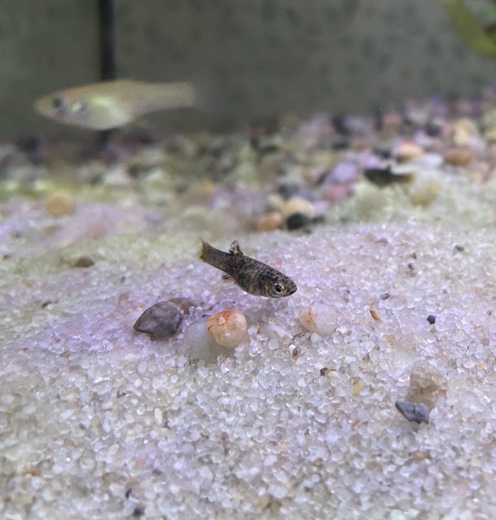 yaksenya 25 Жалоба Опубликовано 7 декабря, 2025 не подумала про фото, выкинула их в 30ку с кустами, теперь наблюдаю их по очереди по 3-4штуки) им пара недель, "рост" с хвостами от 1,5 до 2см примерно есть пара вот таких серых, возможно это они вырождаются, а может у мальков специально такой окрас, так как они самые незаметные, думаю через месяц будет понятно)) беленький на фоне самый крупный из всех 2 Поделиться сообщением Ссылка на сообщение