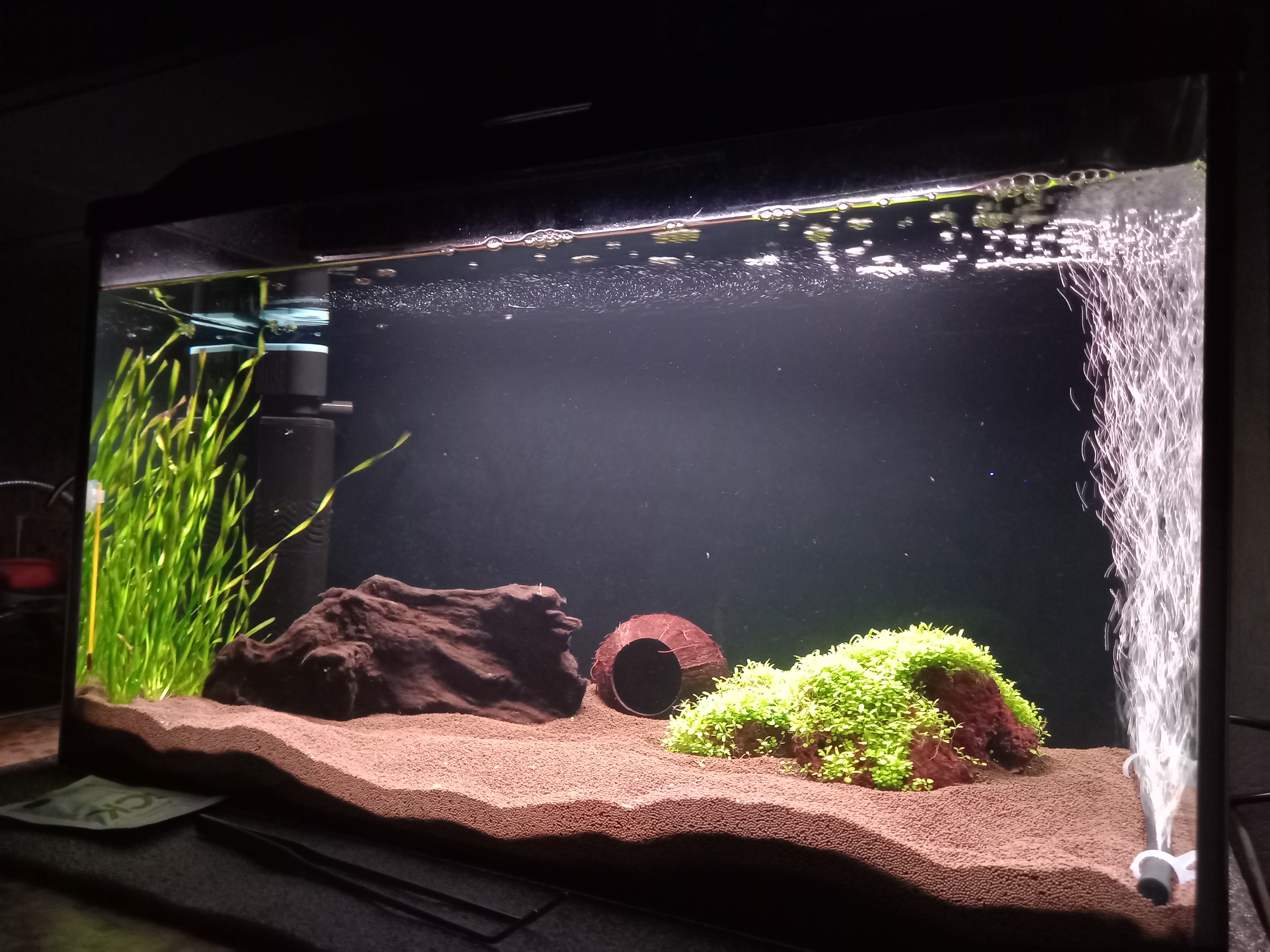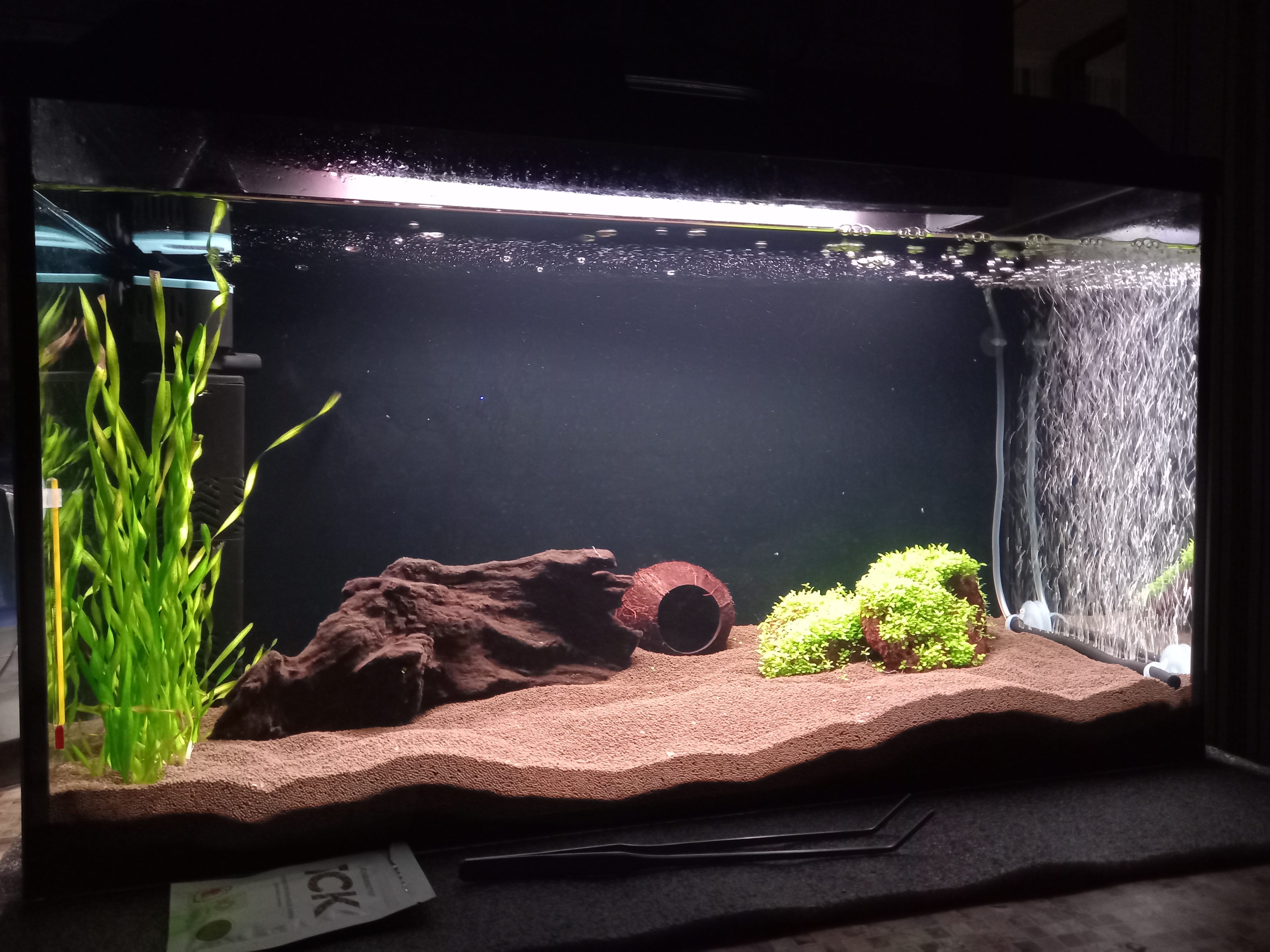Kriss 2 Жалоба Опубликовано 27 октября Перед запуском аквариума несколько месяце собирала информацию о том, как правильно запустить аквариум. Думала, что все поняла, а оказалось вопросов еще осталось много. Что мы имеем. Аквариум 100 литров, 75*32*43, воды 85 литров примерно. Фильтр Laguna LS 1003F 880 л/ч. Компрессор 4 вт, освещение штатное сменила на светодиодную лампу для аквариума 52 см 18 вт 1650 lm. Грунт пропант 1.2-2 мм 4-7 см. Нагревателя пока нет, планируется Aquael platinium heater 100 или 150 вт. В грунт, где предполагаются растения удобрения НИЛПА Микротабс. Запущен 5 октября, т.е. 3 недели назад. Промыла/засыпала грунт, залила воды из-под крана с Tetra aqua sefe, посадила валлиснерию (поторопилась купить), фильтр, аэрация постоянно, в первый день 1 ампула BioDigest prodibio и 1 ампула на 15 день. Через пару дней добавила корягу (которую долго вымачивала и варила) и лаву с пророщенными растениями. Незначительное помутнения было день на 5-ый, через 1.5 недели вода прозрачная. Тестов не было, не меряла. Вчера сделала тесты НИЛПА капельные: T - 23-24 Ph-7.0 аммиак/аммоний - 0 общая жесткость - 13 карбонатная жесткость - 6 нитрит - 0 нитрат - 5 фосфат - 0 CO2 - 2,5 Планируется посадка не прихотливых растений за корягой и камнями на следующей неделе (лювигия, криптокарины, папоротник тайландский). Пока не решалась, т.к. валлиснерия чувствовала себя не очень. Пару кустиков совсем пожелтели, удалила. Сейчас новые росточки уже появляются. Прочитала, что для начала азотного цикла нужны или первопроходцы (жалко), или сыпануть корма. Я насыпала только 3 дня назад. Так вот вопросы: Был ли азотный цикл без рыб? Вспышки водорослей не было, только на коряге едва заметный белый налет. Странно, что нет фосфатов, аммиака и нитритов. Нужно ли делать подмены без рыб? Можно ли на такой объем и фильтр: 1 сом платидорас, 2 наннокары неоновые и стайку 6-8 барбусов суматранских? Хотела креветок амано, но с таким населением они не выживут, думаю. Не понимаю своих дальнейших действий. Сажать все таки остальные растения? Делать тесты и чего то ждать? Или потихоньку после посадки растений рыбасиков запускать? Извиняюсь за длинный текст. Хотелось написать максимально подробно. Очень жду советов от опытных людей. Страшно загубить рыб. Ну и вид аквариума сейчас. 2 AlexLi и Grolf отреагировали на это Поделиться сообщением Ссылка на сообщение